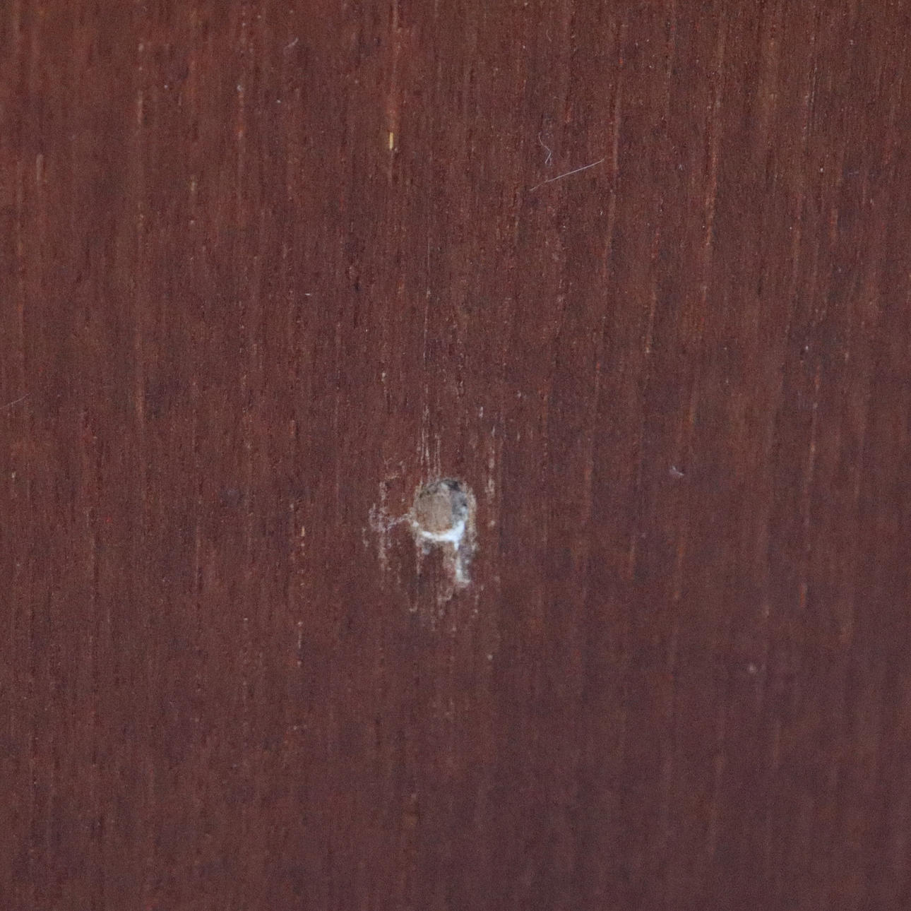 Usage and age-related wear. Marks, stains and chafing. A veneer damage to a cabinet door.