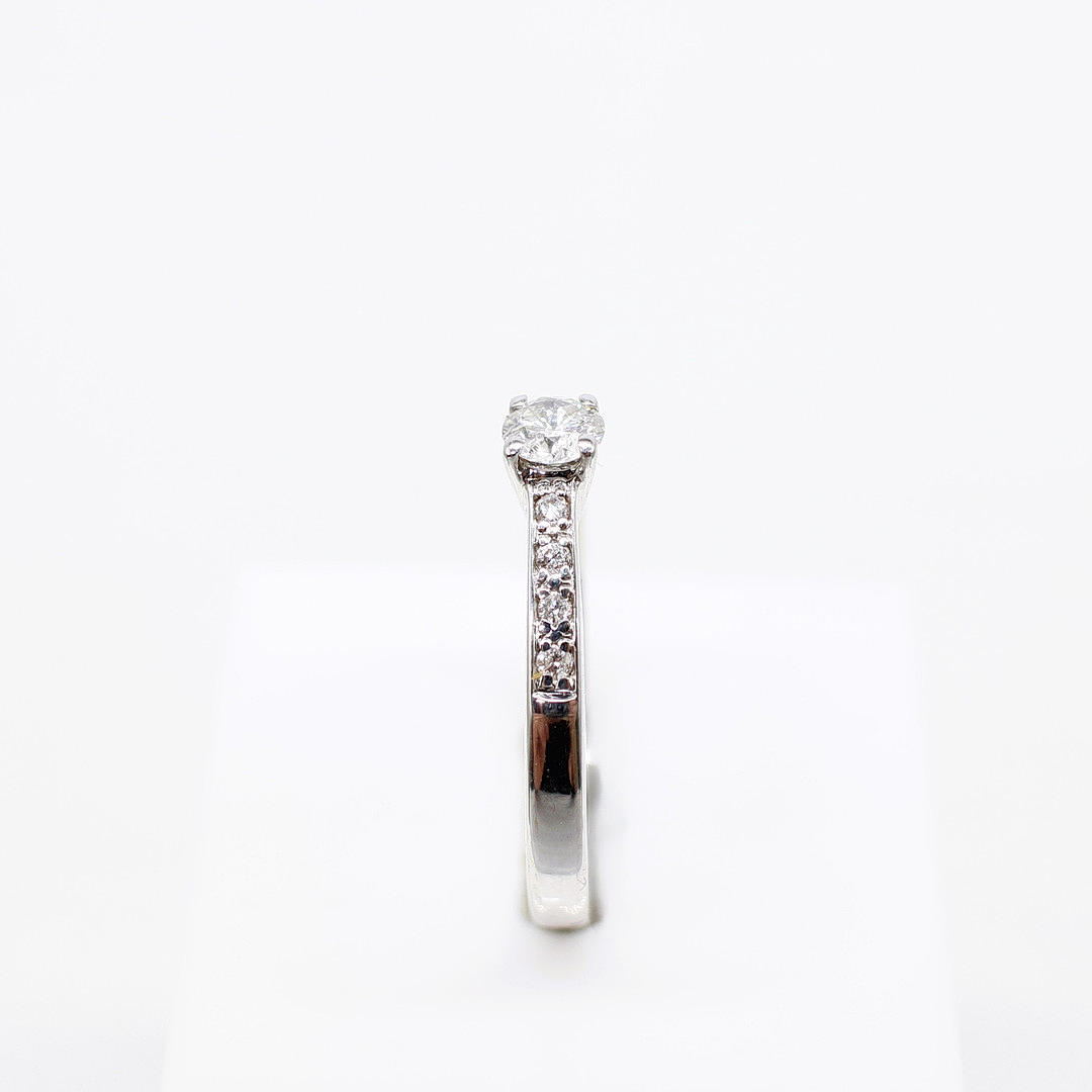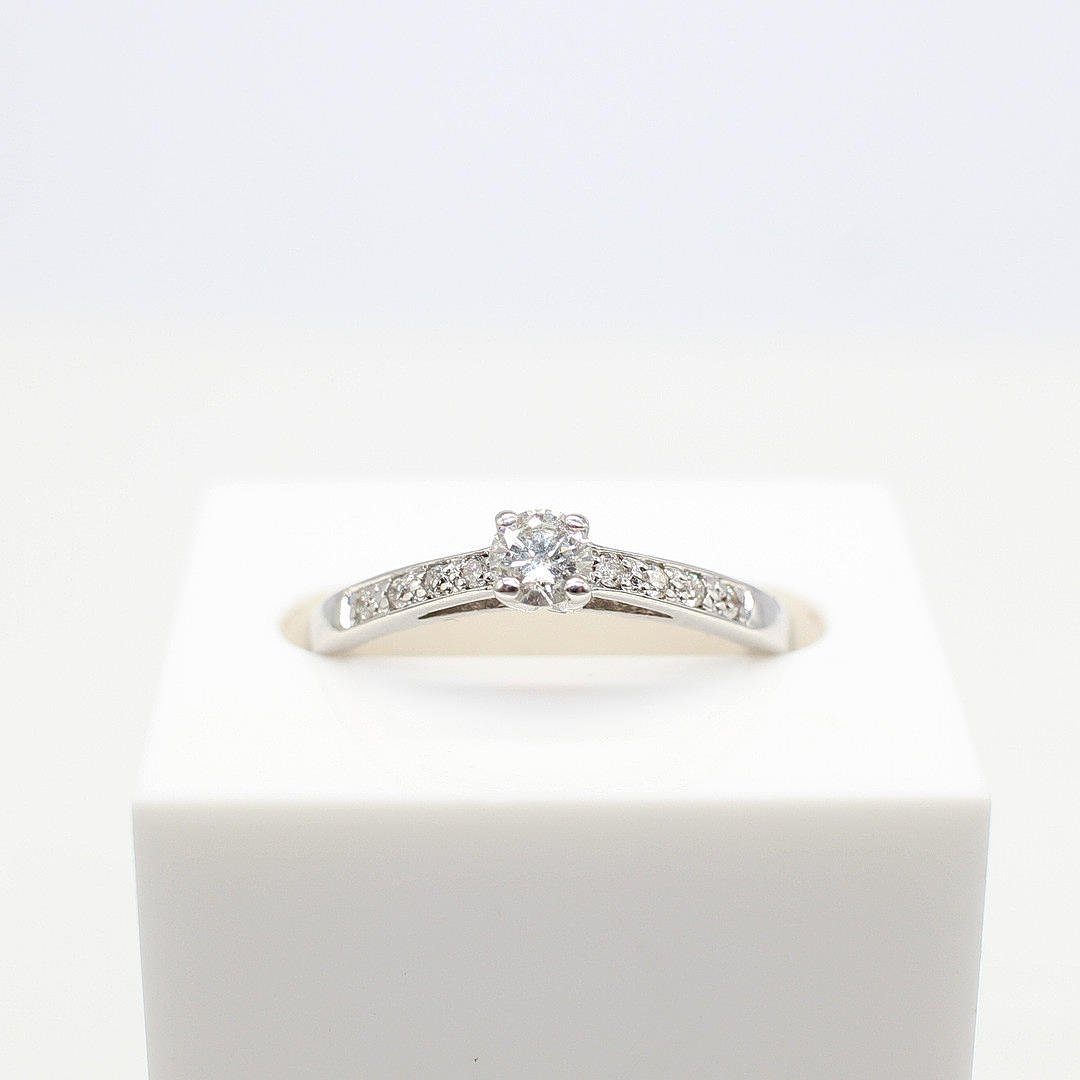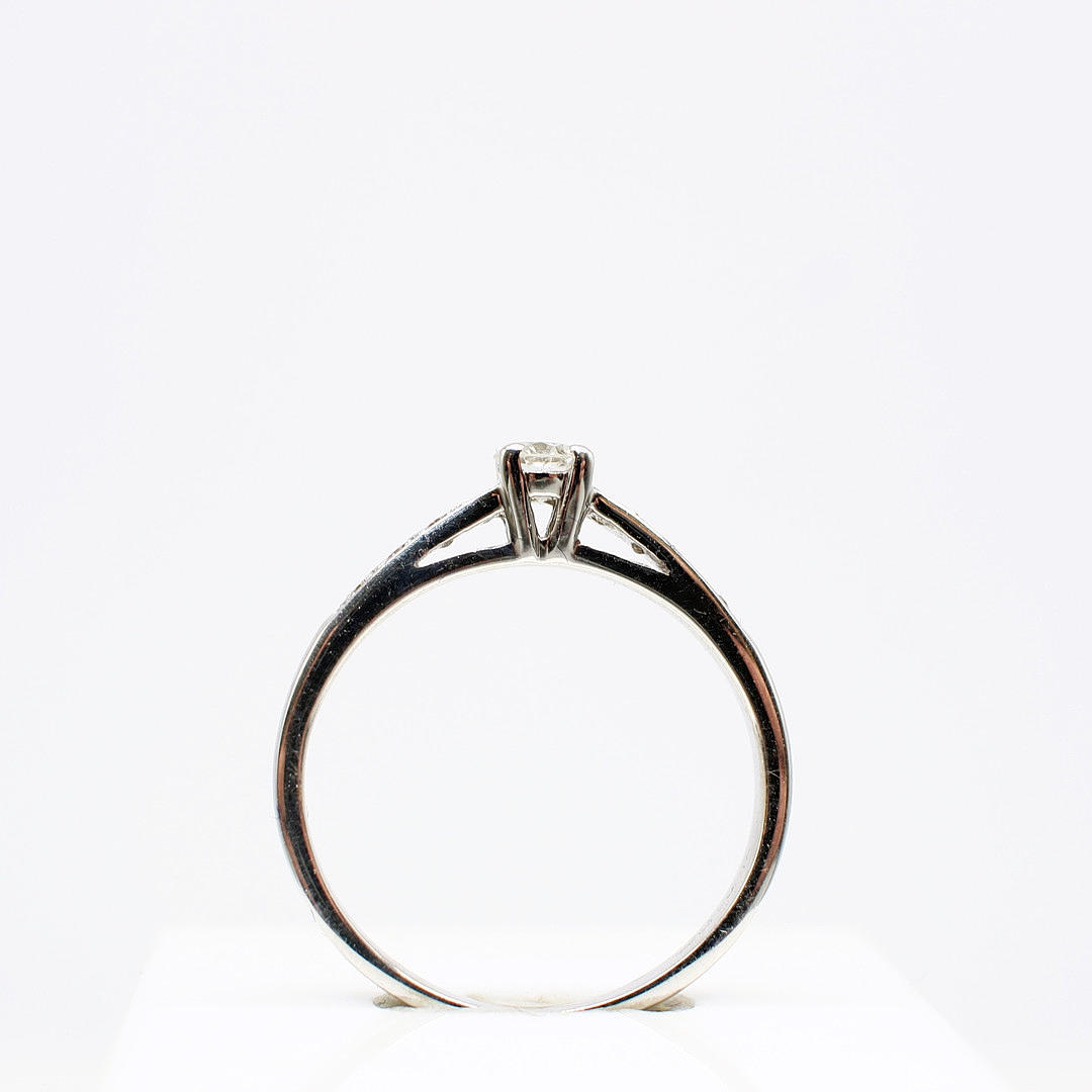 A Pretty 18ct White Gold (Hallmarked) Diamond Solitaire Ring With Diamond Set Shoulders.