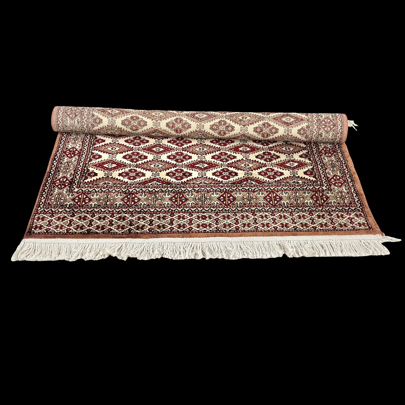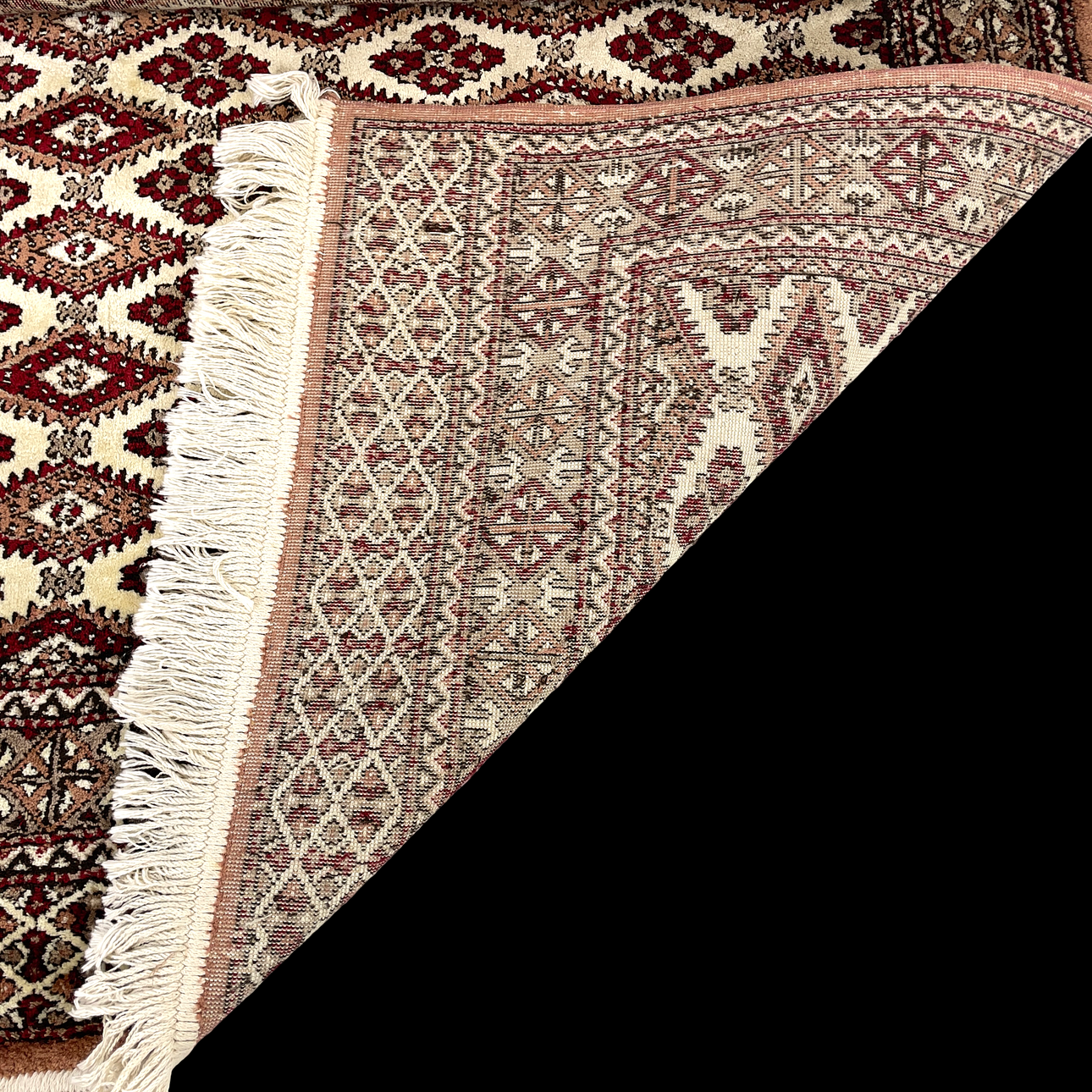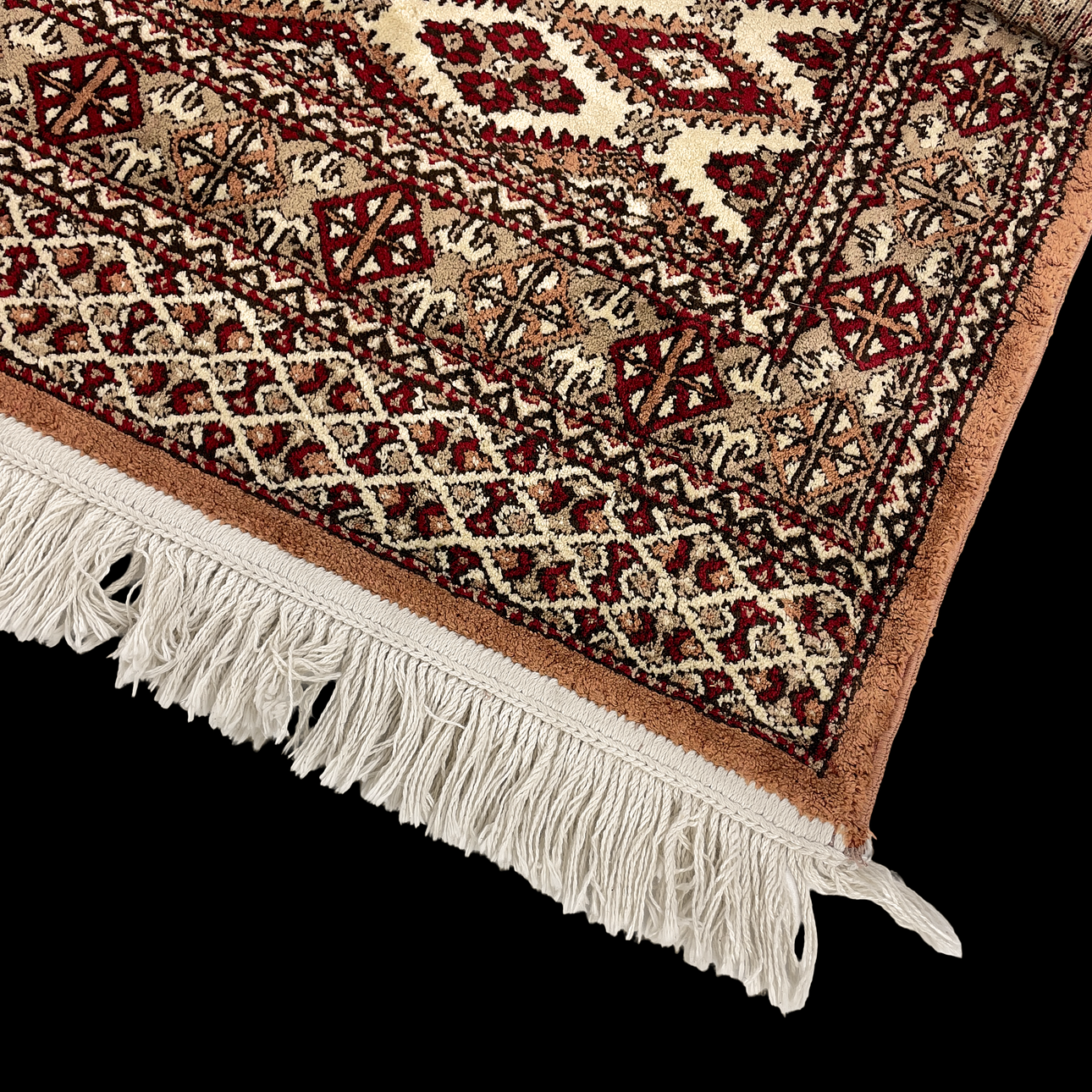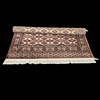 Viscose, machine-woven. Geometric pattern in red and brown against a light background. Labelled "Hereke".