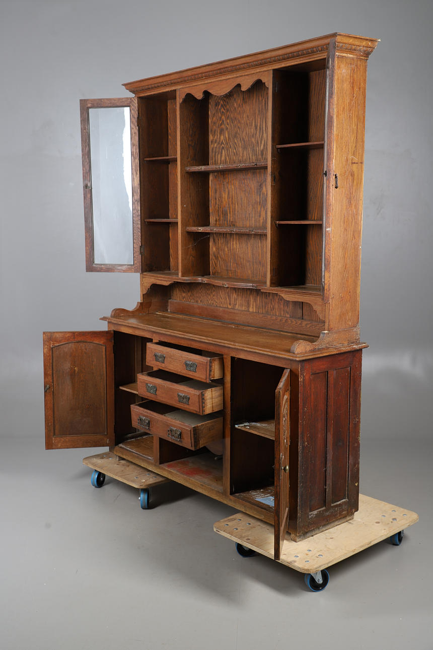 some chips and old worm holes around the cornice, some handles missing, some small holes on each side, general wear and marks over time, has been in a farmhouse and needs a good sort out and clean.
