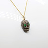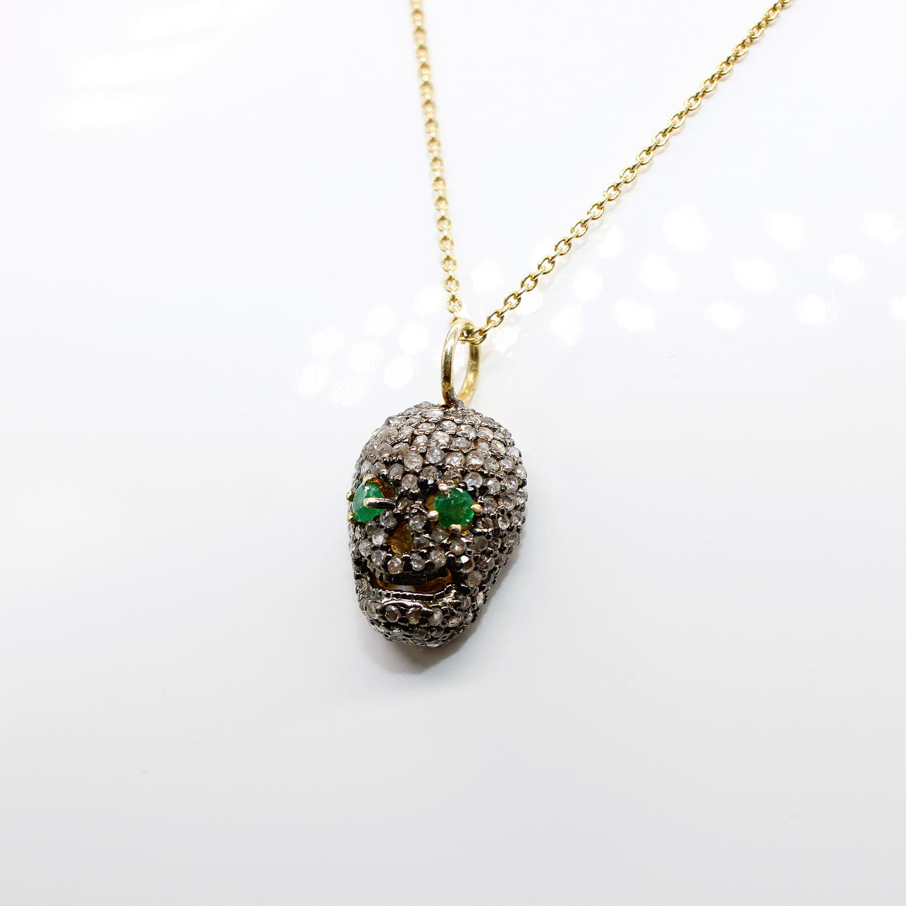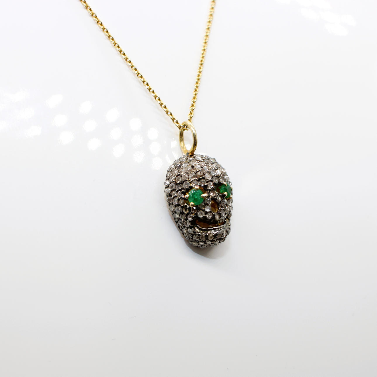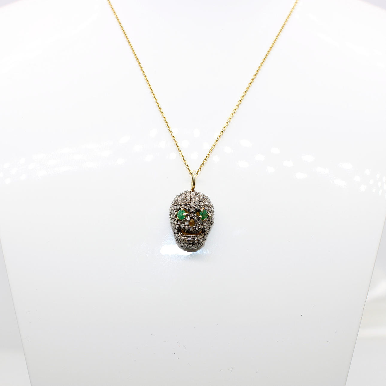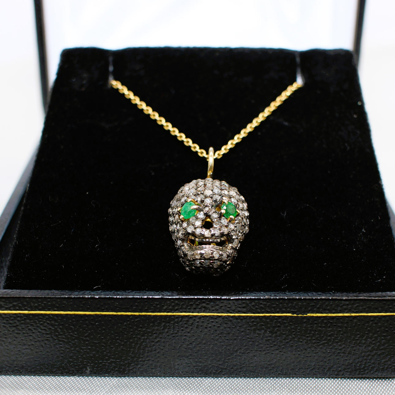 A Diamond Set Skull Pendant With Emerald Eyes In White And Yellow Metal, Stamped 925 And Hung On A Yellow Gold Plated Chain.