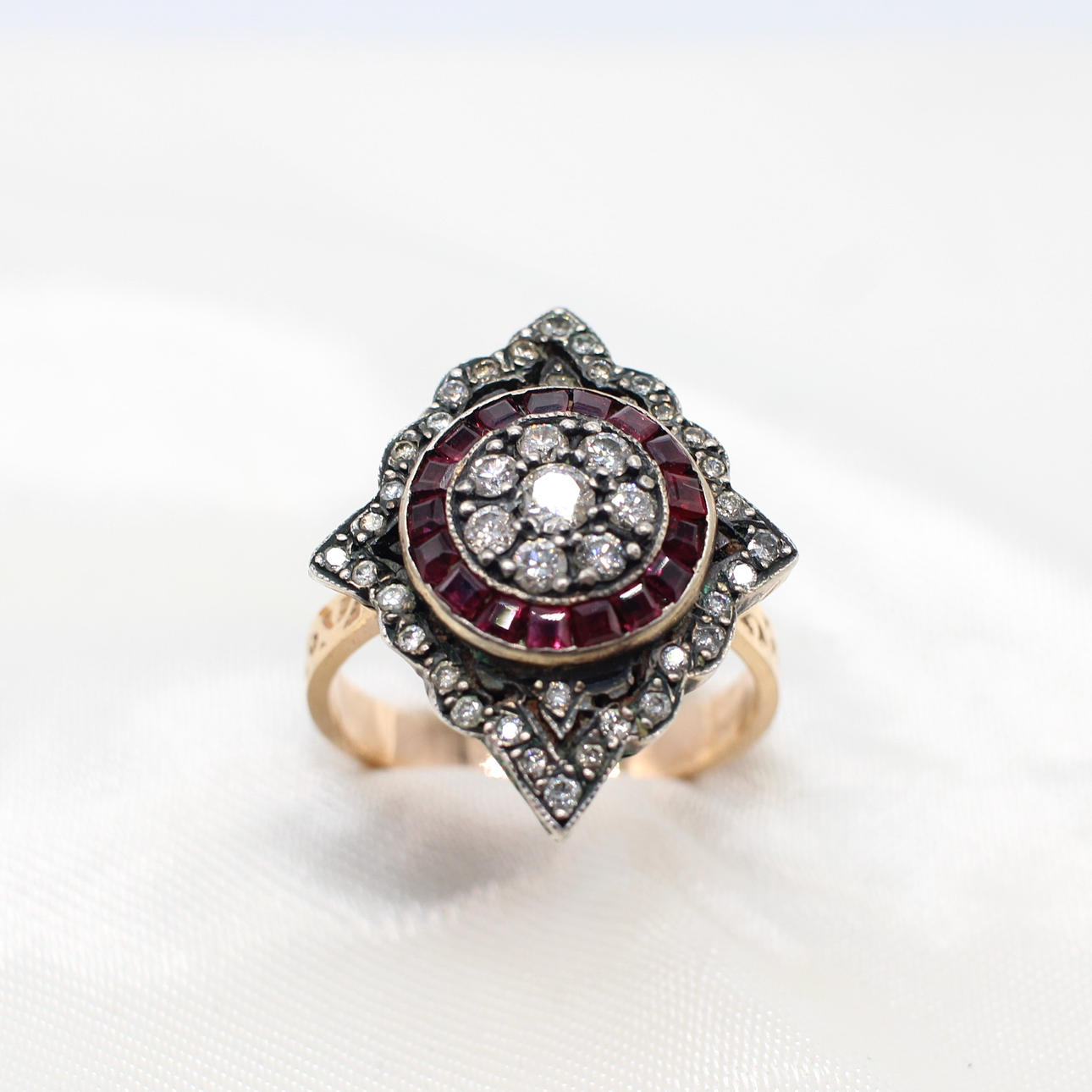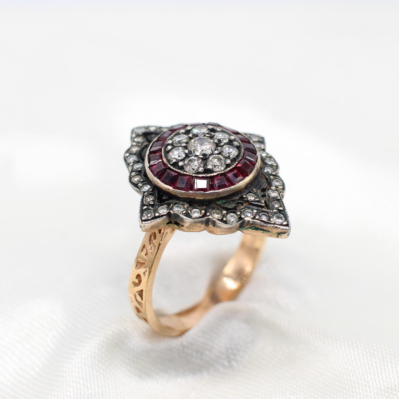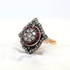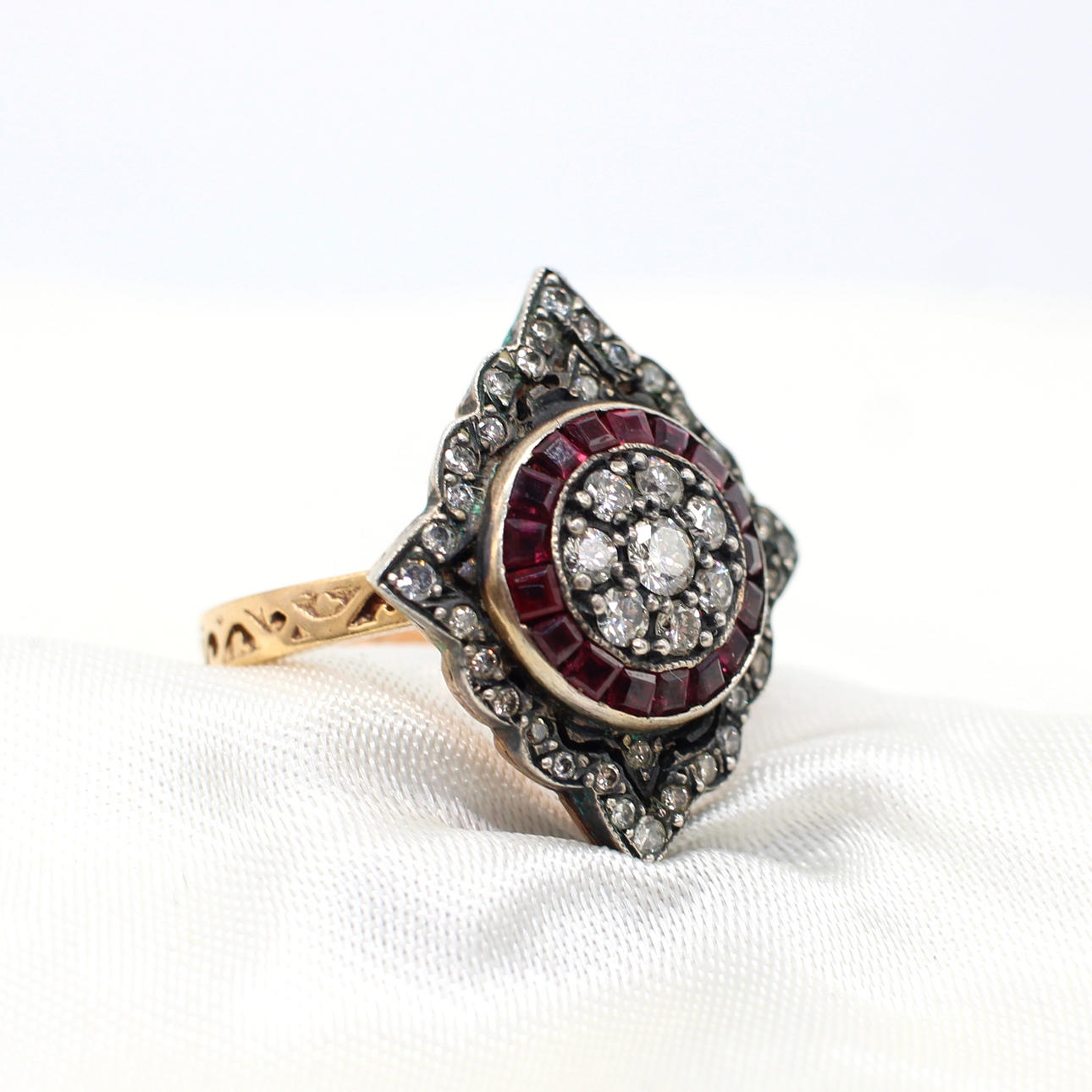 A ottoman inspired unhallmarked rose gold (tested as 8k) marquise shaped ring set with round brilliant cut diamonds and calibre cut rubies.