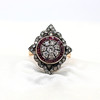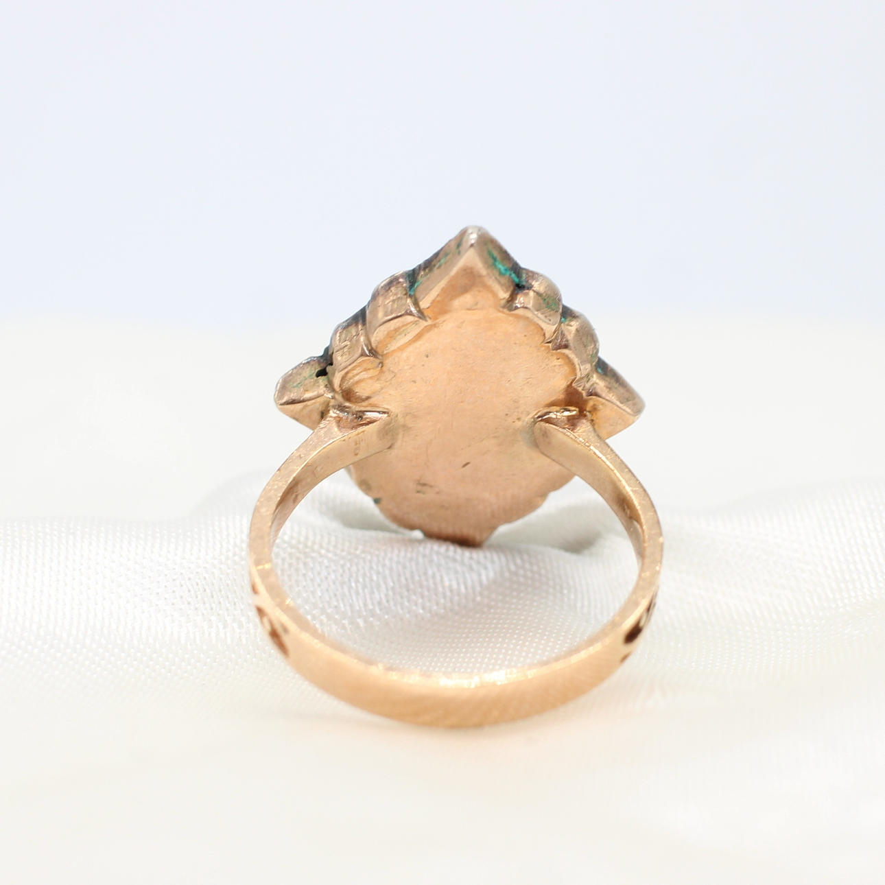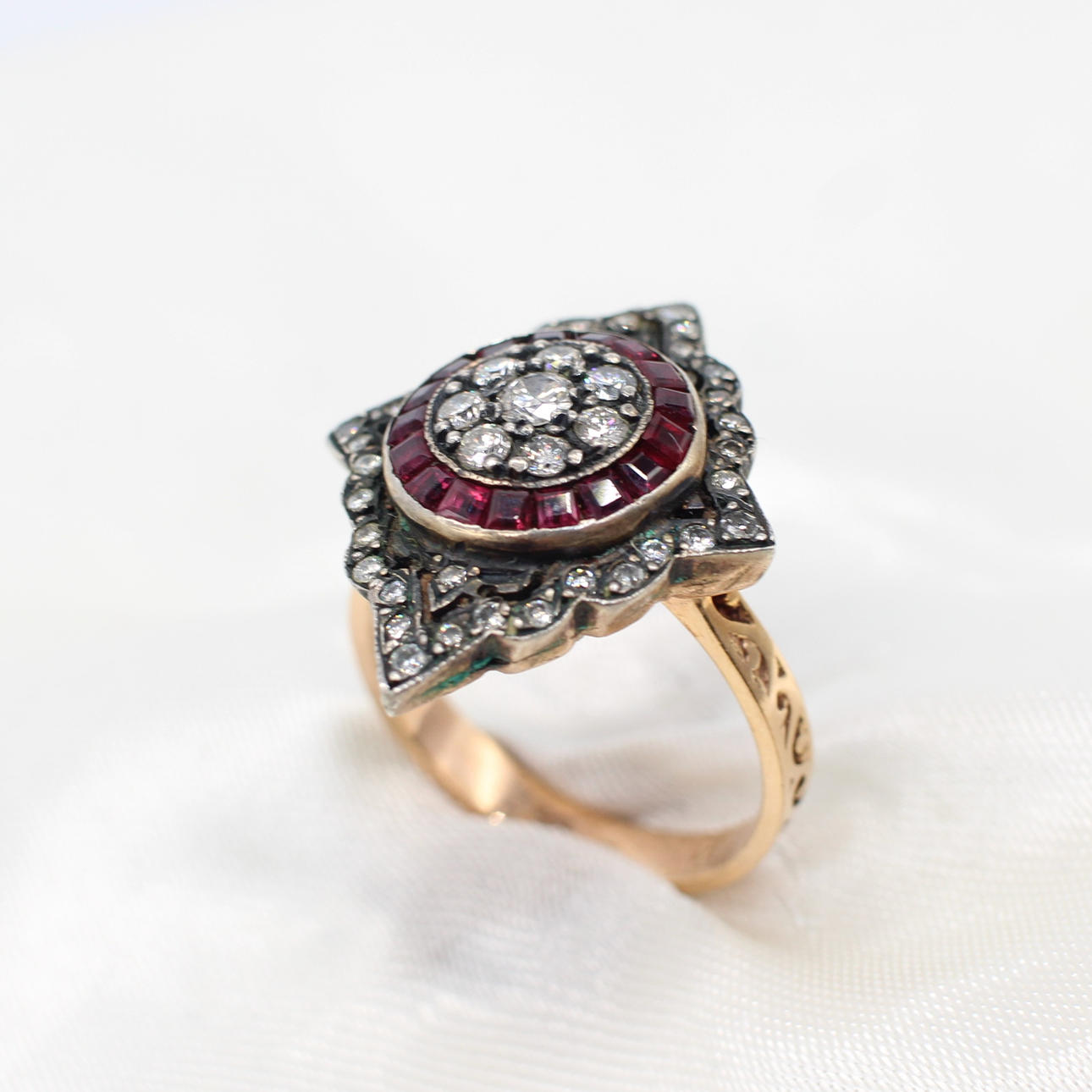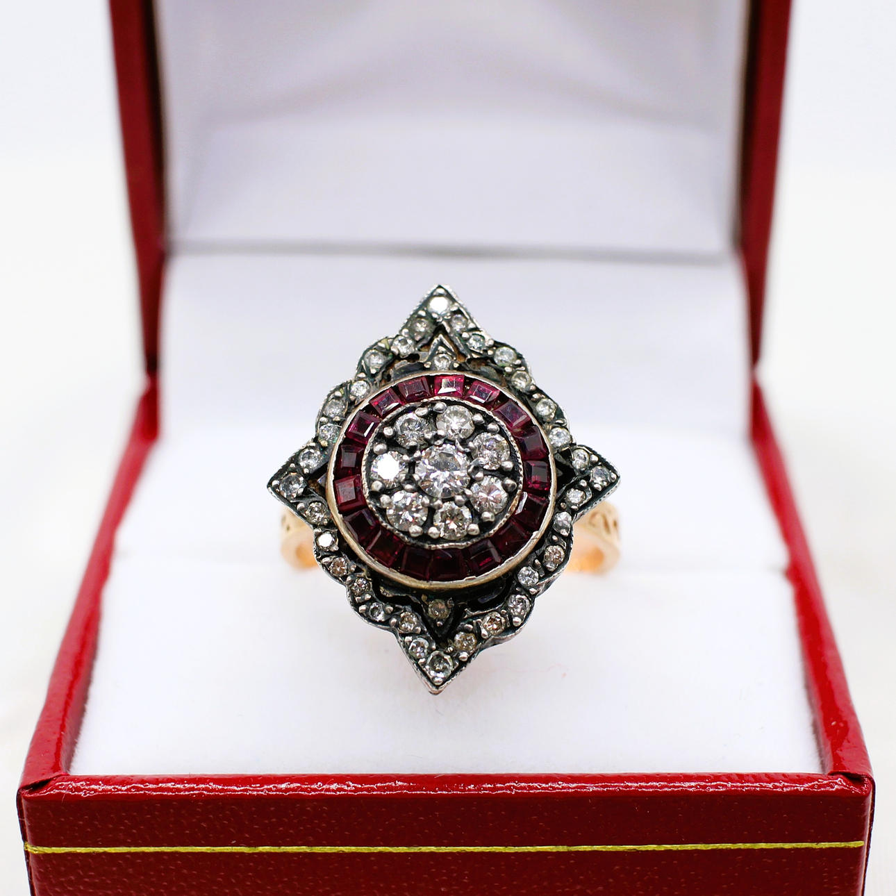 A ottoman inspired unhallmarked rose gold (tested as 8k) marquise shaped ring set with round brilliant cut diamonds and calibre cut rubies.