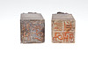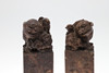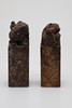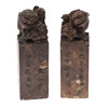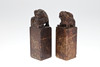 A pair of rectangular shaped seals, mounted with buddhist lions and with character marks on one side. With further character marks to the base. 18cms high.