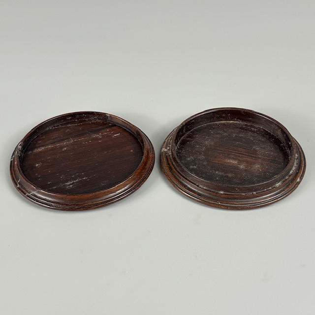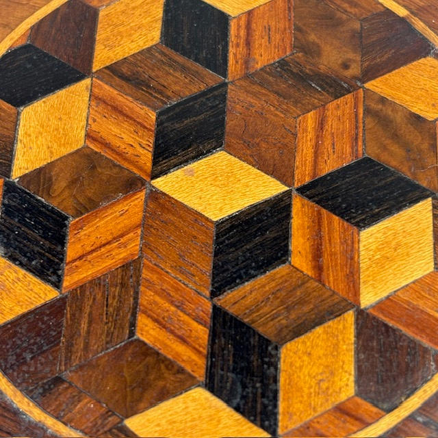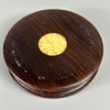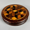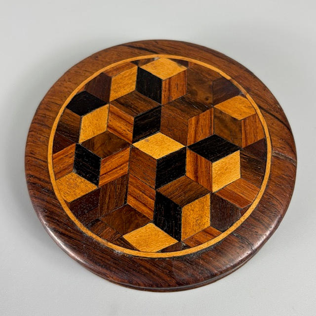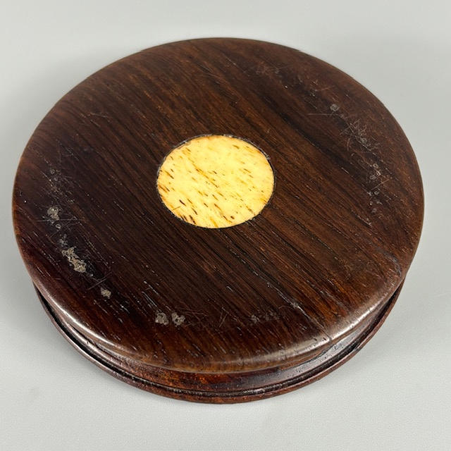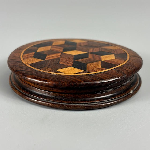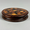 19th century wooden round patch box with geometric design marquetry work top, approximately 8cm diameter.