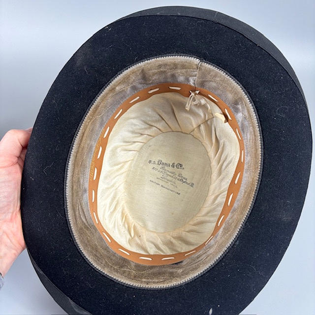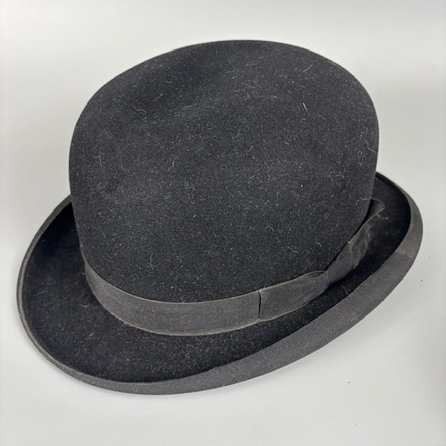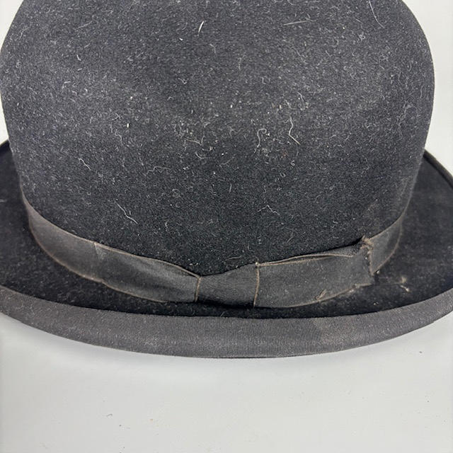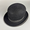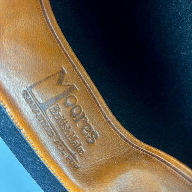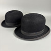 Two black bowler hats, one Dunn & Co, approximately 16.5cm across, the other Moores British made approximately 16cm across.