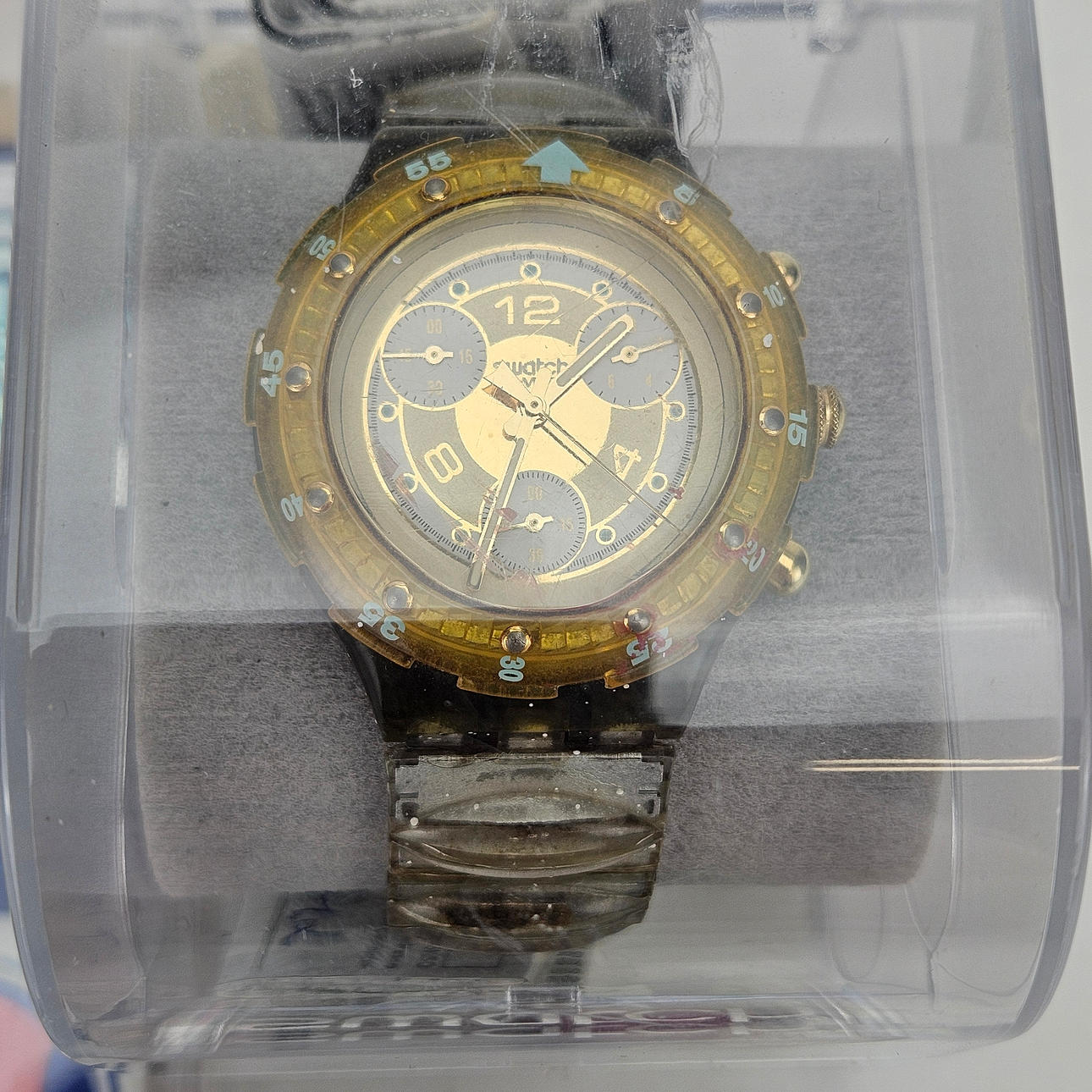 A watch with stains, a watch with damage to bracelets.