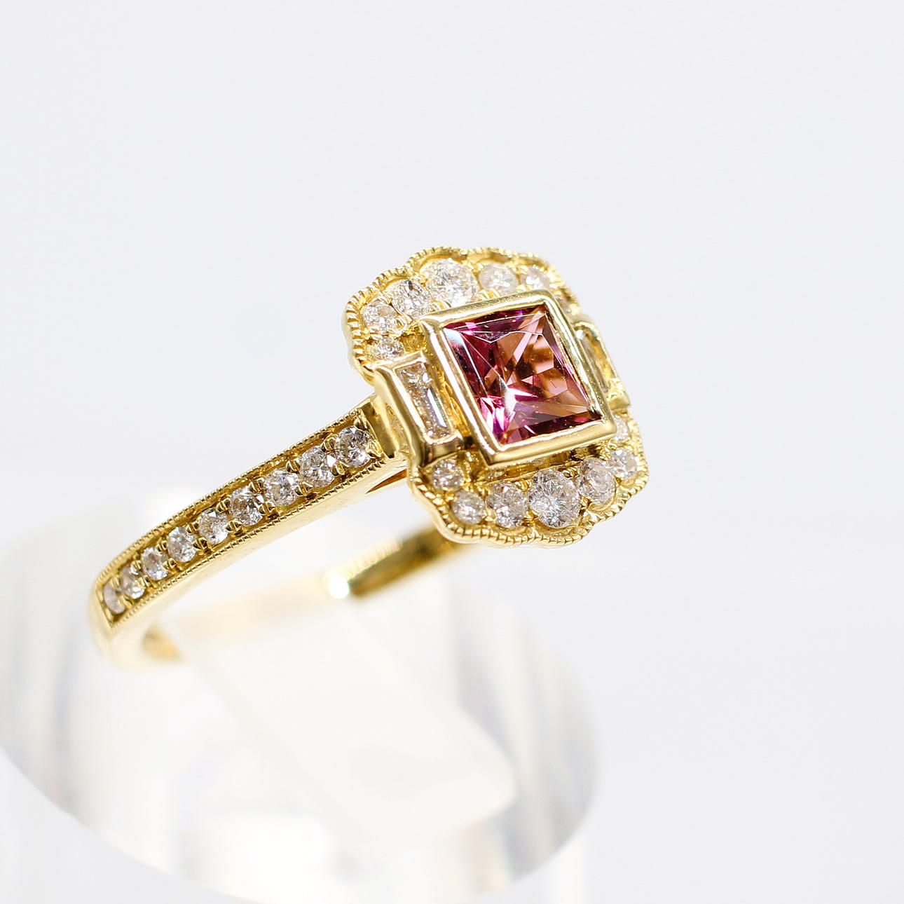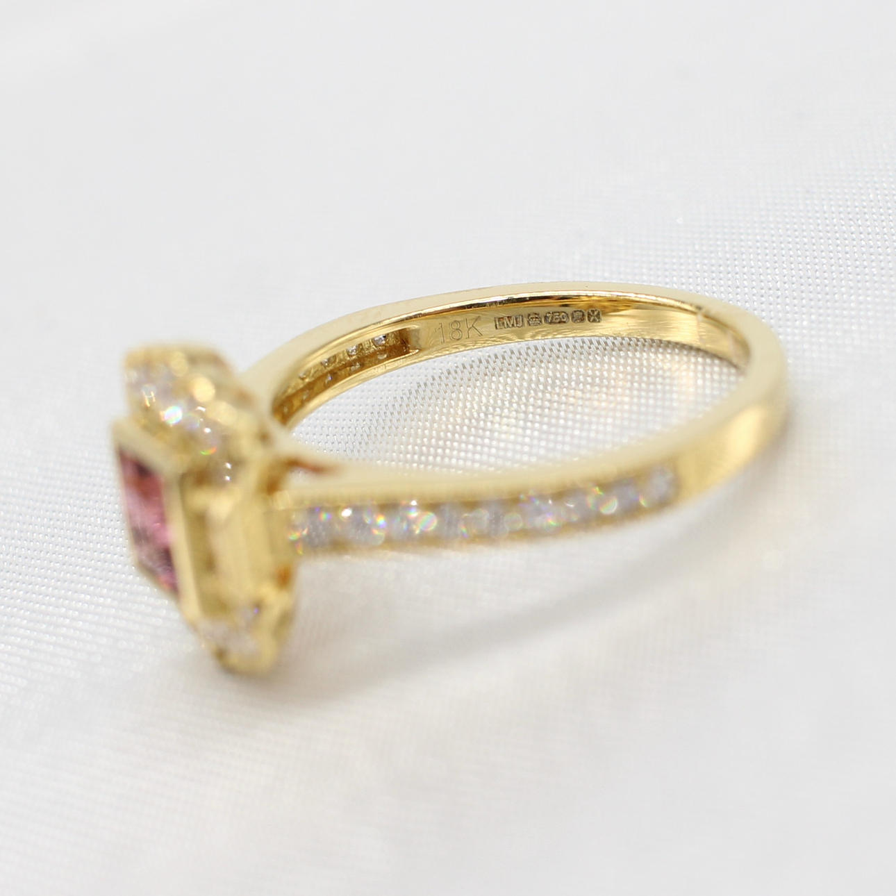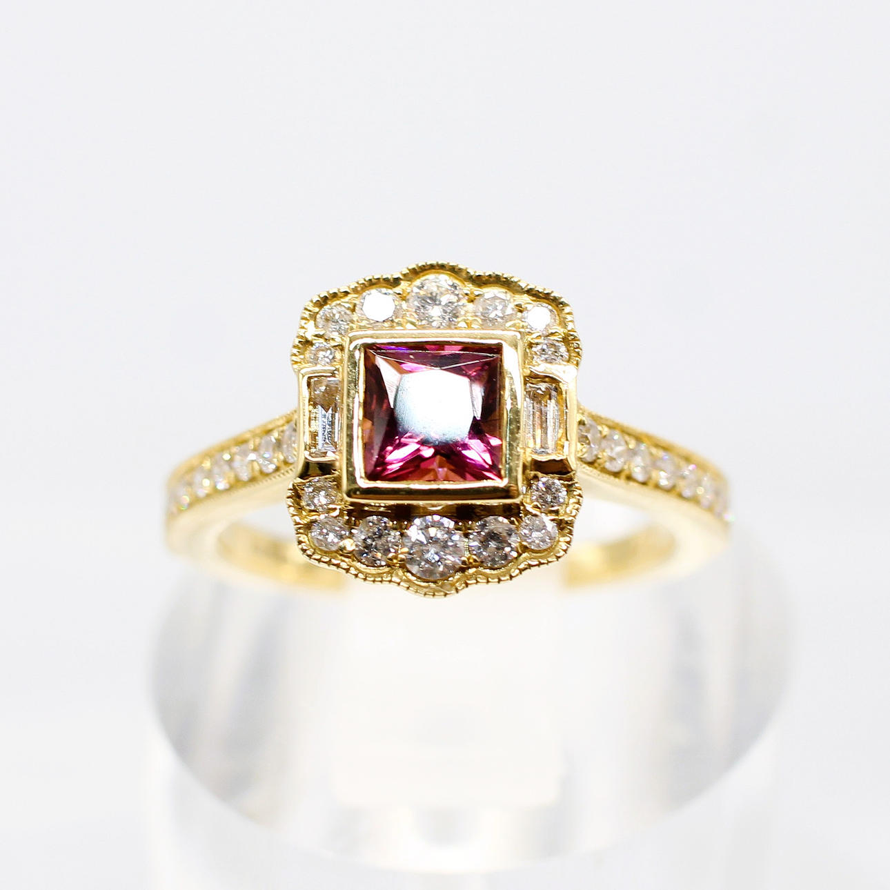 A Uniquely Stylish 18K, Hallmarked, Yellow Gold Ring Set With A Square Pink Topaz And Round Brilliant Cut Diamonds
