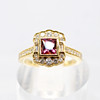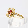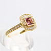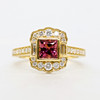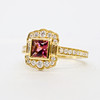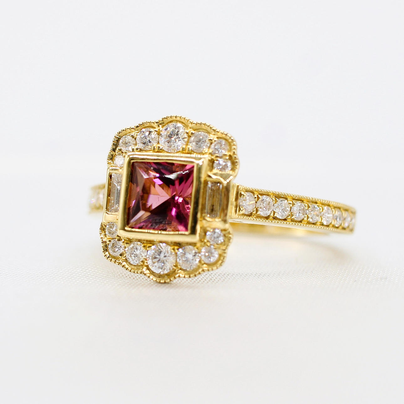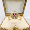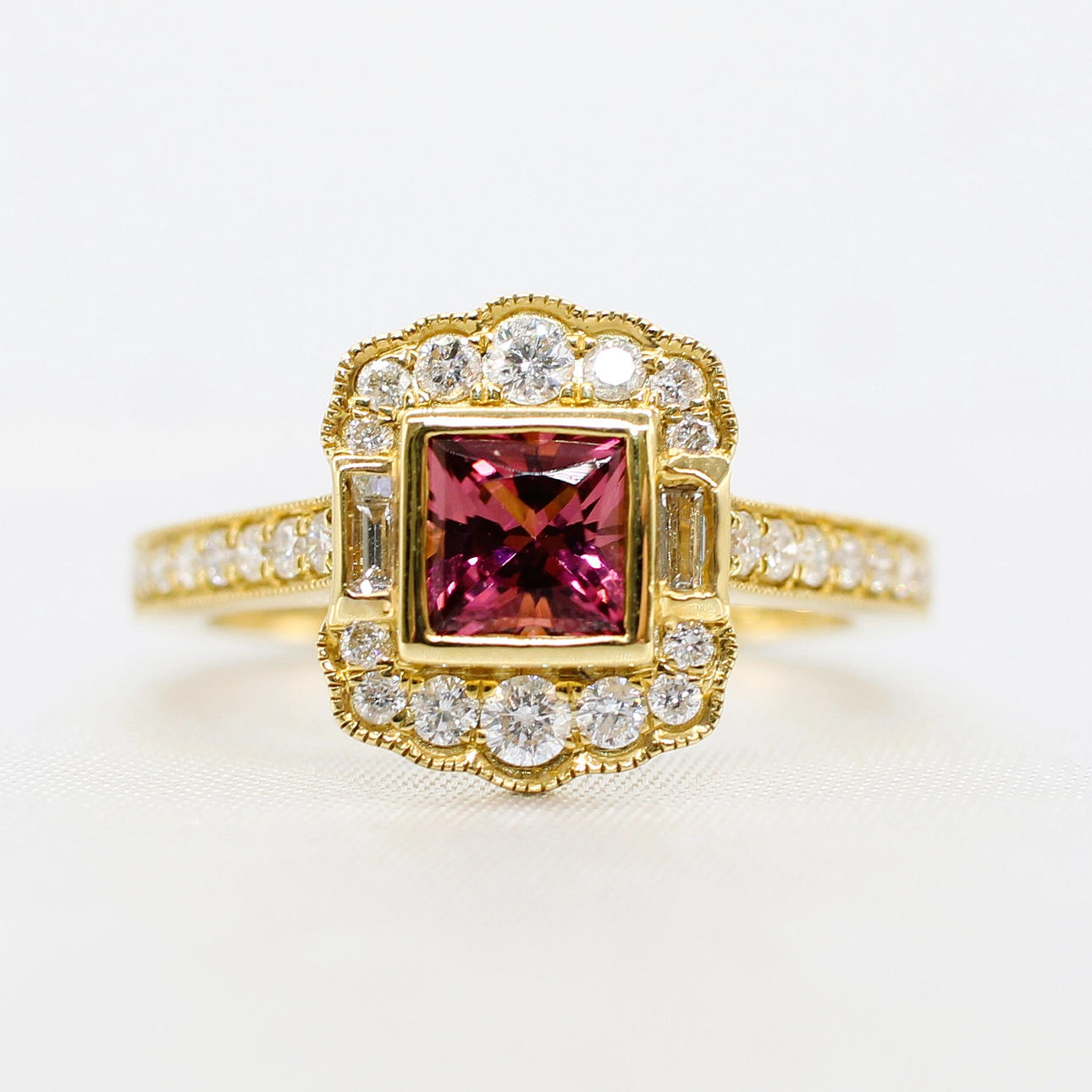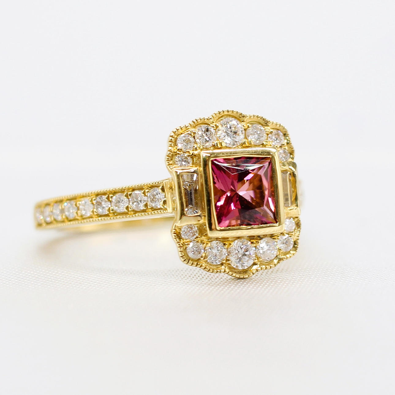 A Uniquely Stylish 18K, Hallmarked, Yellow Gold Ring Set With A Square Pink Topaz And Round Brilliant Cut Diamonds