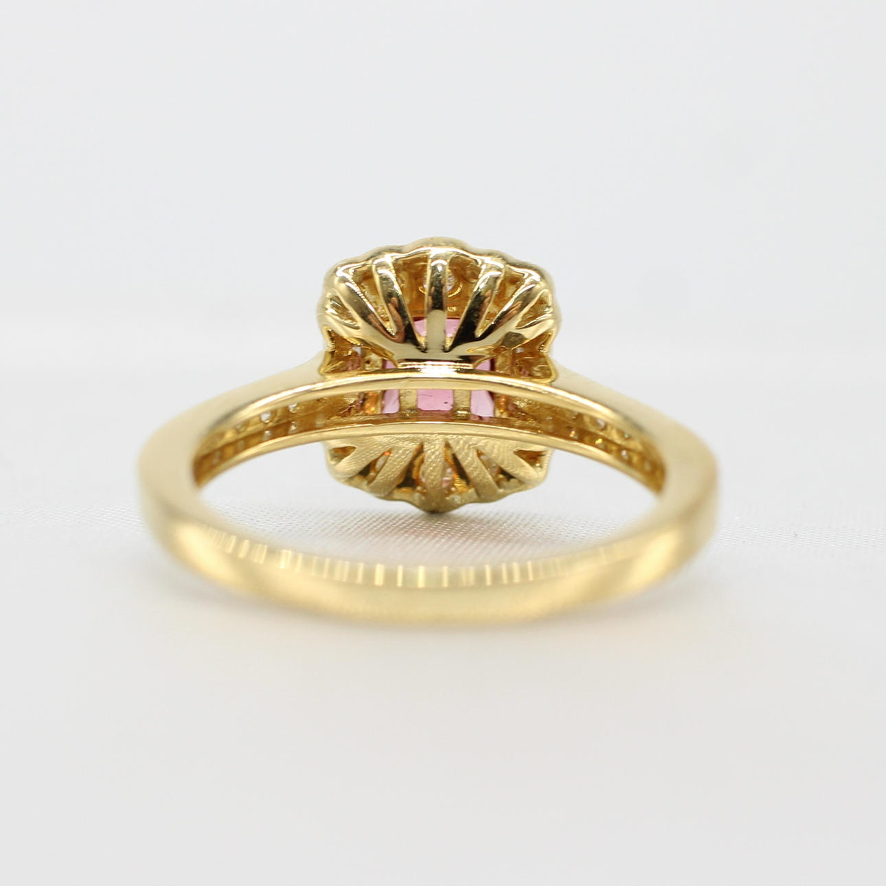 The Ring Head Focuses On The Central Pink Topaz Which is Surrounded With 14x Round Brilliant Cut Diamonds And 2x Baguette Cut Diamonds.