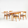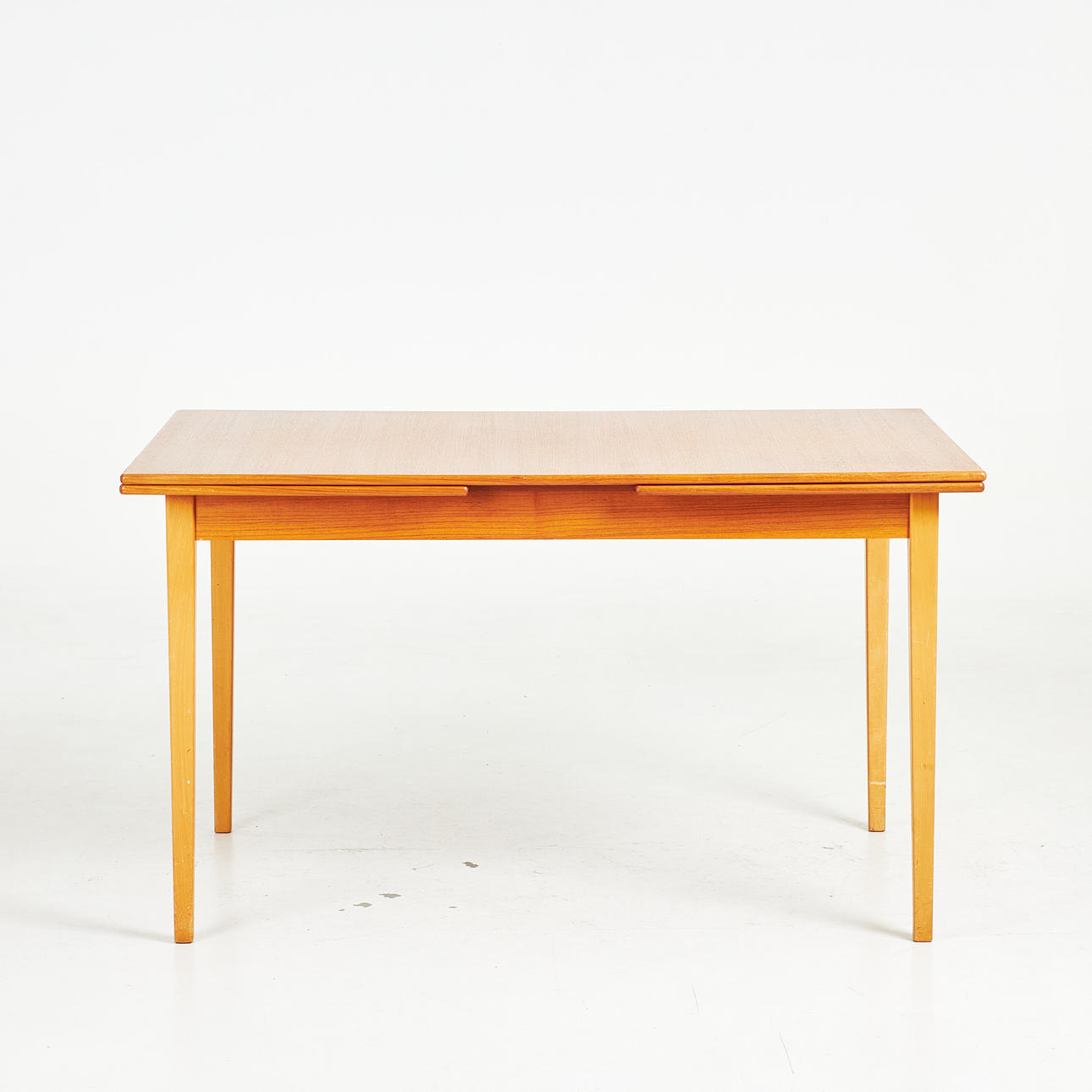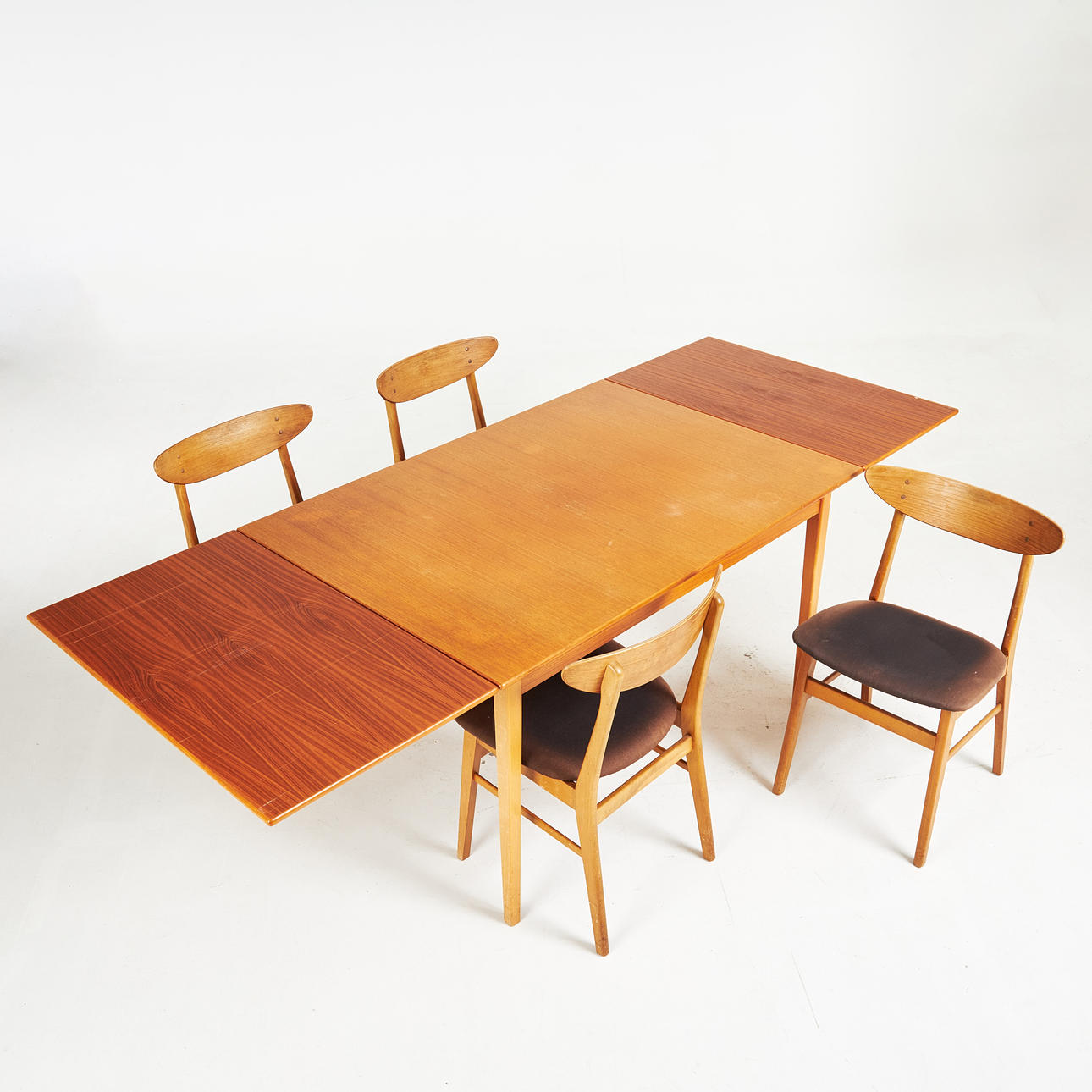 Frame in beech and teak veneer, the table with underlying boards that can be pulled out.