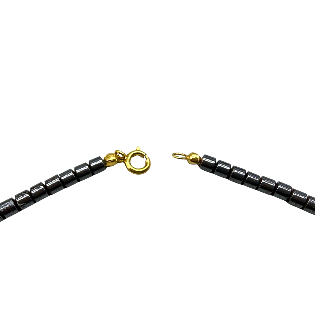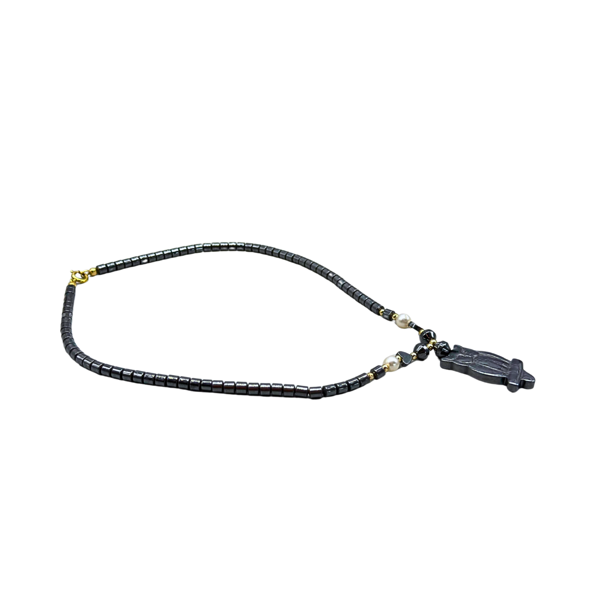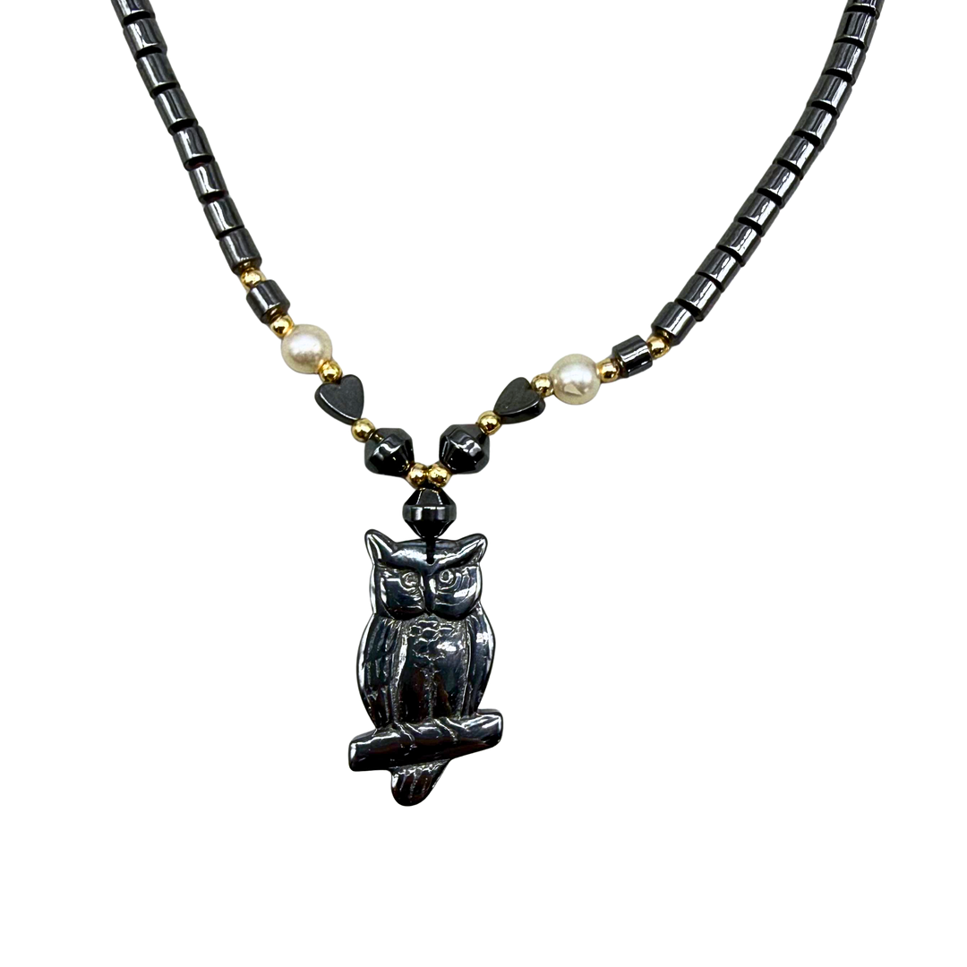 5023957. HEMATITE NECKLACE WITH AN OWL PENDANT.