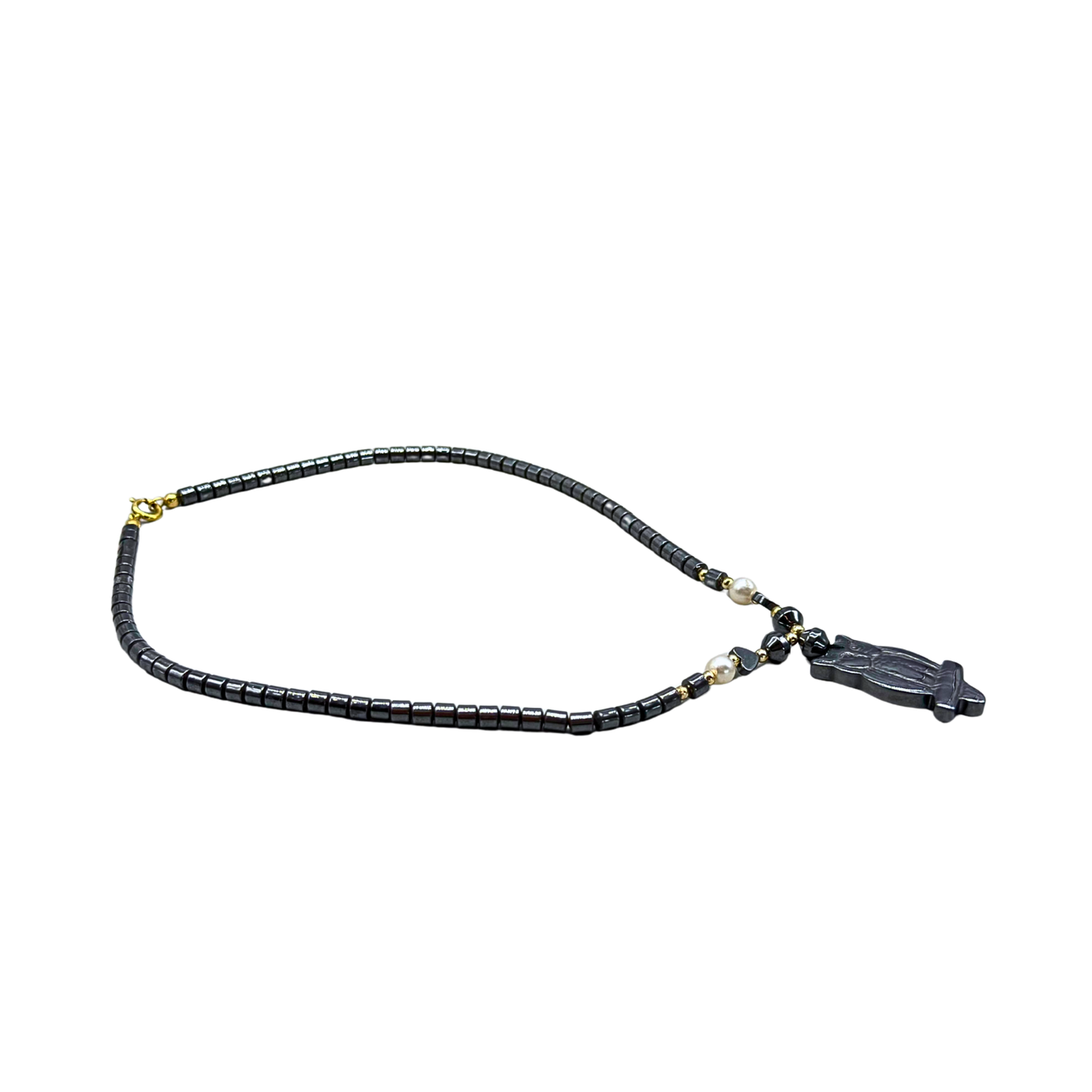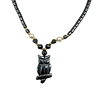 A hematite necklace with an owl shaped pendant.