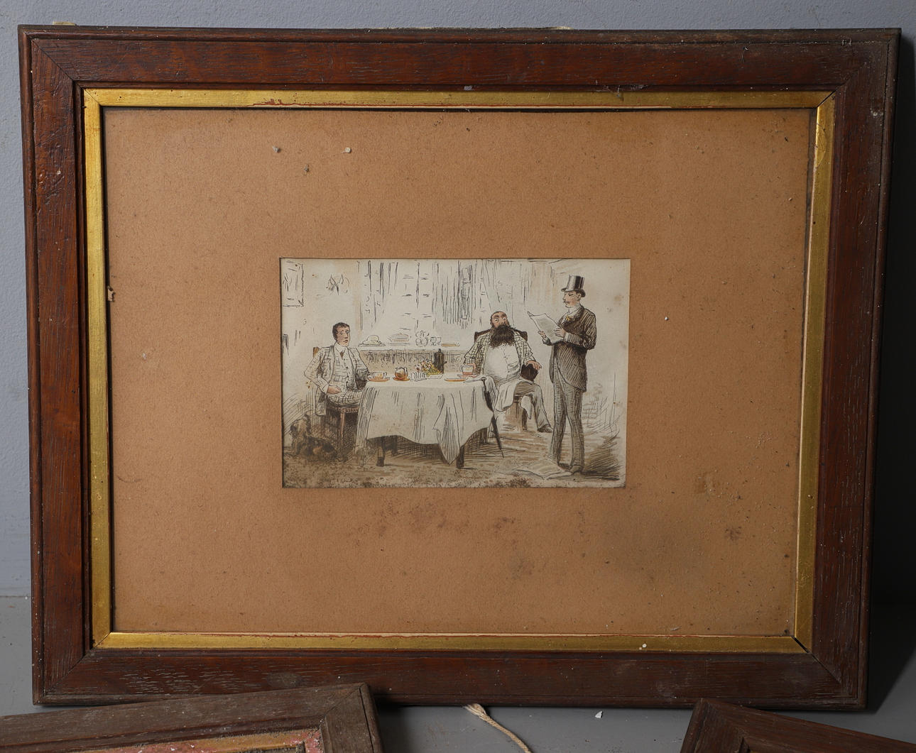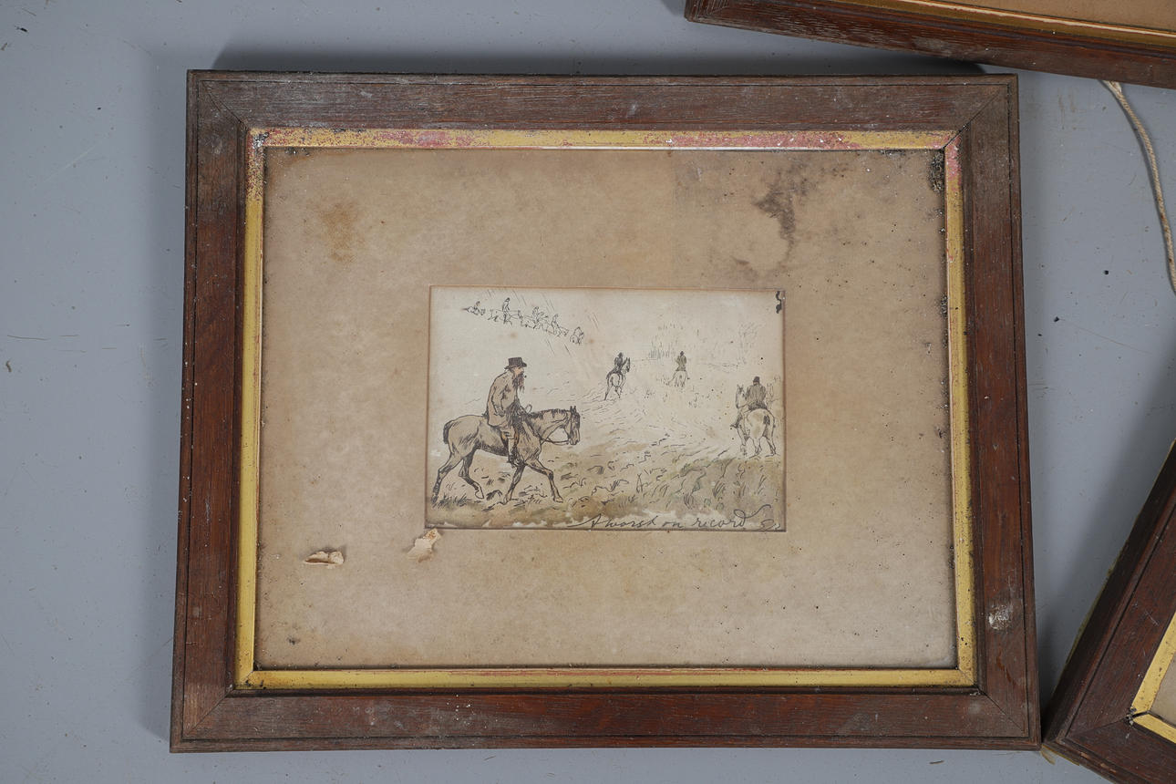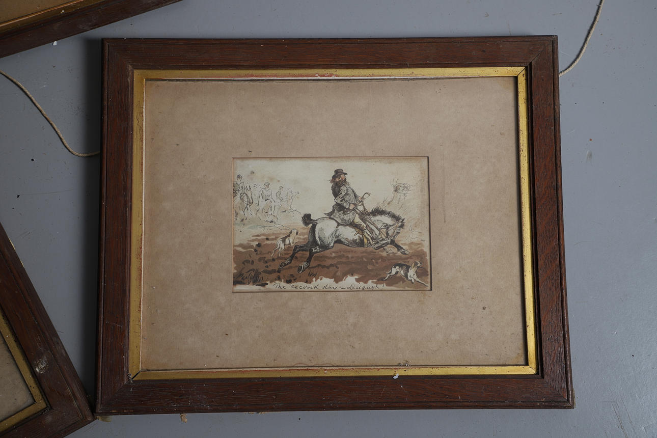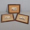A set of three hand coloured engravings, including figures on horseback. Each mounted in oak frames. 20cms by 14cms, frames 46cms by 37cms.