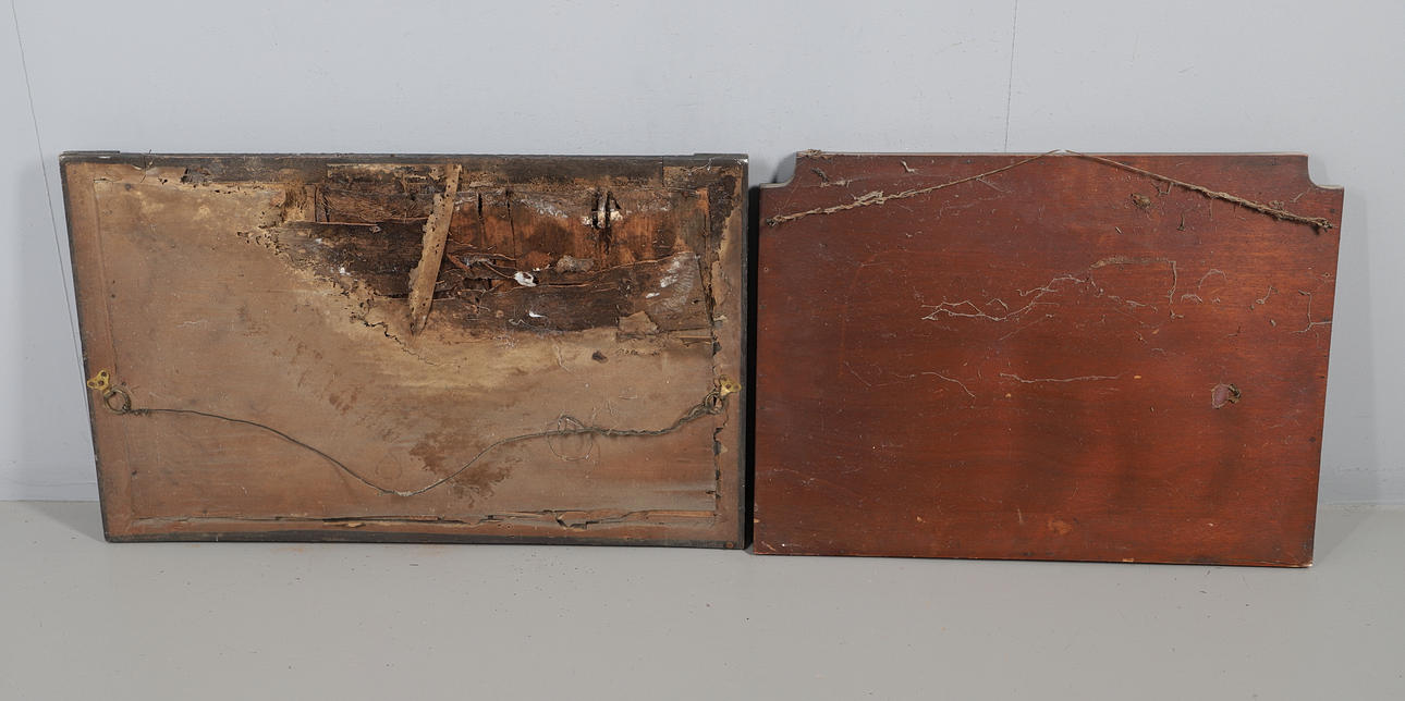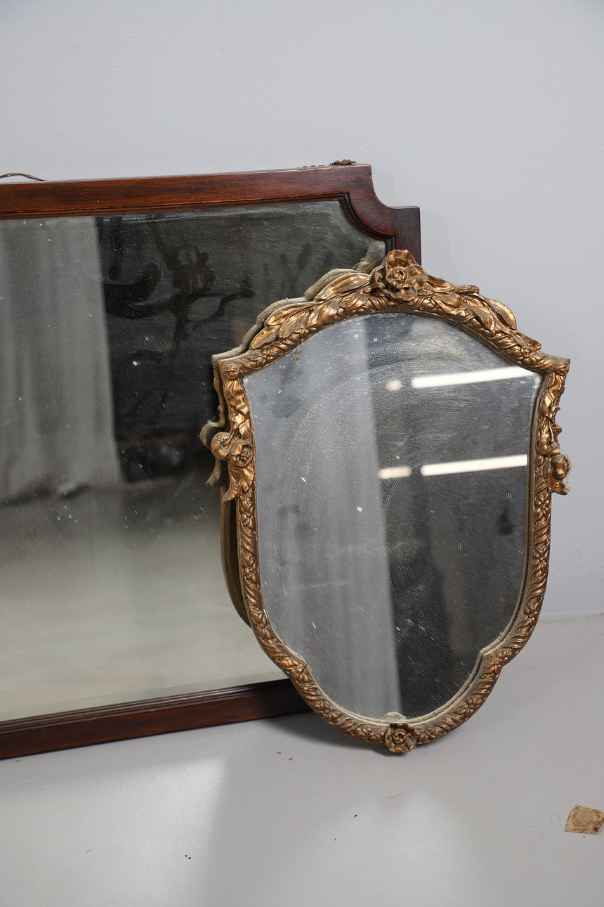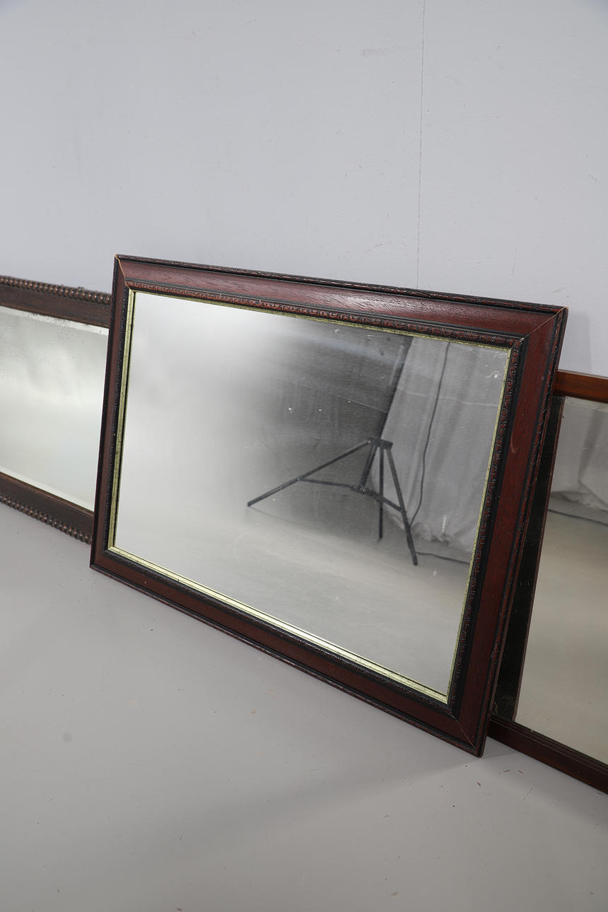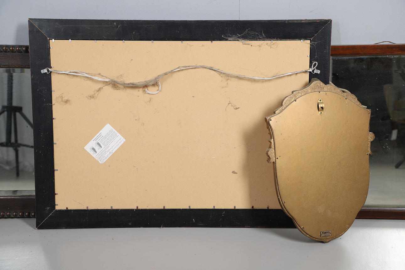 Including an oak wall mirror (87cms by 53cms, back board damp with parts missing and damaged), another large mirror (88cms by 62cms), and two other mirrors. (4).