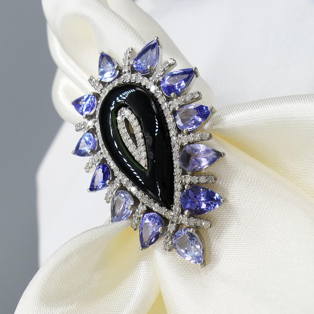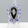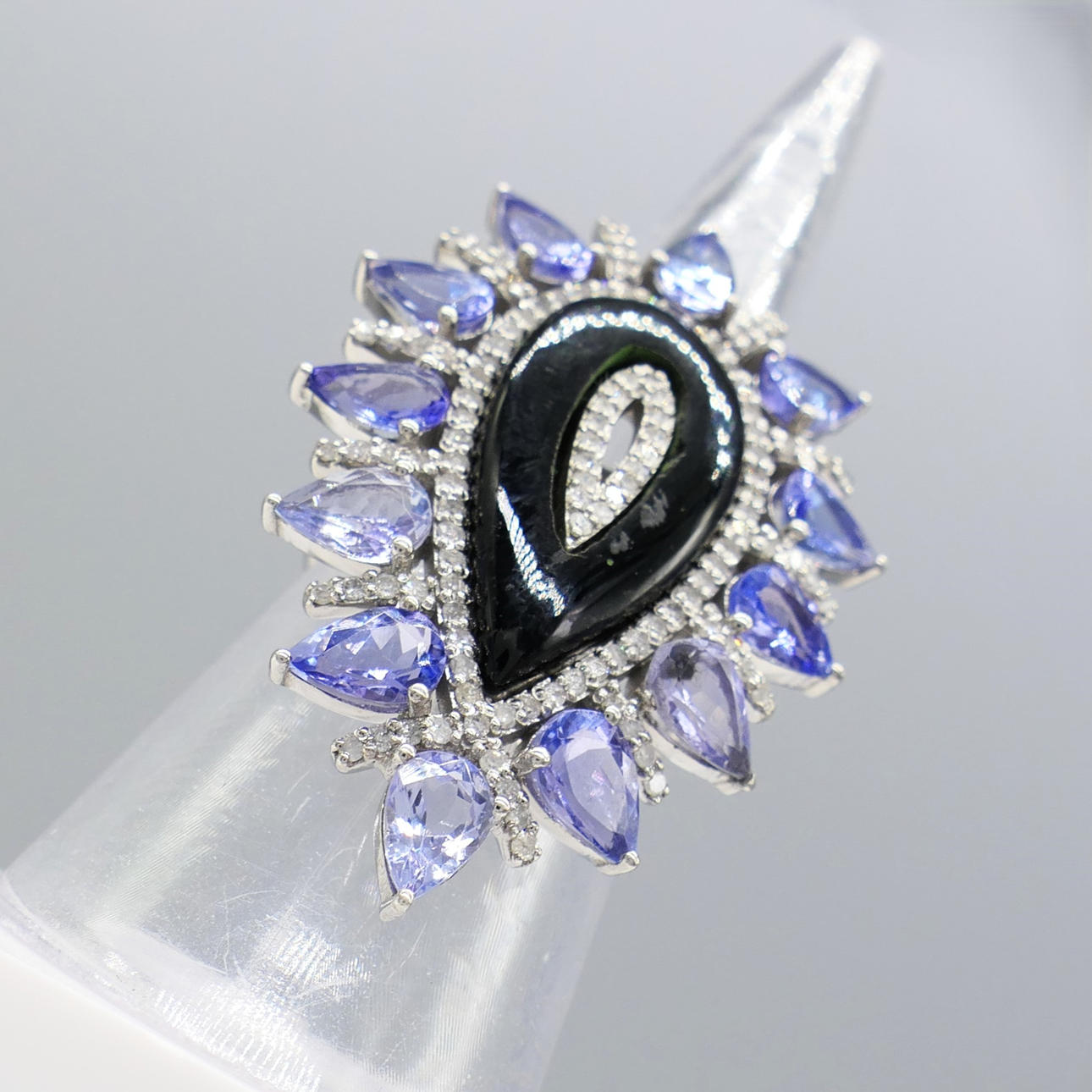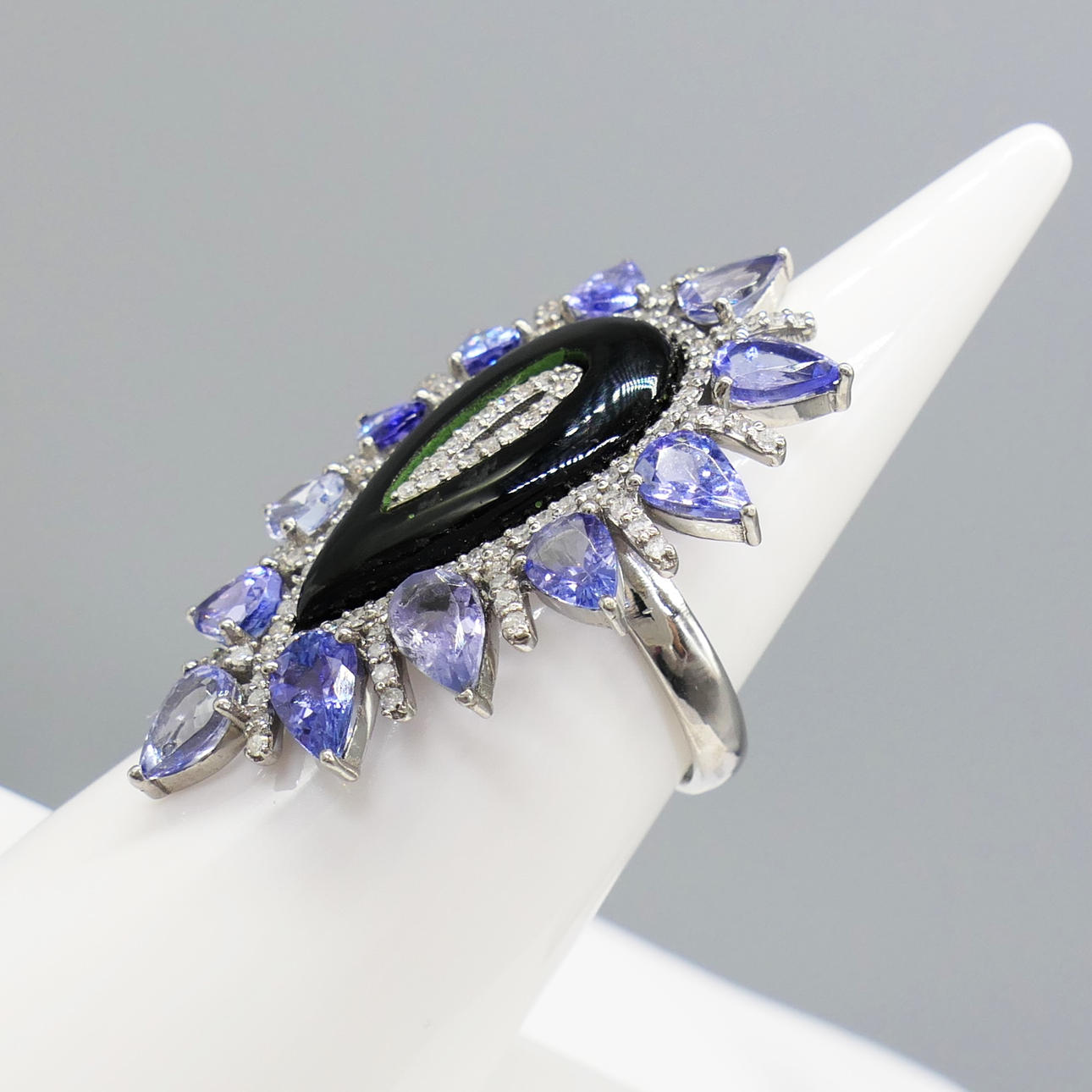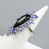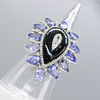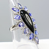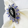 A large pear-shaped silver dress ring set with black onyx, tanzanites and diamonds, with gifting box