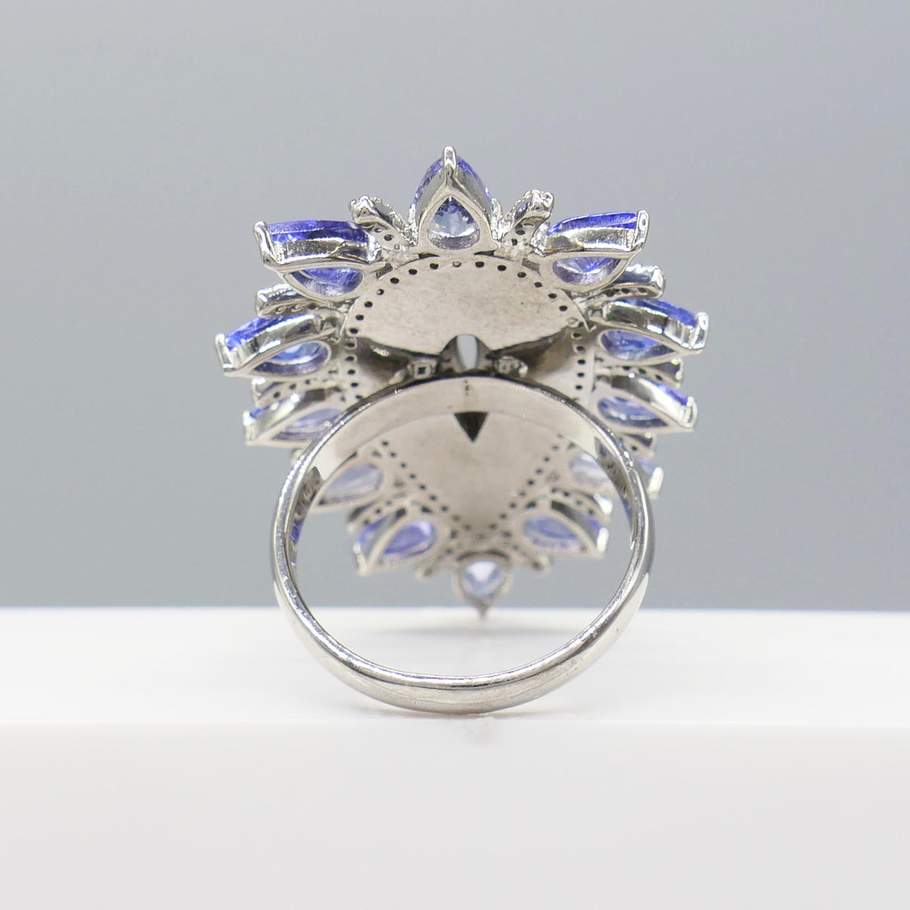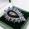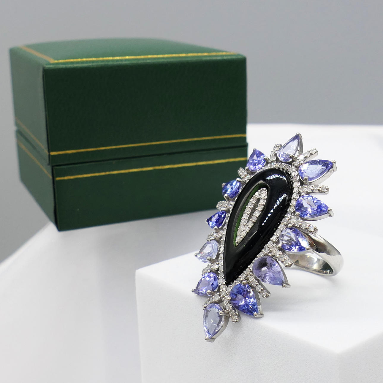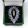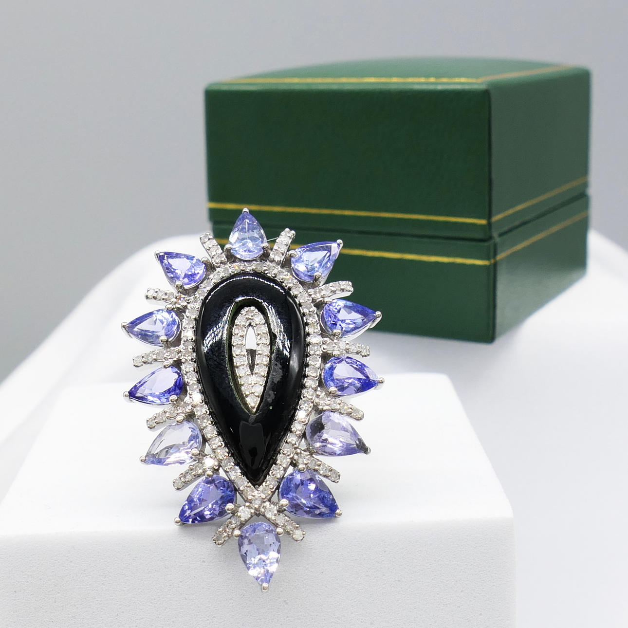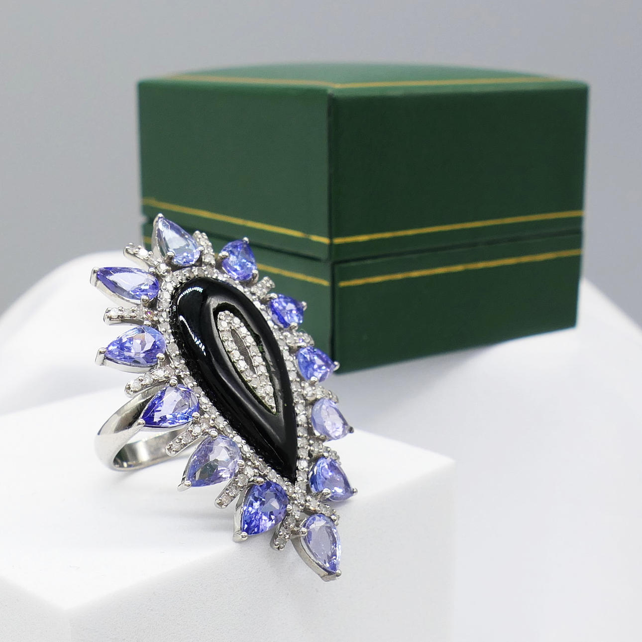 A large pear-shaped silver dress ring set with black onyx, tanzanites and diamonds, with gifting box