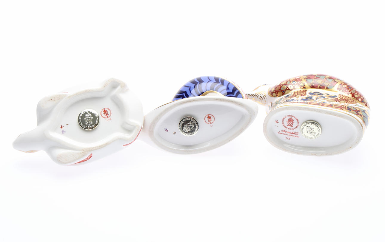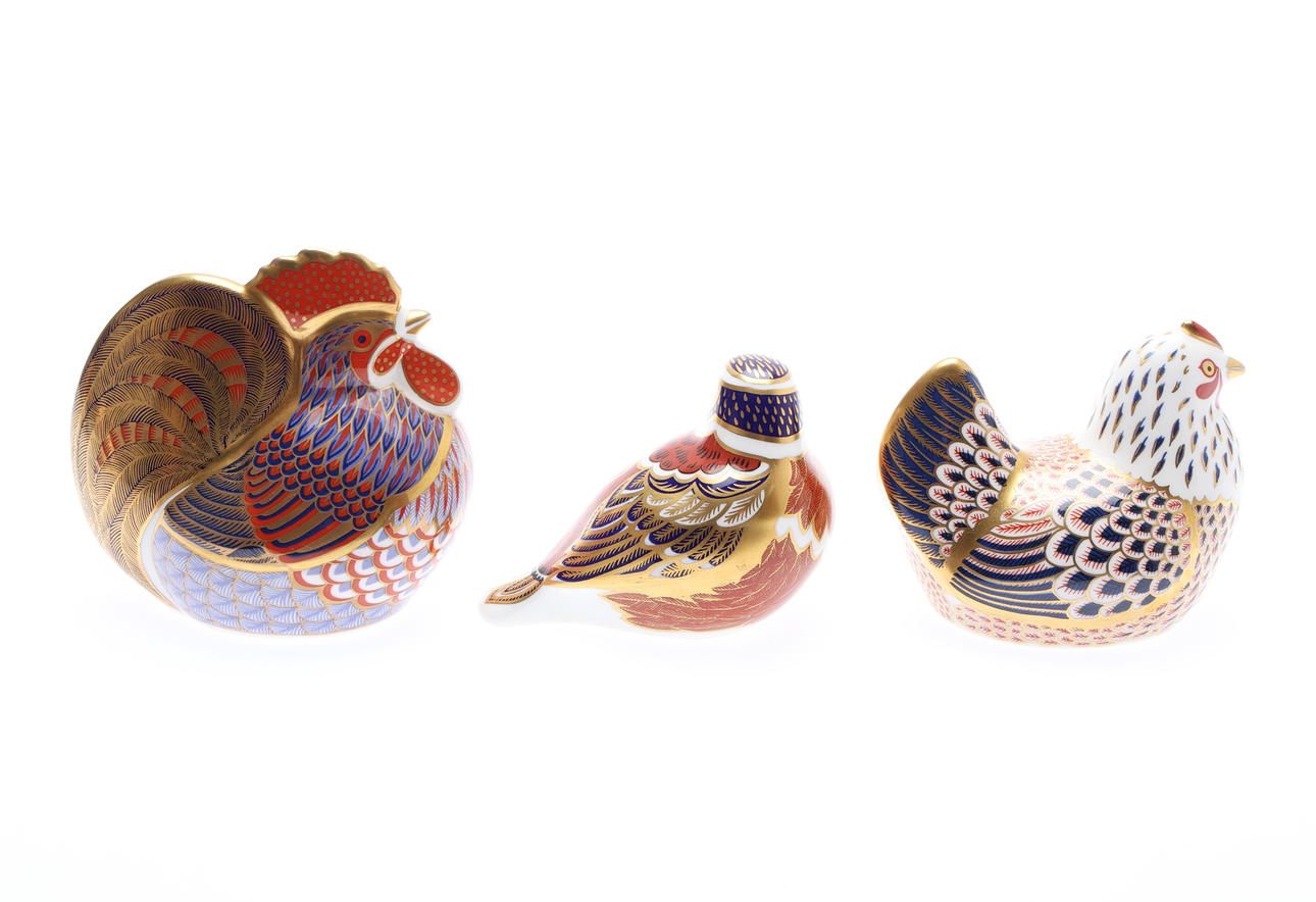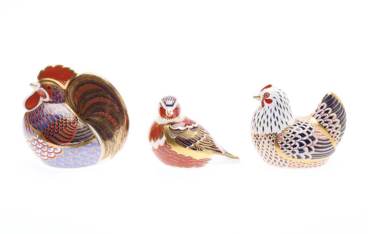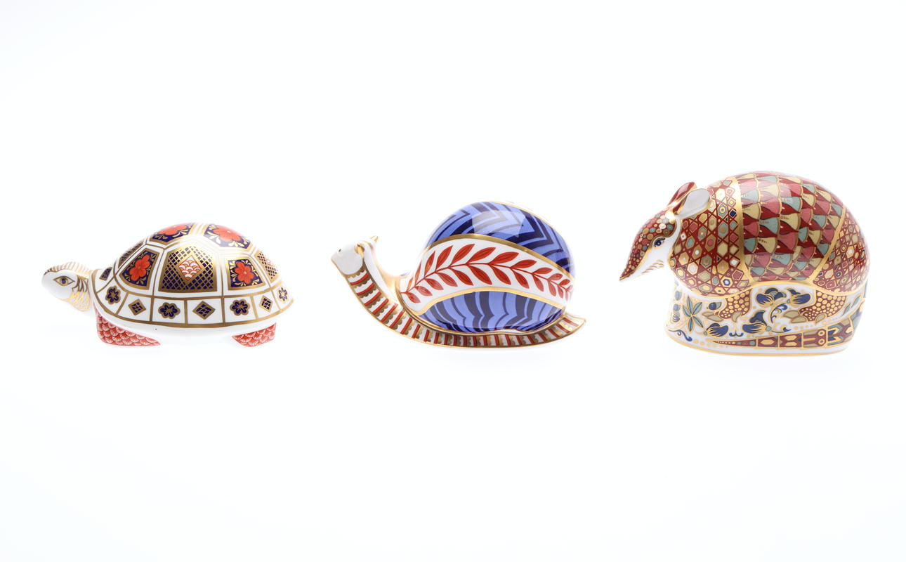Comprising Armadillo, W.11cm; tortoise, snail, W.12cm; hen, cockerel, and another bird. (6).