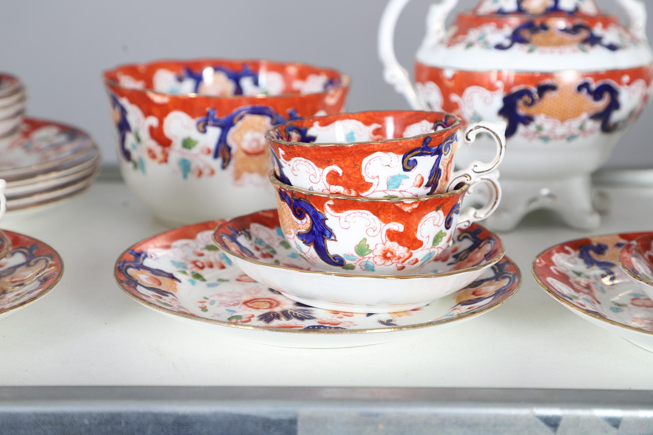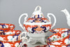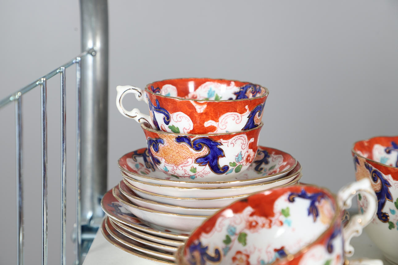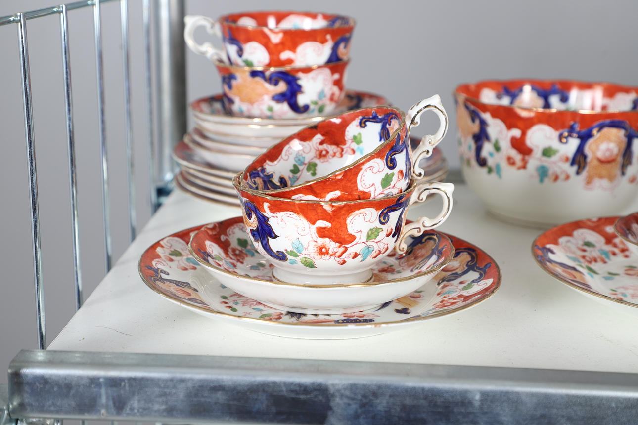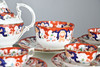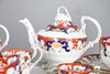 comprising teapot and cover, twin handled sucrier and cover, milk jug, two slop bowls, two cake plates, side plates, cups and saucers (qty).