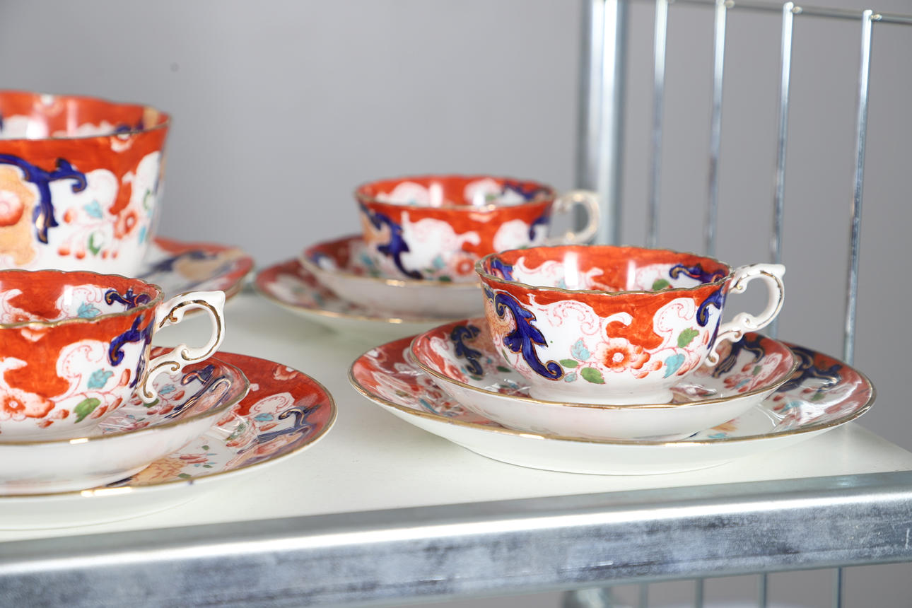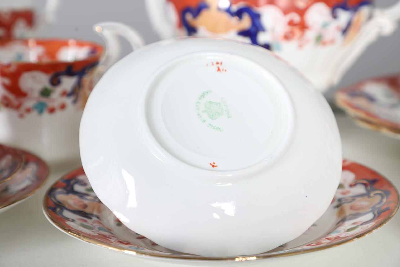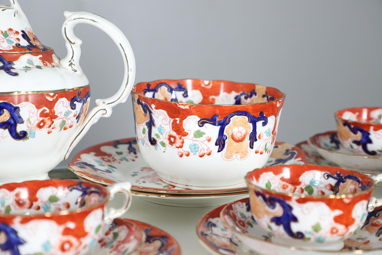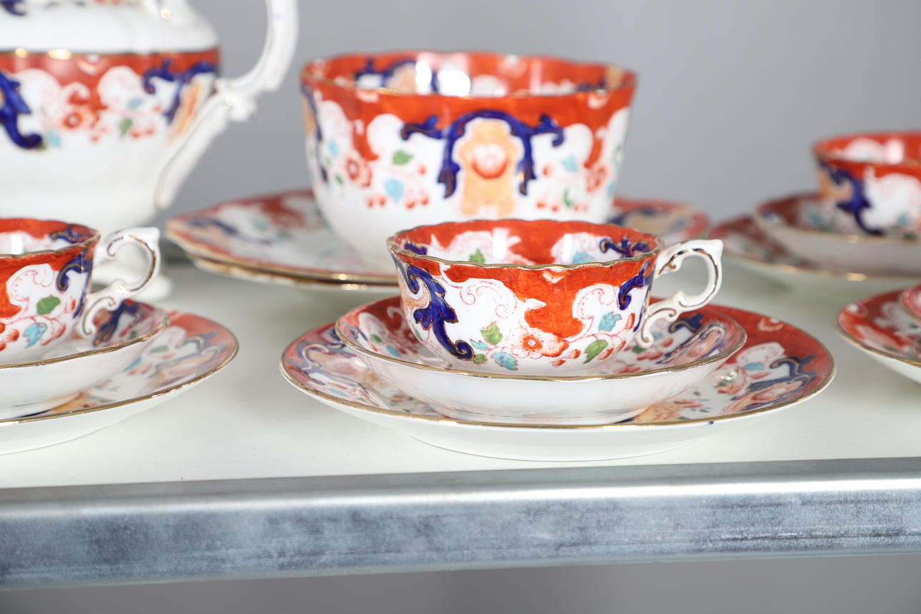 comprising teapot and cover, twin handled sucrier and cover, milk jug, two slop bowls, two cake plates, side plates, cups and saucers (qty).