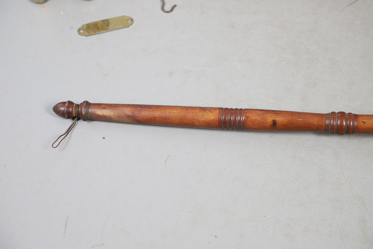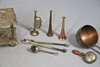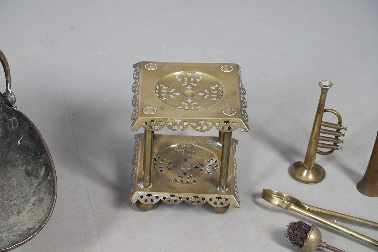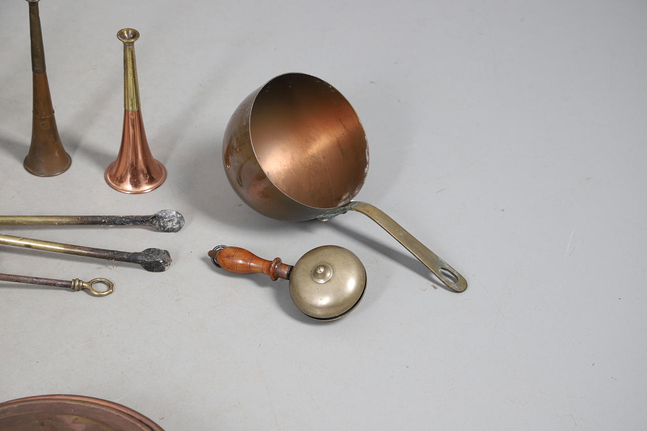 To include a copper coal scuttle with a brass handle and raised on a singular base, a copper bed pan, a two tier brass trivet, and various other brass items including three small trumpets, a fireplace utensils and others etc. Size of bed pan, 122cm (length) x 29cm (w). (QTY).