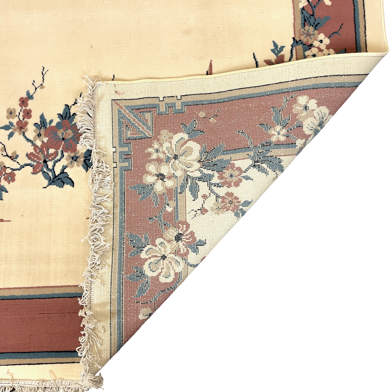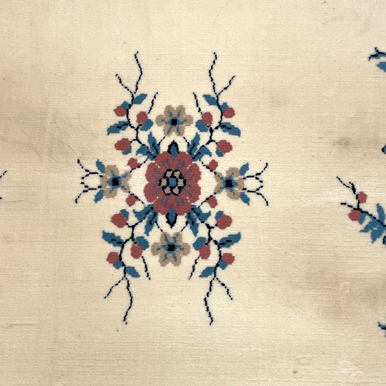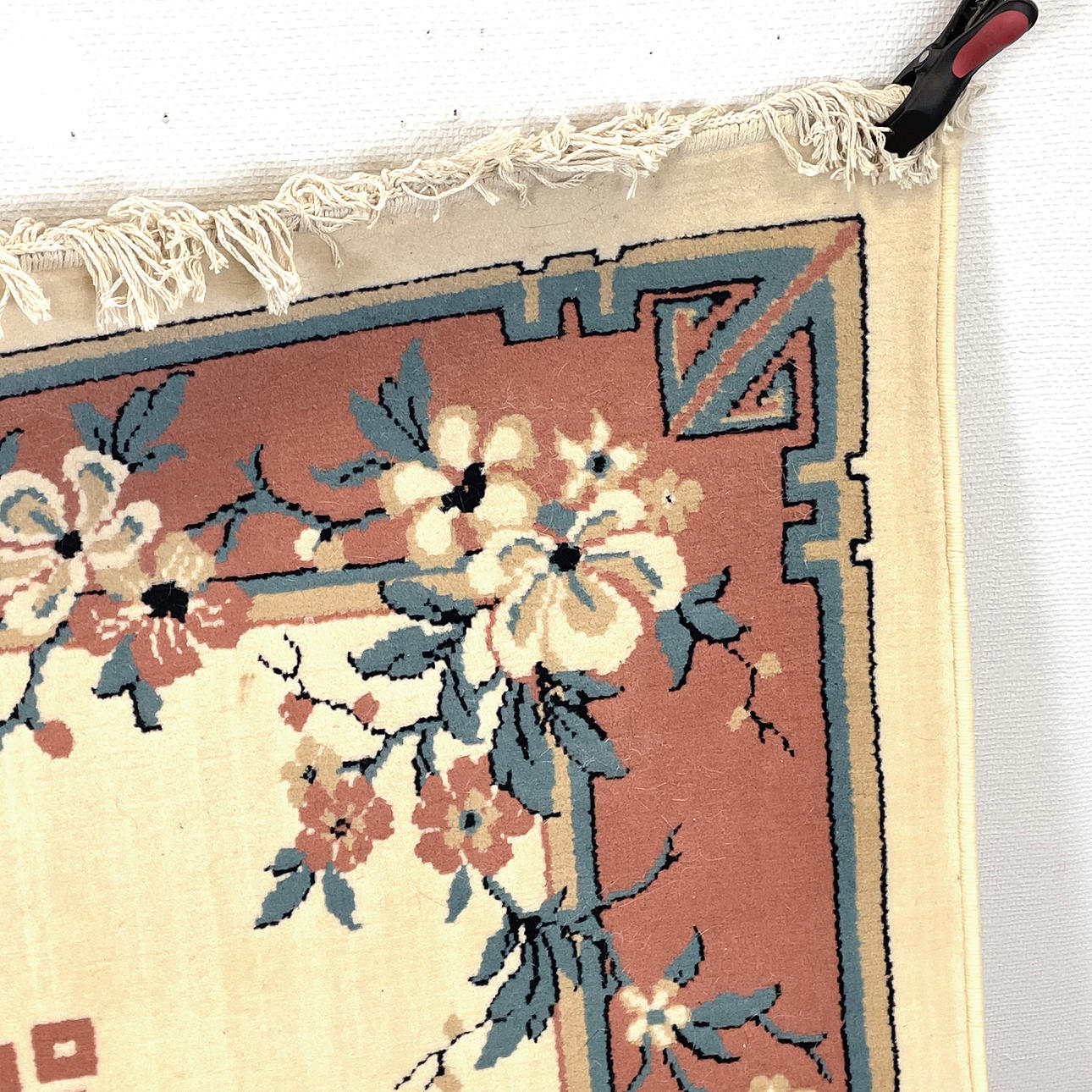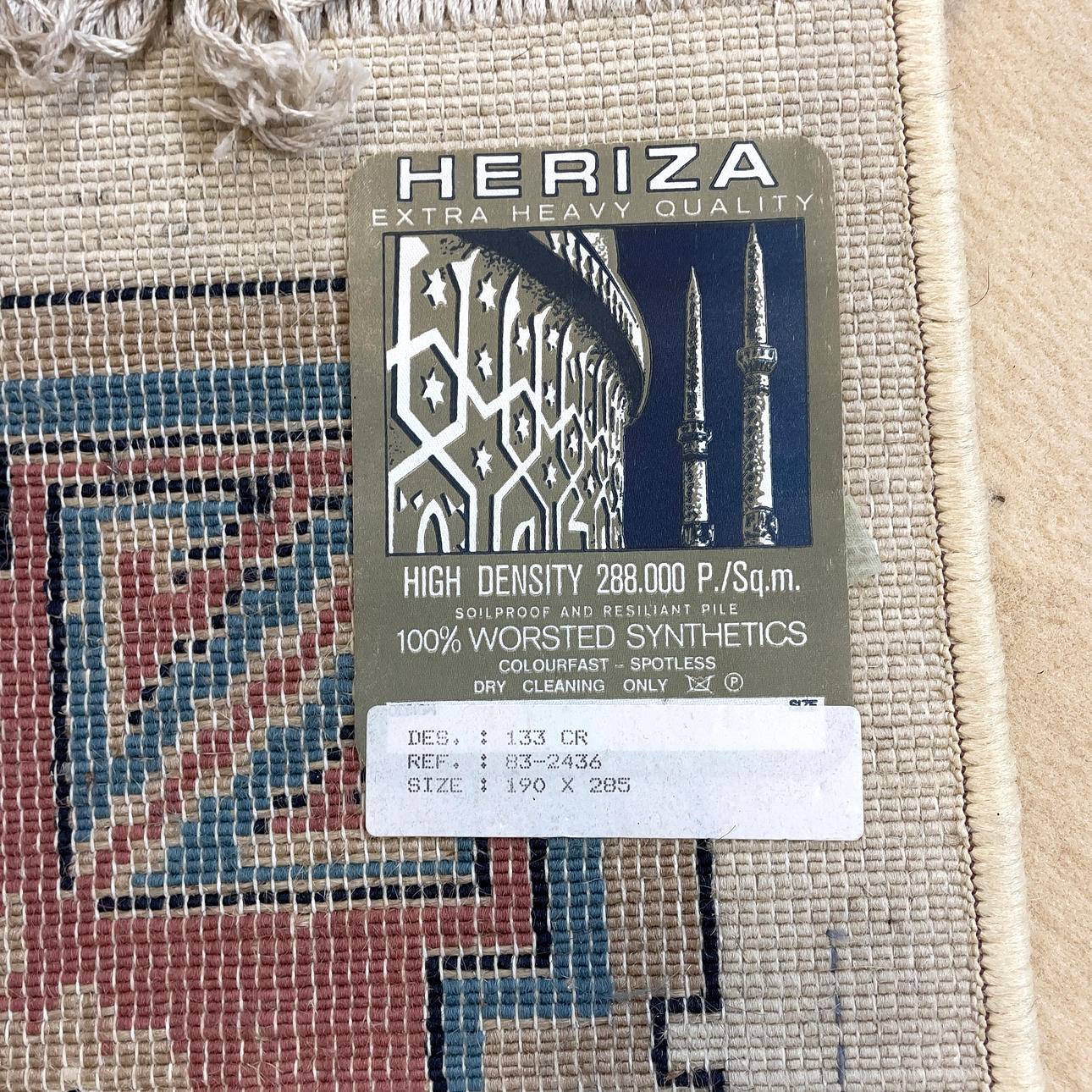 Floral decoration in pink, blue and brown against a light ground. Labelled "Heriza". Dimensions: 285 x 190 cm.