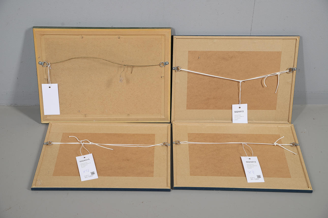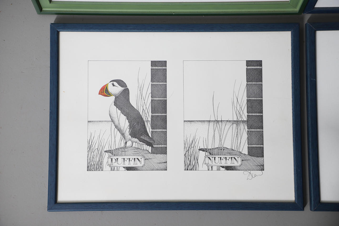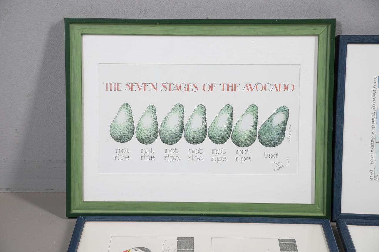 to include the seven stages of the avocado, and there he stood...; tall duck and handsome, puffin nuffin, and tern on a tap, each framed and glazed, the largest 43cm x 32cm overall (4).