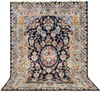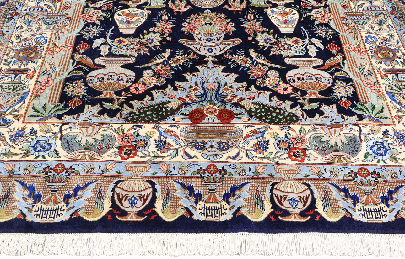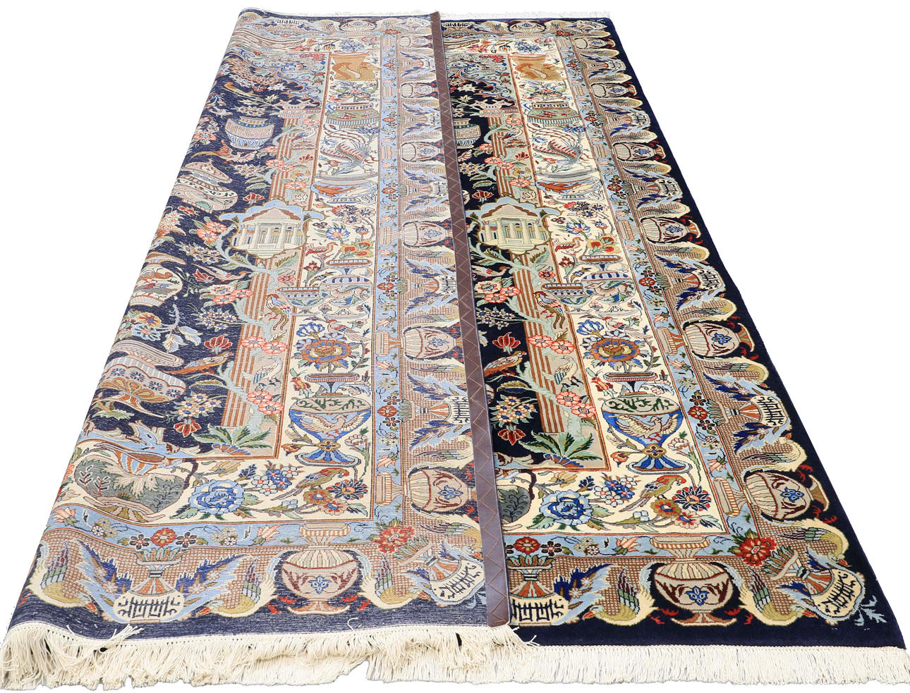 Figural Cashmar with dark bottom color and a central vase motif with floral decor, surrounded by additional architectural and figural elements in beige, blue, green and red tones. The main border has a light bottom colour with similar decoration and is surrounded by an outer border with a dark bottom colour. The forelock is made of wool and the warp is of cotton.