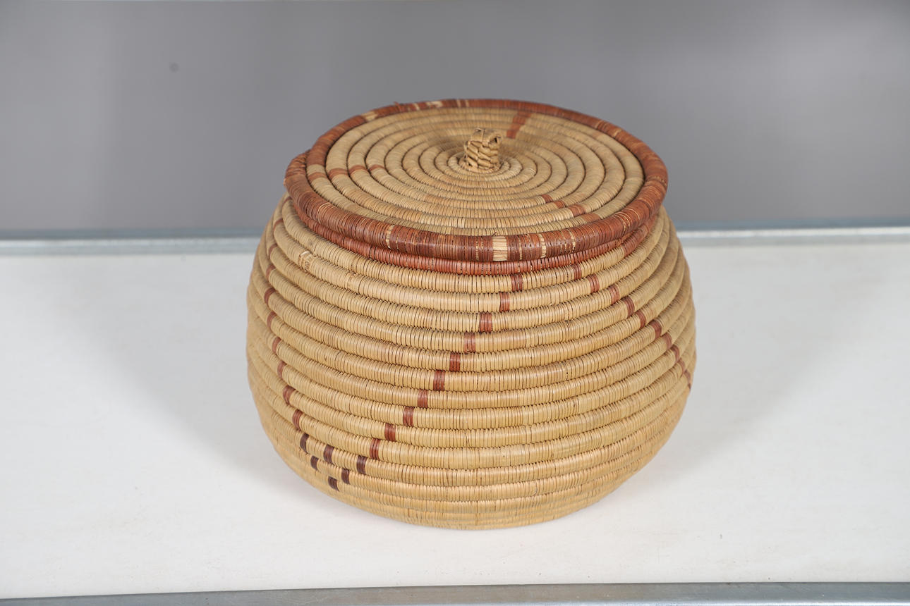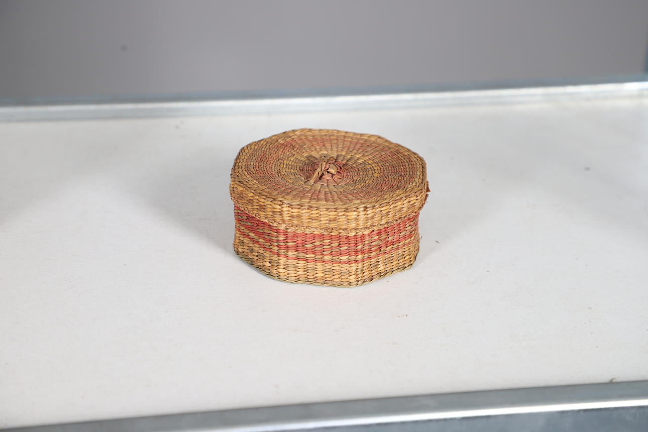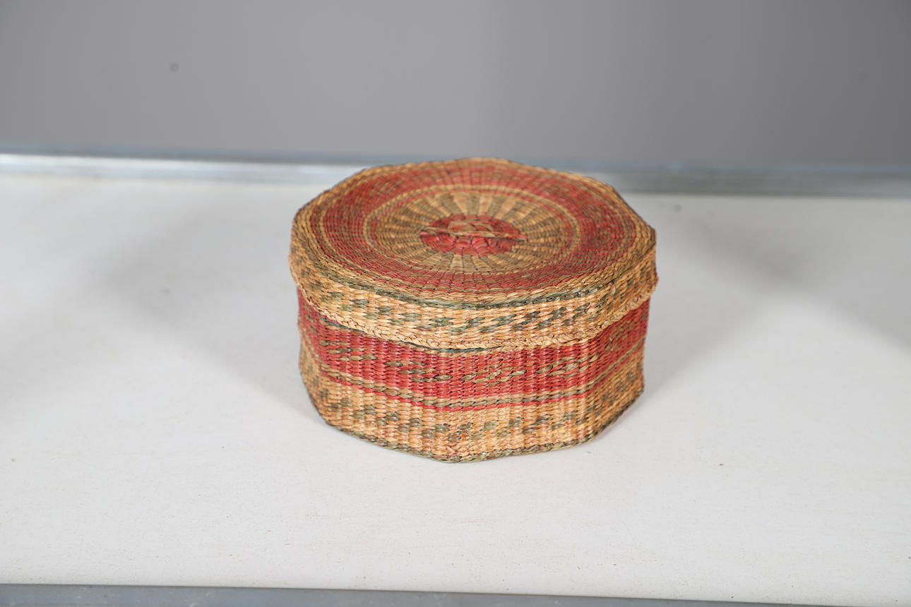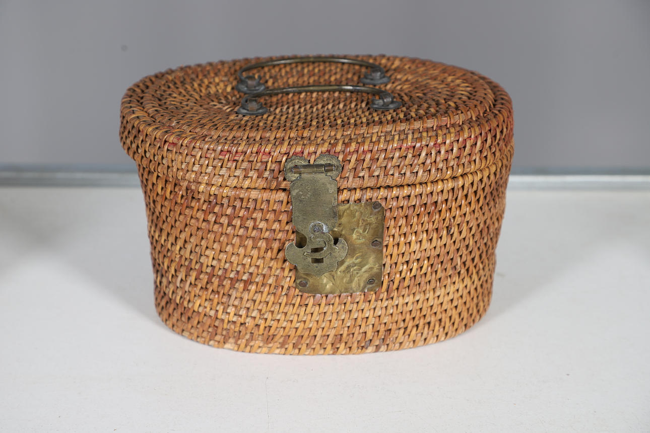 Including a Victorian walnut and inlaid jewellery box, with a lift out tray and brass lock (22.5cms by 14.5cms), also with a variety of woven lidded boxes (largest 19cms high), and a wicker basket (22.5cms across).
