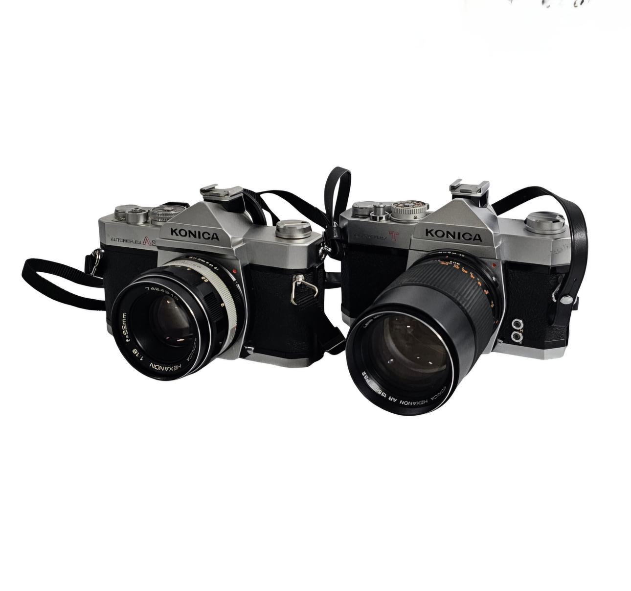 Konica Altoreflex T with Konica Hexanon AR 135 mm lens. 11x15x15 cm. approximately.