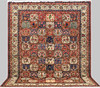 Figural Baktiari with garden pattern in which the center field is divided into rectangular panels with decor of flowers, trees and birds in red, blue and beige. The border has a bright base color with decoration of additional floral and leaf motifs in matching colors. The forelock is made of wool and the warp is of cotton.
