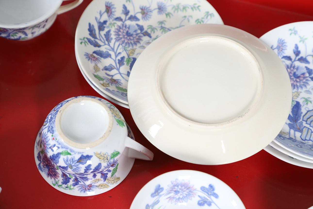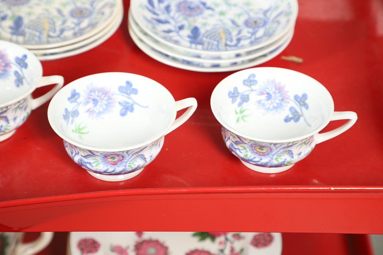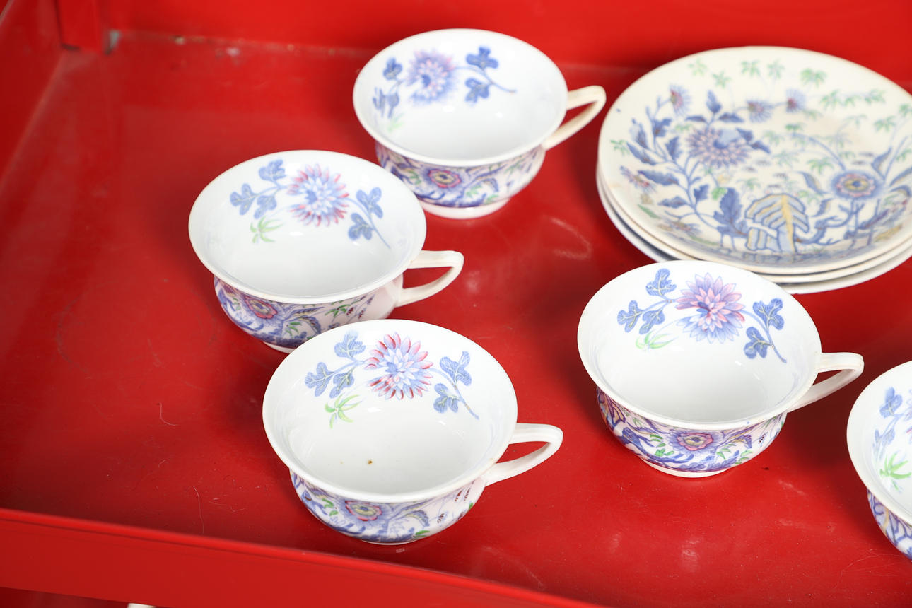 Tea cups and saucers, saucers - some are a slightly different colour, cups - one with restored handle.