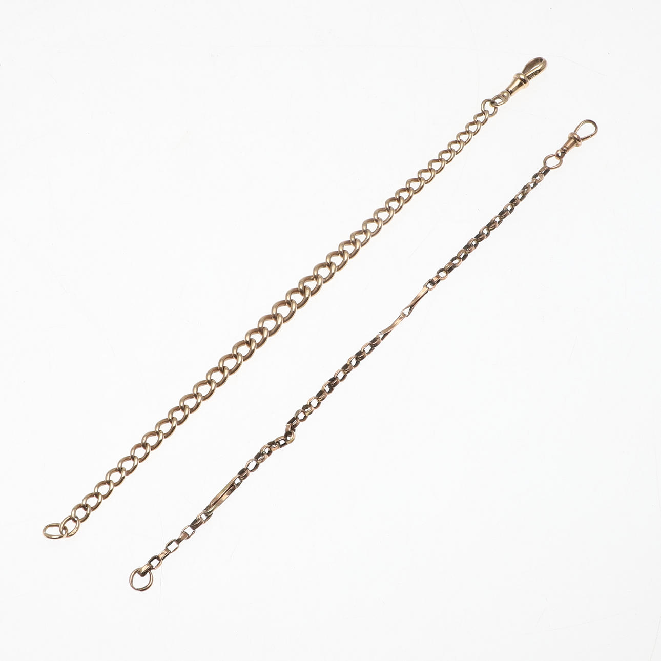 a curb link watch chain, 19cm long, 13.1 grams and a fancy link watch chain, 18cm long, 3.3 grams.