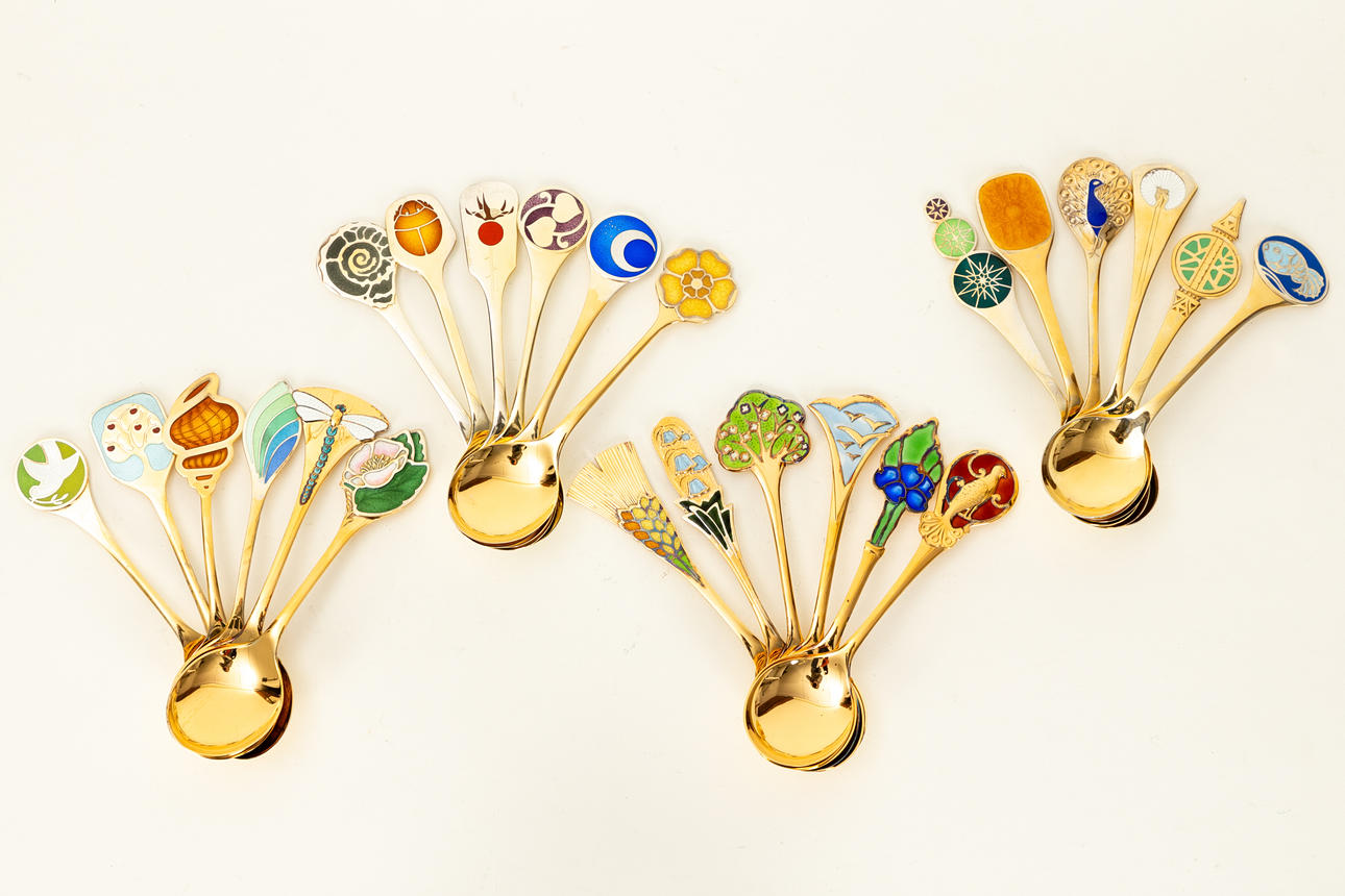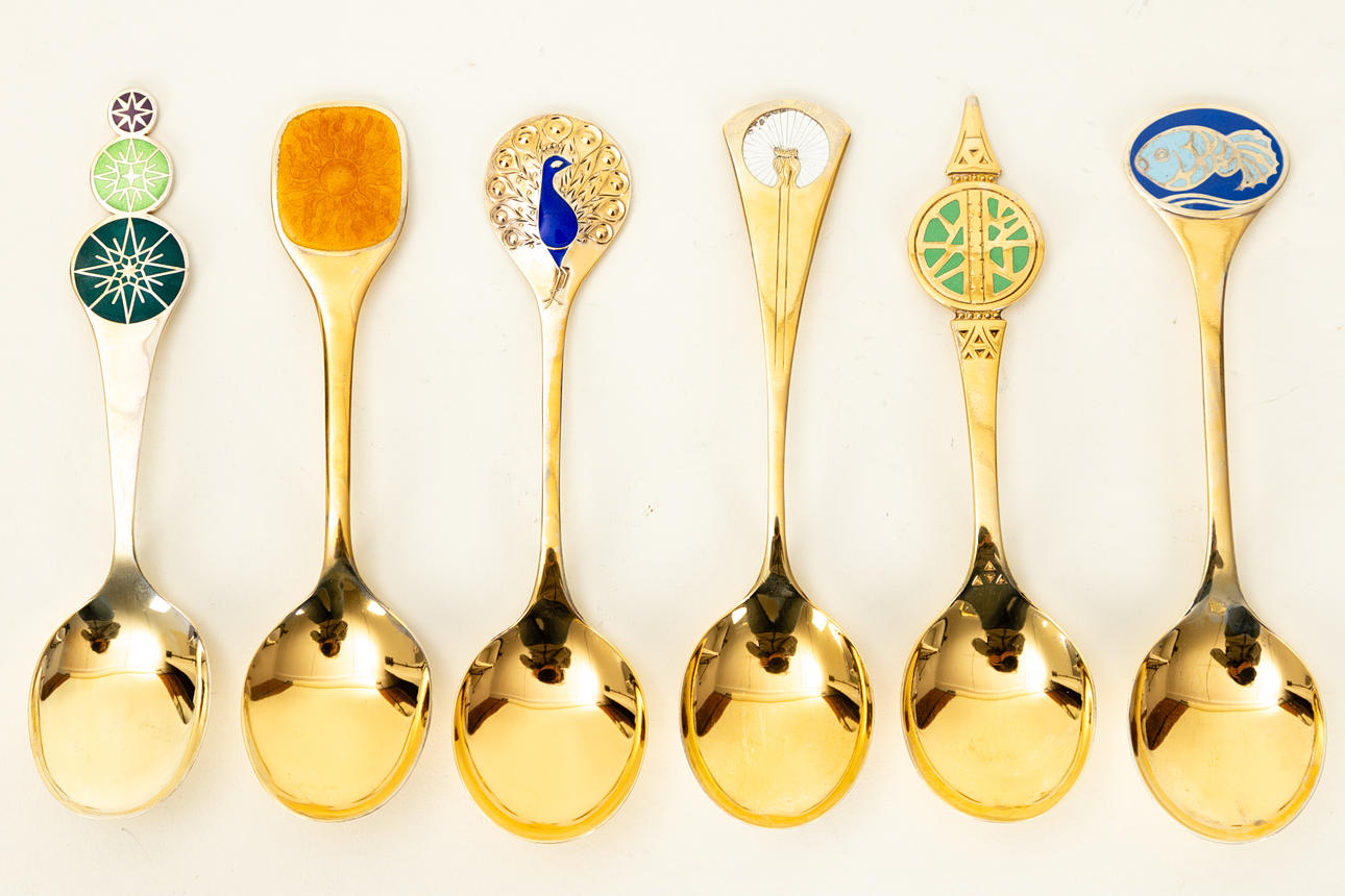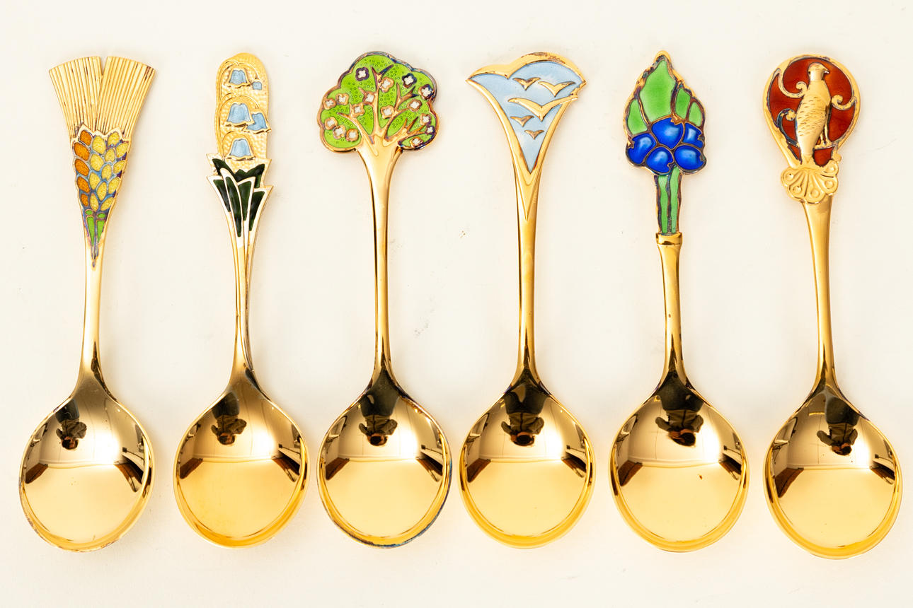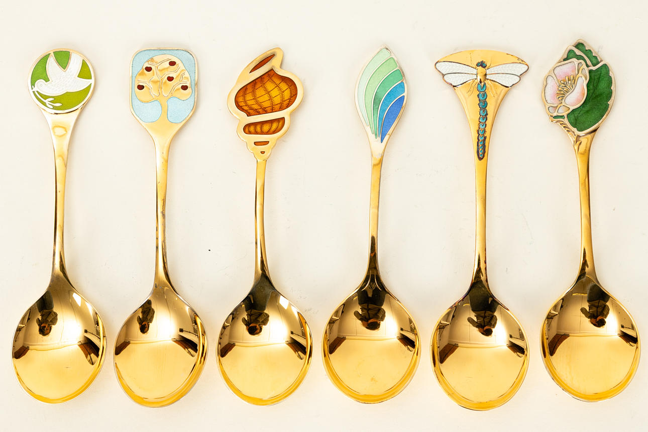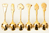 Signs of age and use. Isolated gilding slightly tarnished, one spoon with minor paint abrasion.