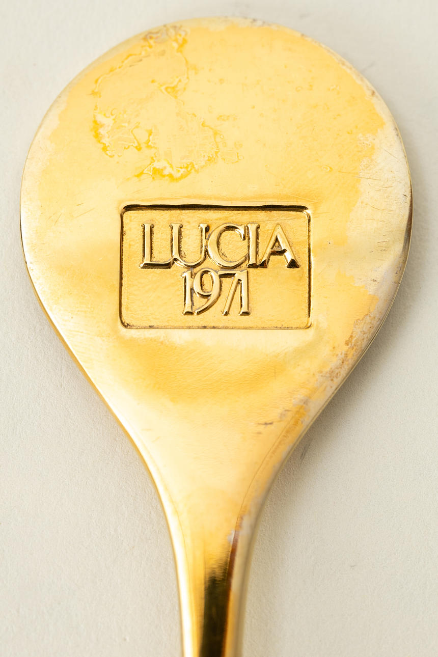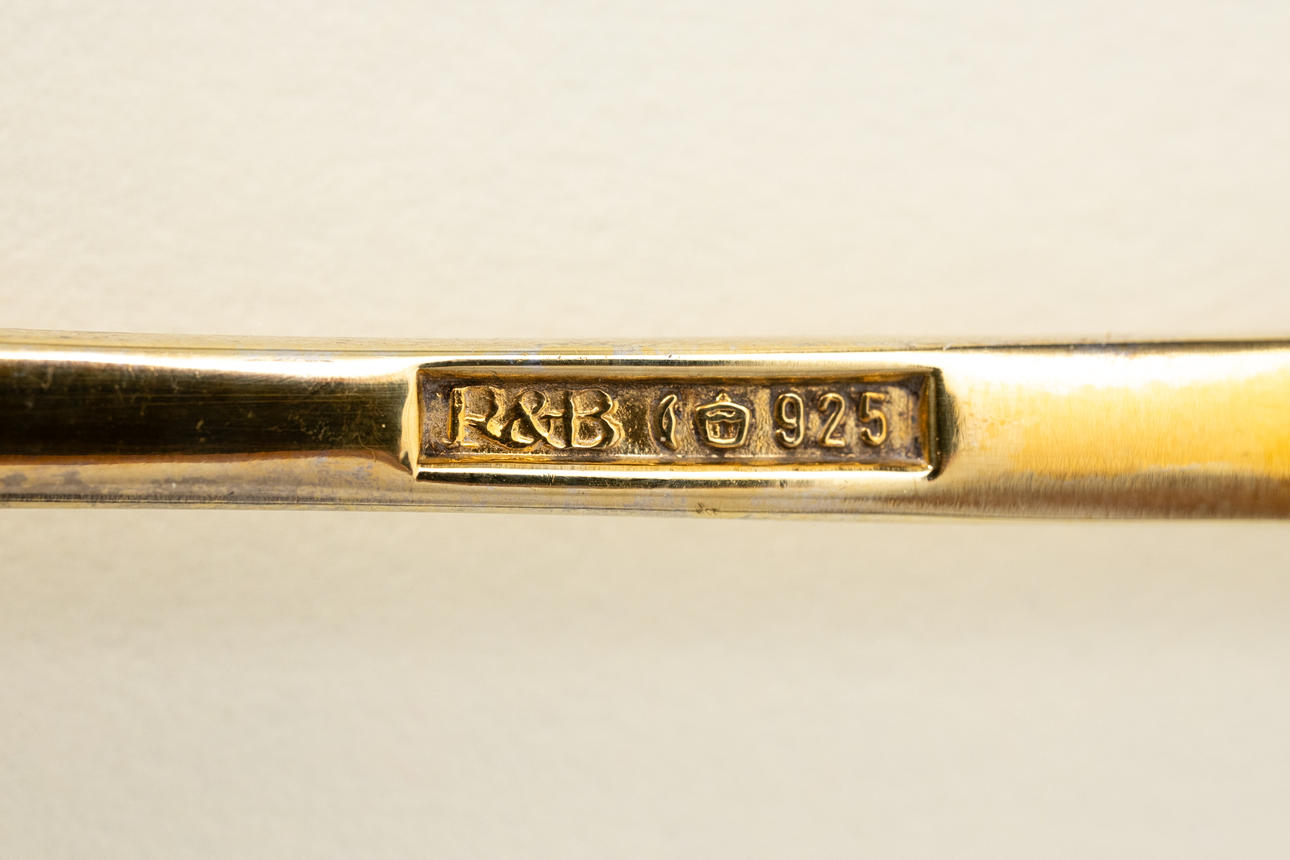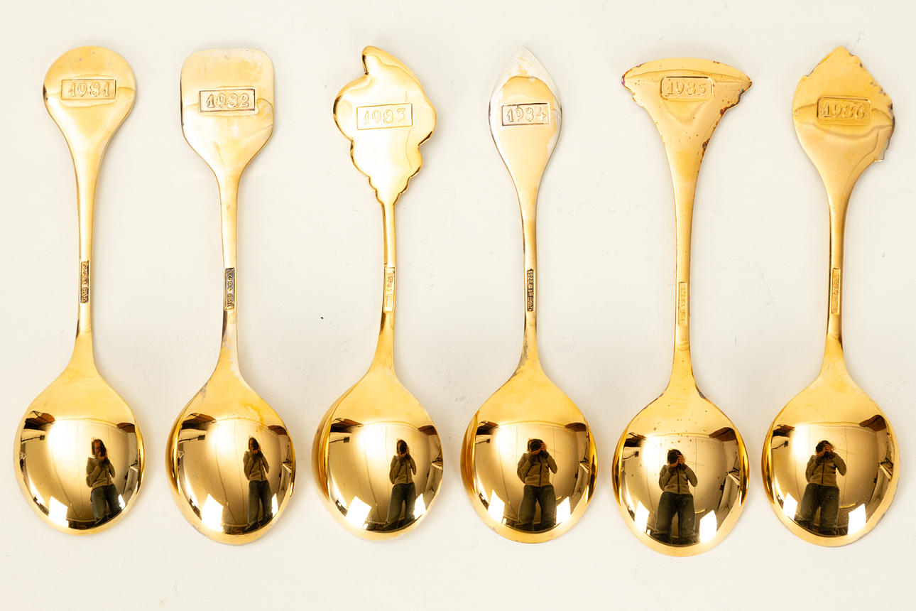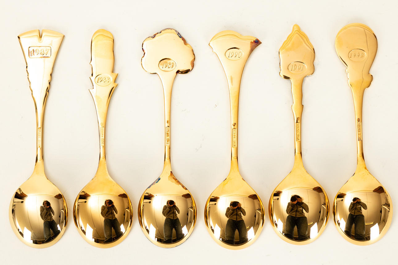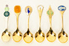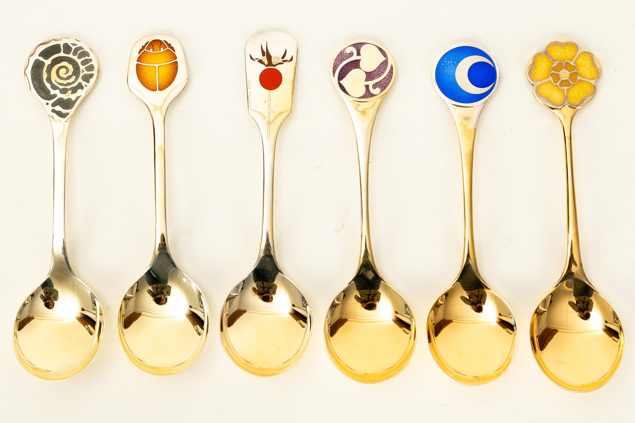 Signs of age and use. Isolated gilding slightly tarnished, one spoon with minor paint abrasion.