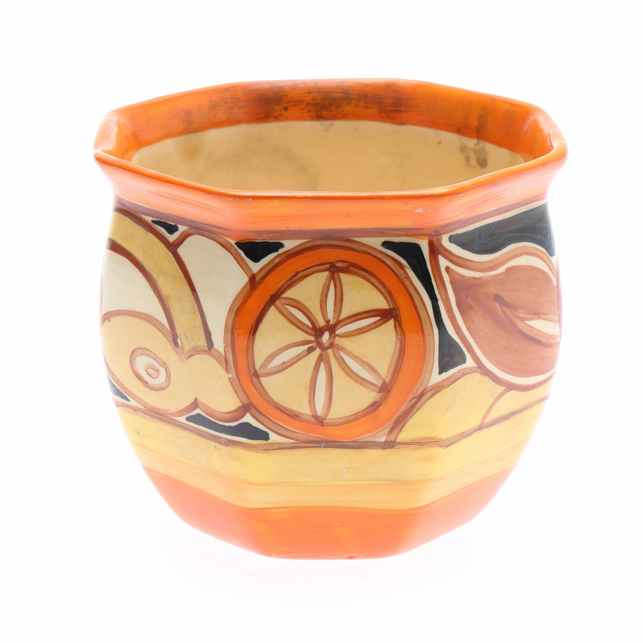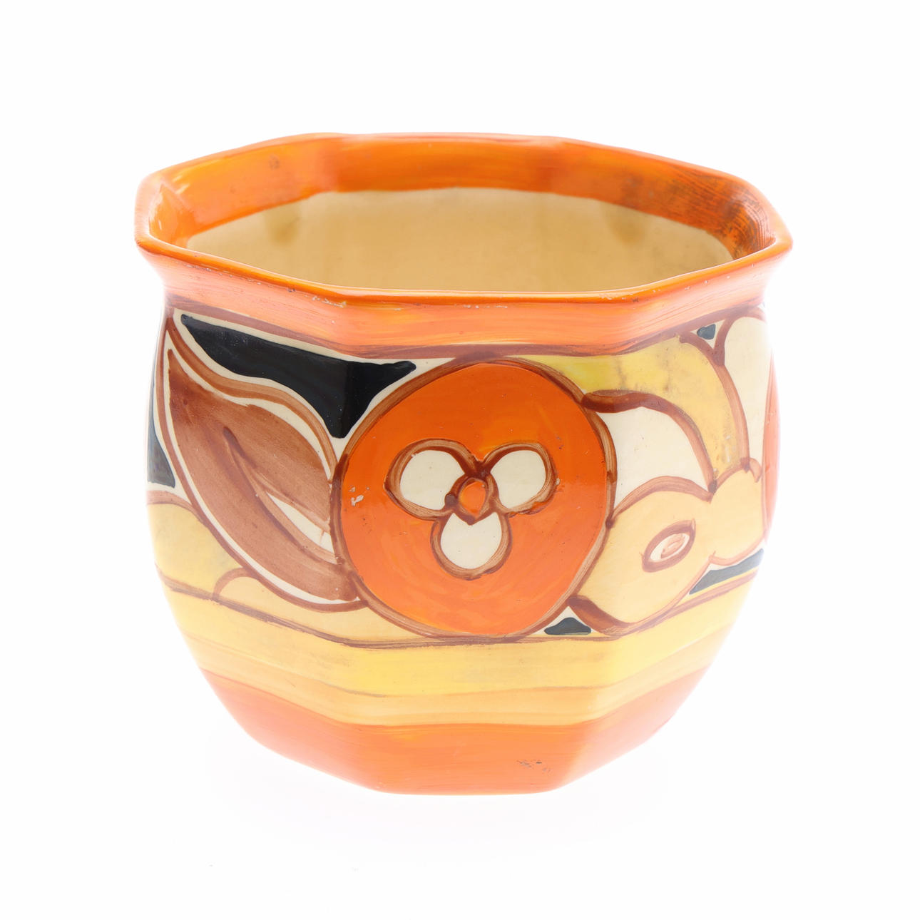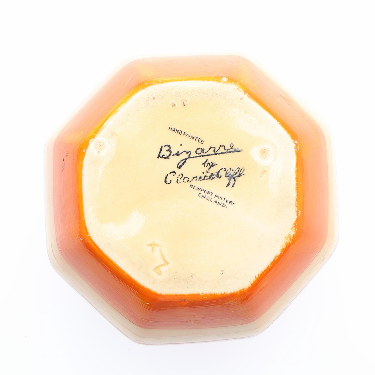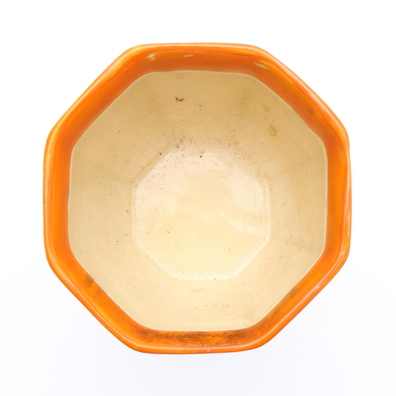 Newport Pottery, of octagonal form, painted with a band of sliced oranges and foliate decoration in oranges, yellows, browns, and black, printed mark to base, H.8.5 x W.10cm.