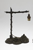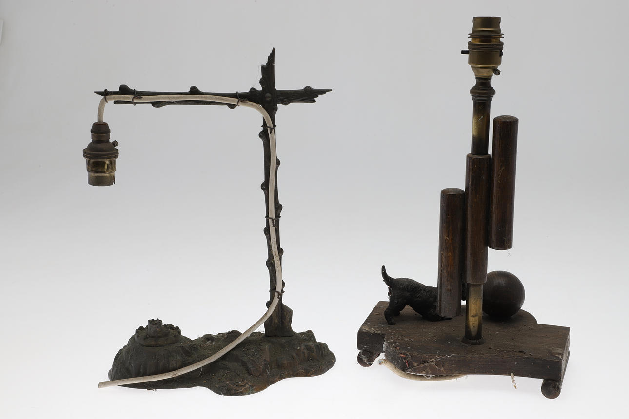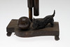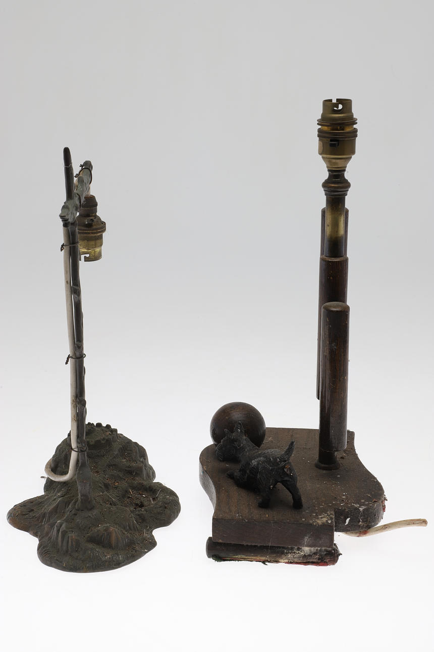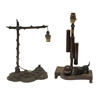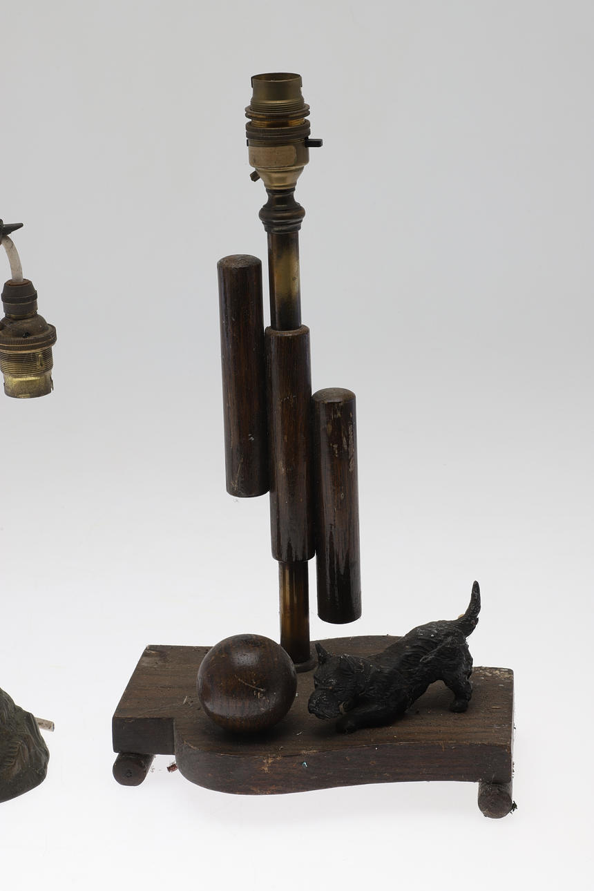 Comprising a wood and brass Art Deco example with terrier chasing a ball and a patinated spelter example, larger H37cm (2).