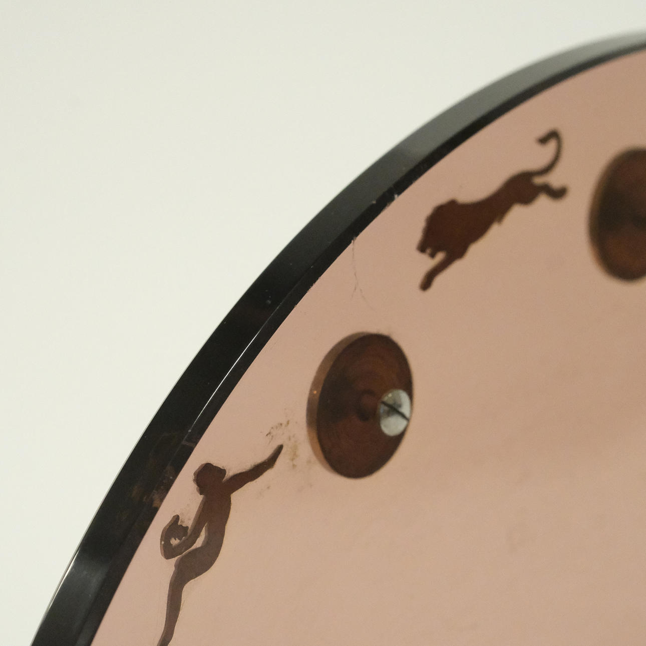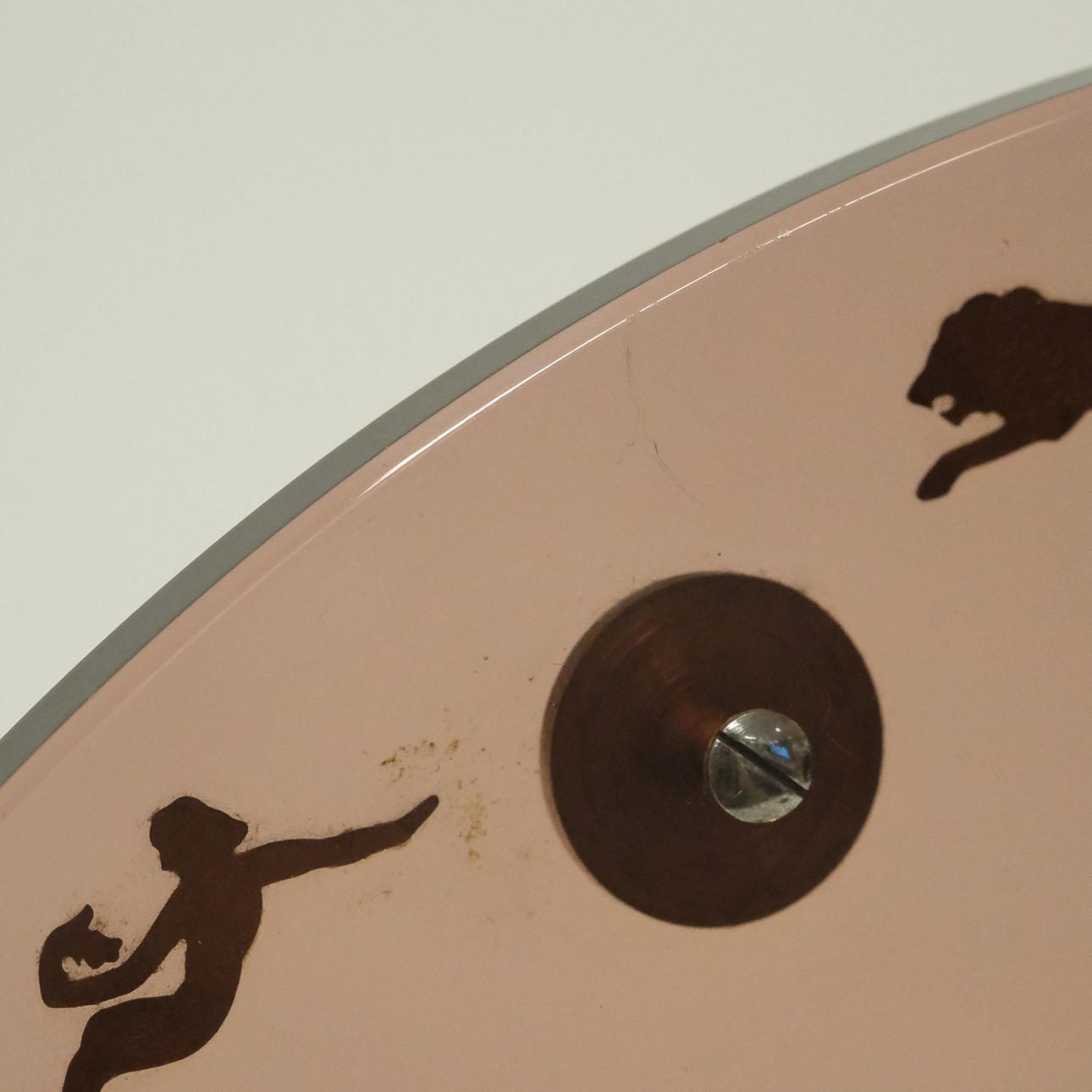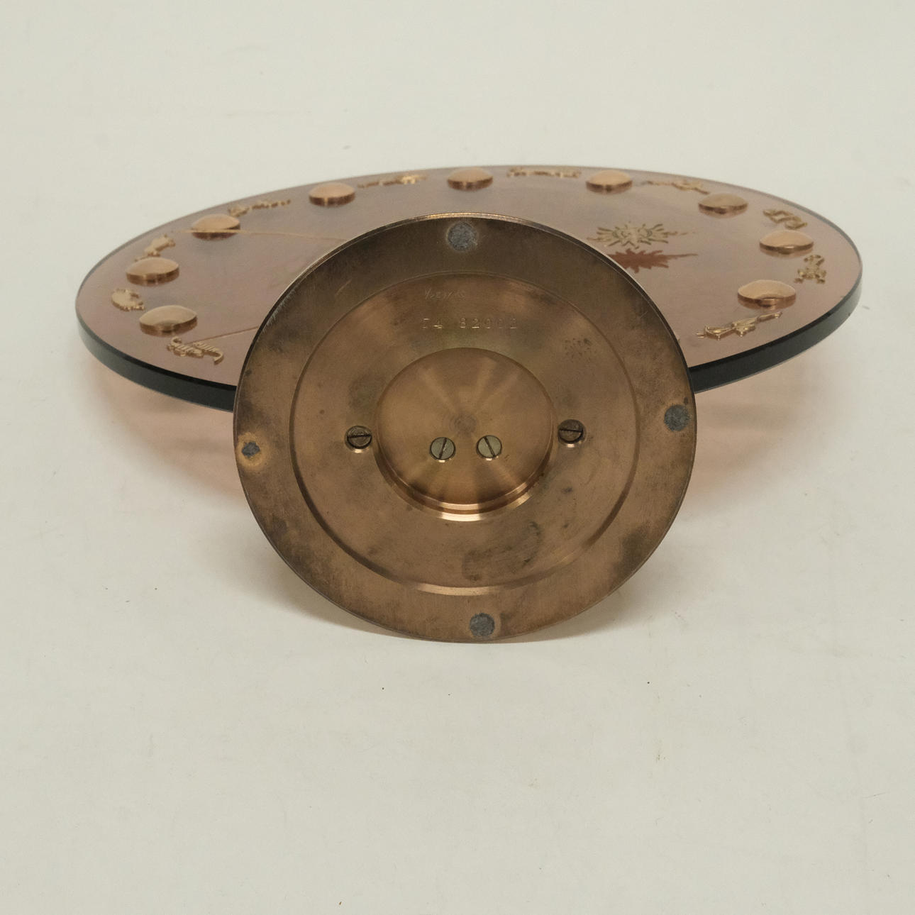 Circular dial of pale violet glass with dial, index, decorative zodiac sign and base of metal, case no. 469440, foot with number Z4 82002, mid 20th century, height approx. 24 cm.