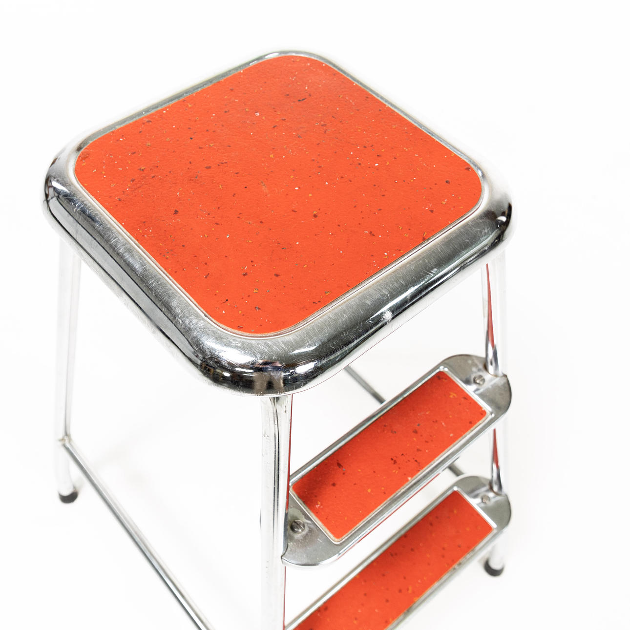 Industrial model, frame in chromed metal, steps covered in red linoleum, label marked, height 59 cm.