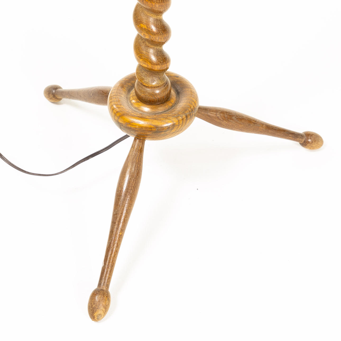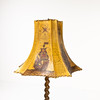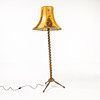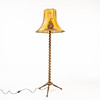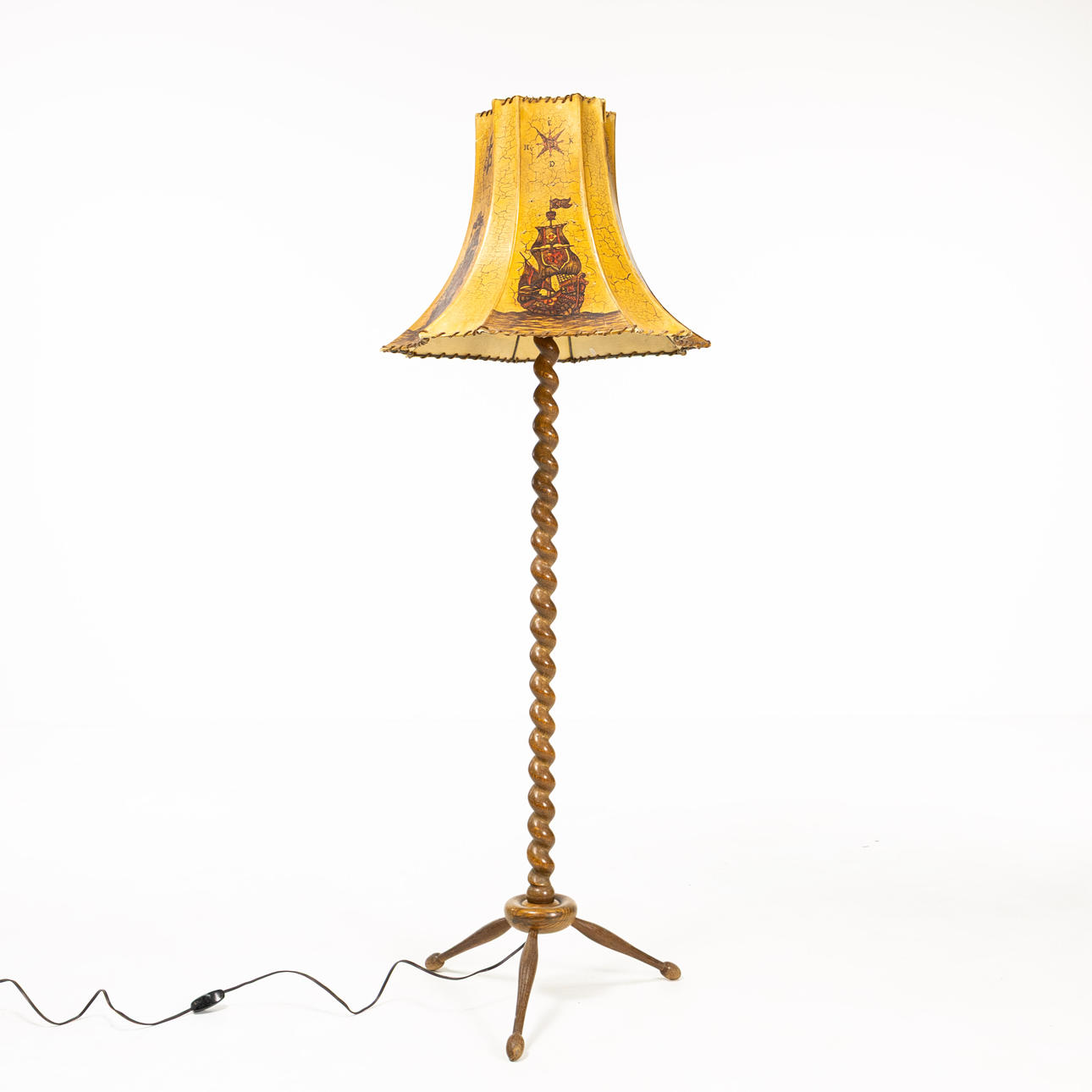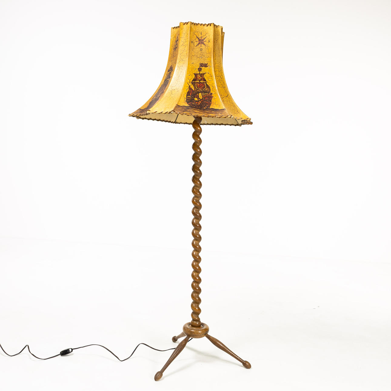 Twisted, turned base in brown-stained oak, parchment shade with sailing ship decoration, height 150 cm, ungrounded wiring.