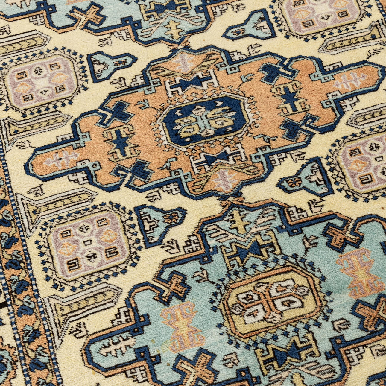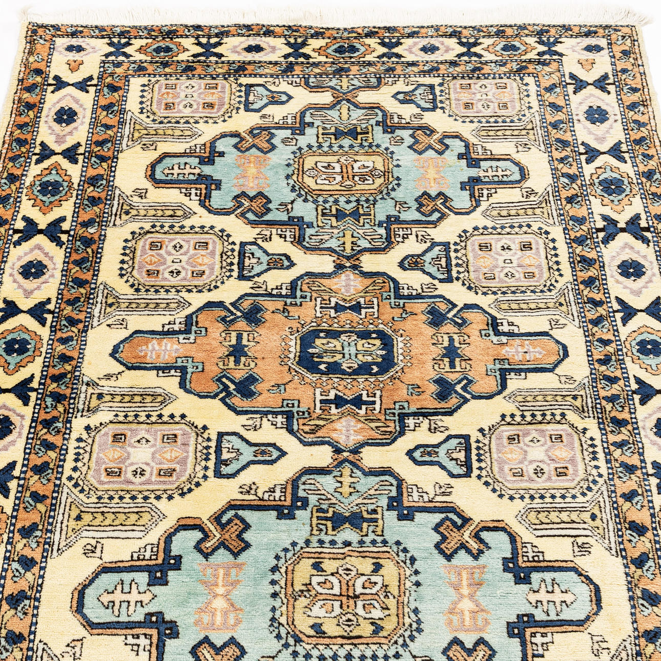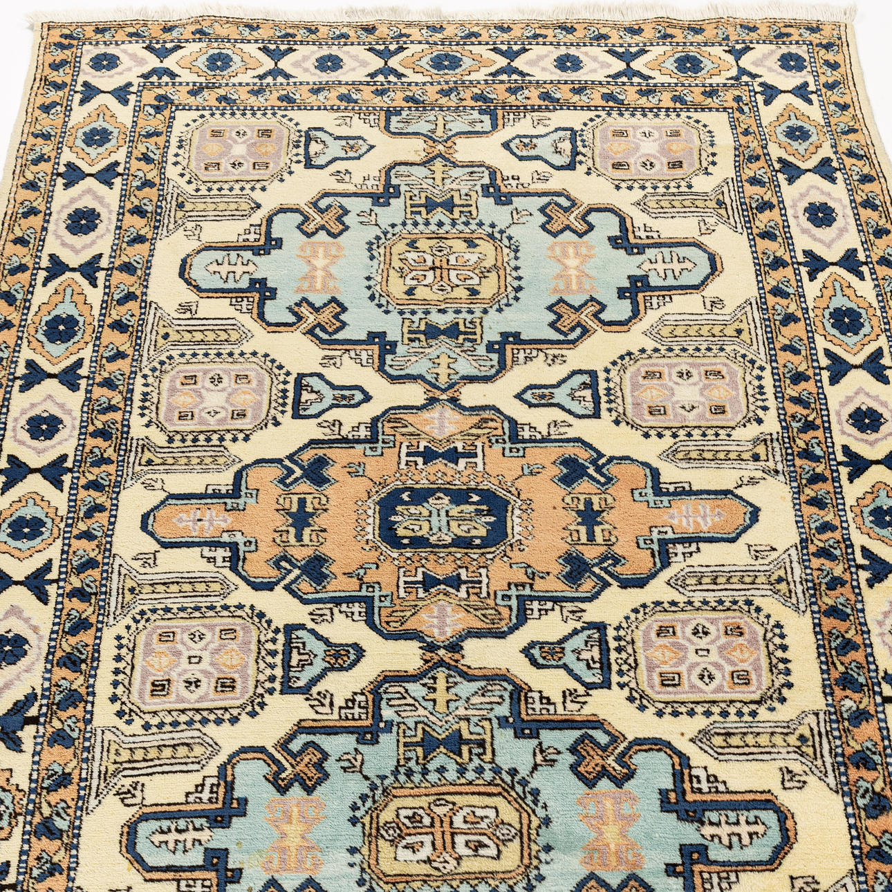 Light ground, central medallion in blue and red. Dimensions approx. 186 x 138 cm.