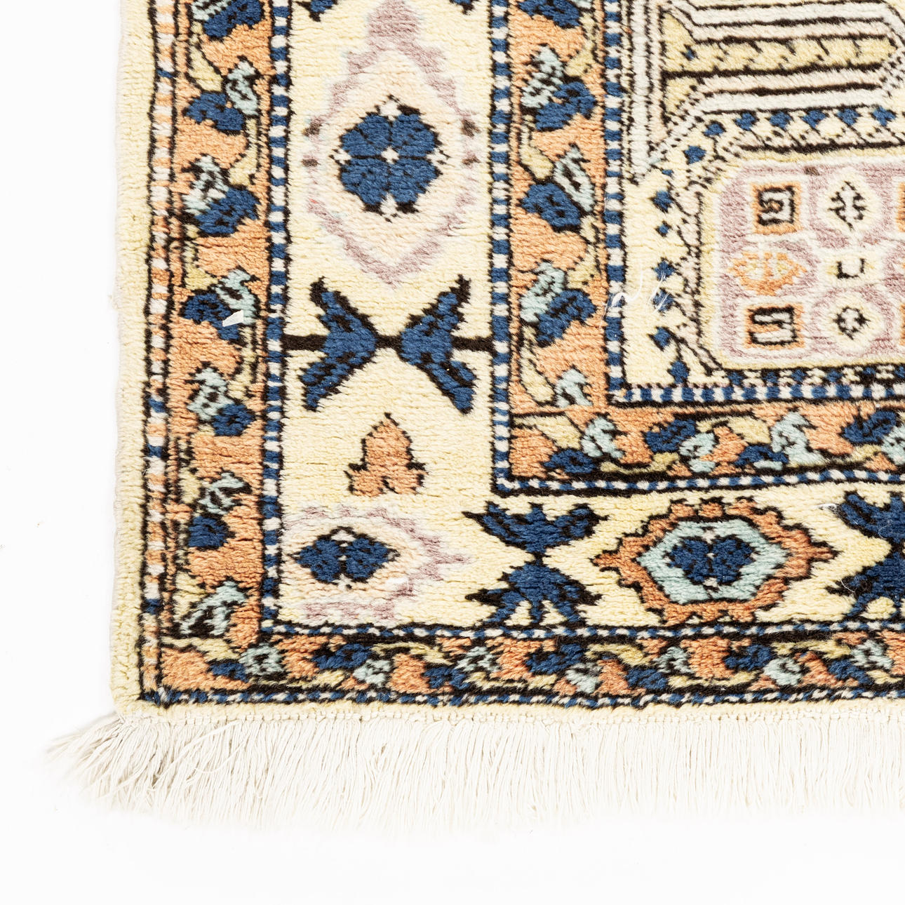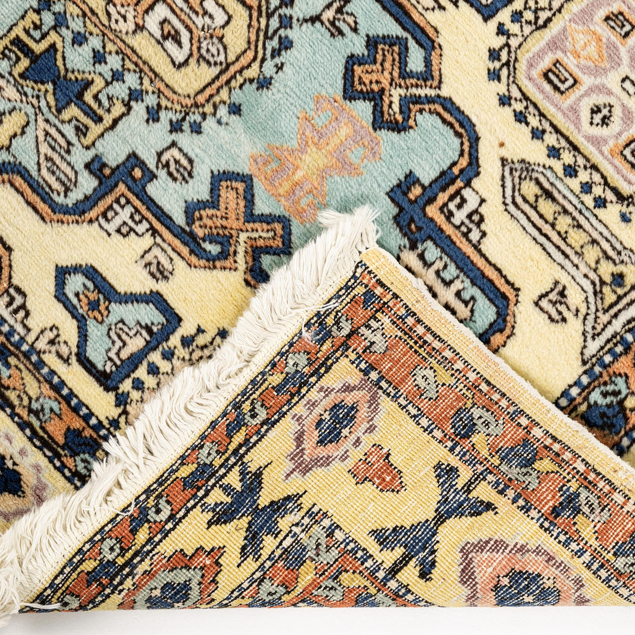 Wear from use. Stains. Fringes with heavier wear in places.