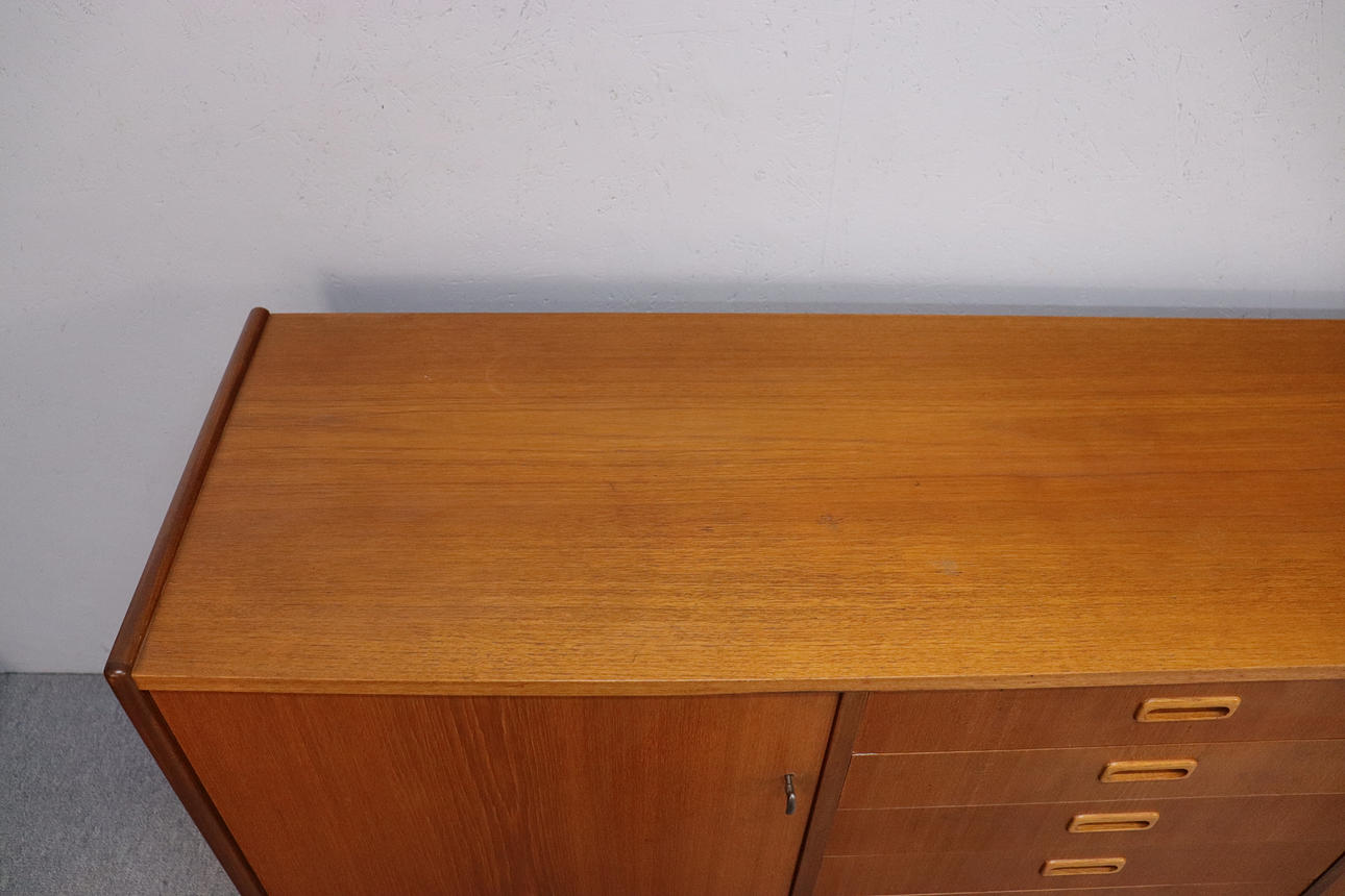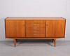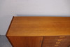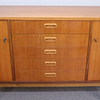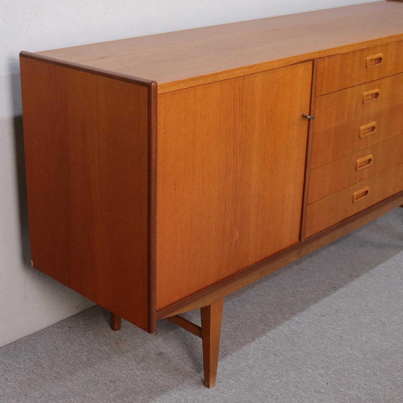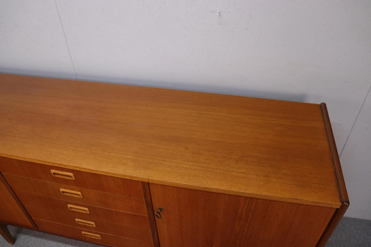 Veneer with teak, on legs of stained beech. Central section with five drawers flanked by each cabinet door with a rear shelf.