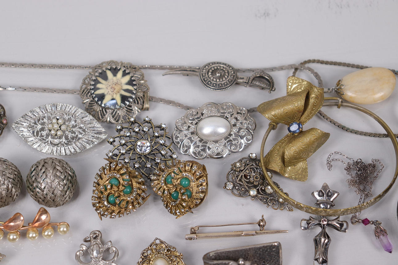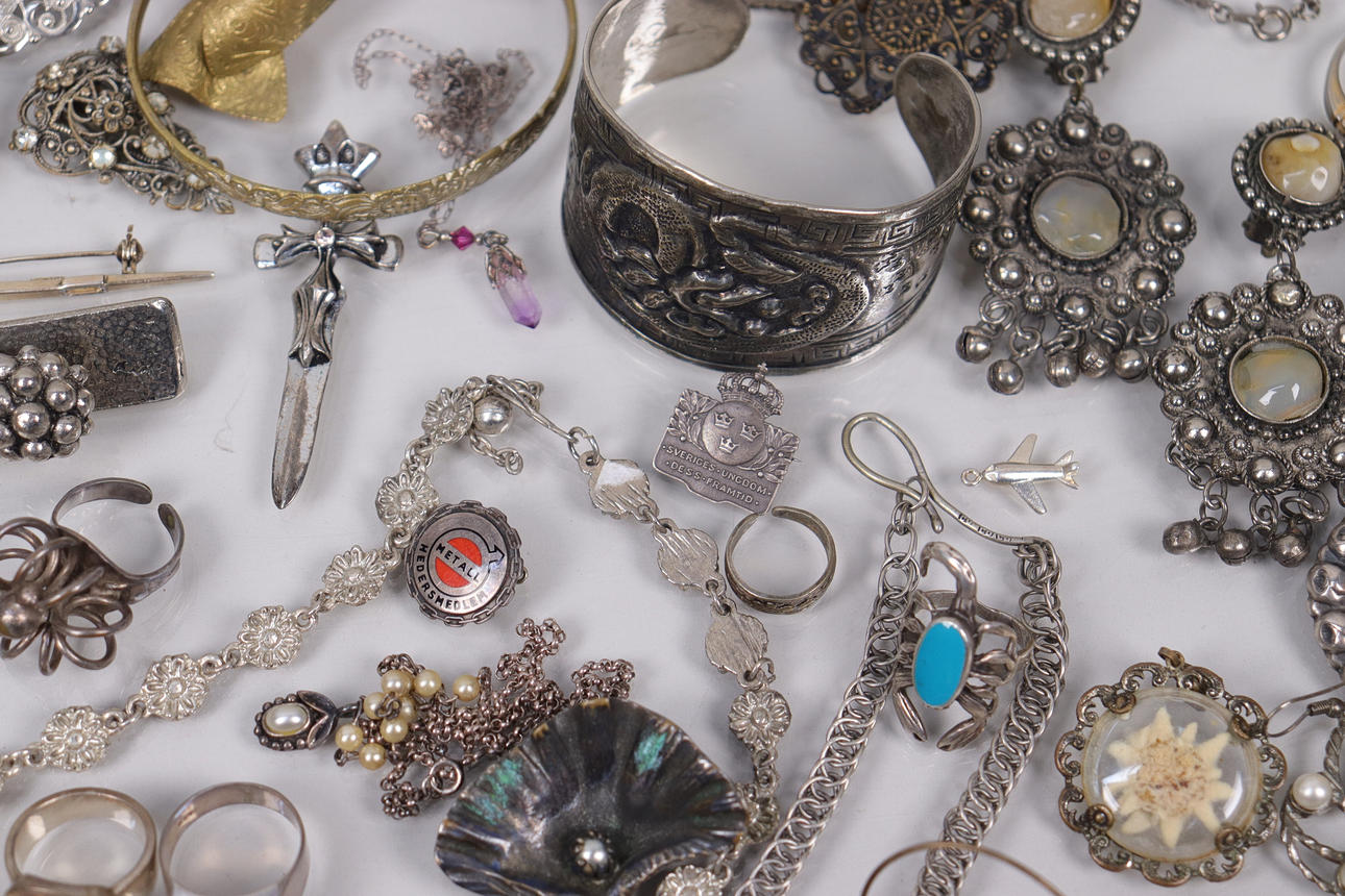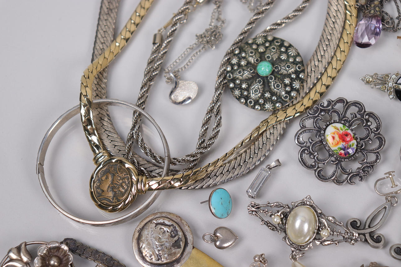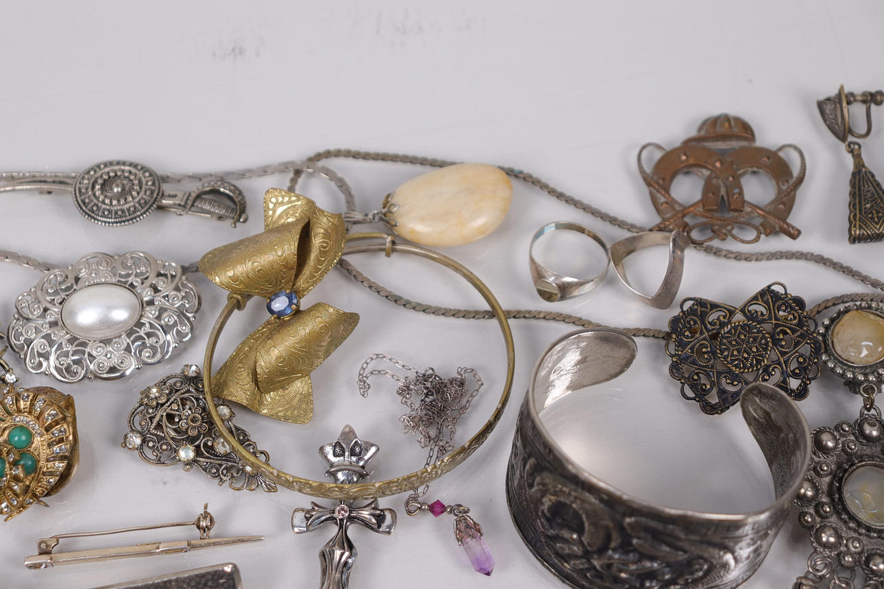 Various jewelry, necklaces, bracelets, earrings, borsches etc., silver are present.