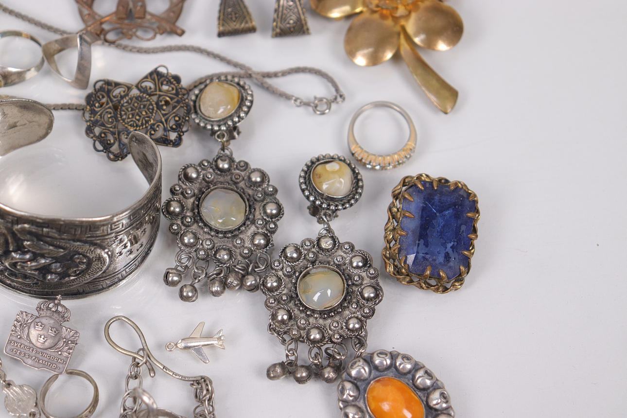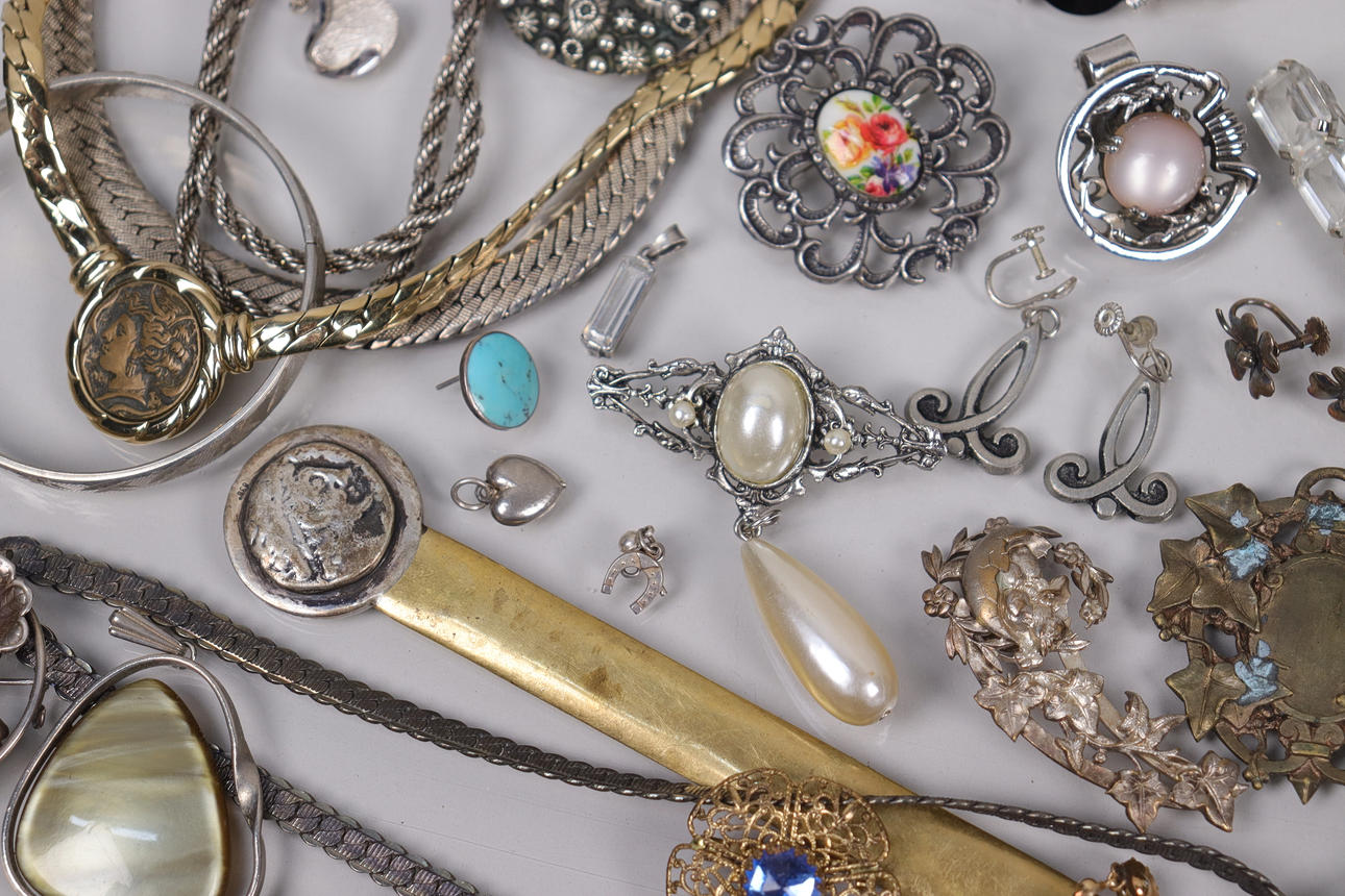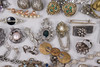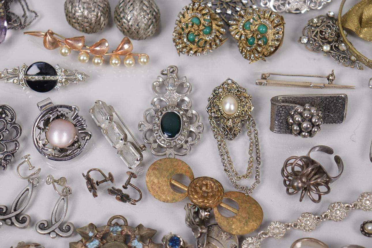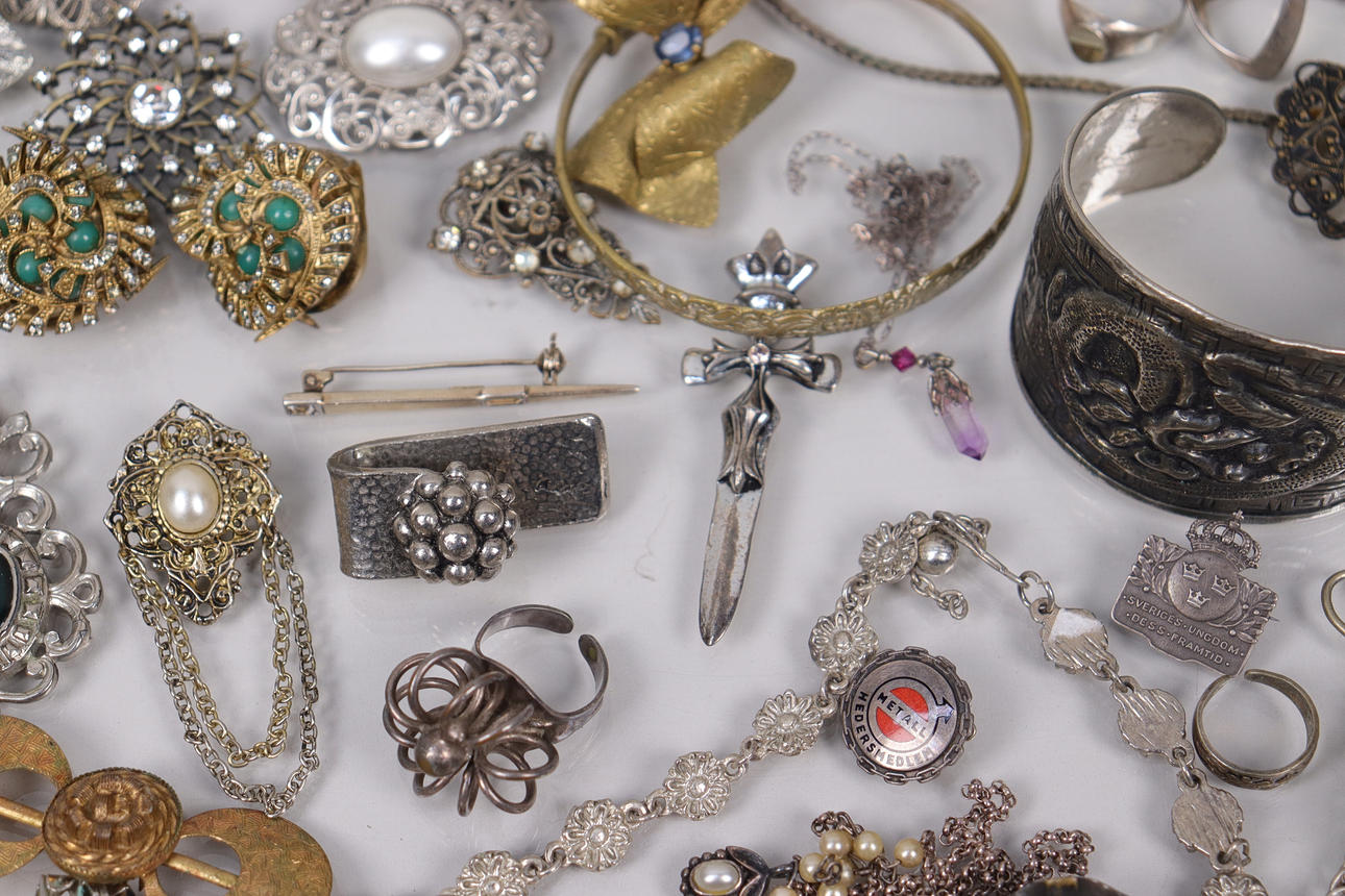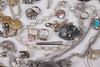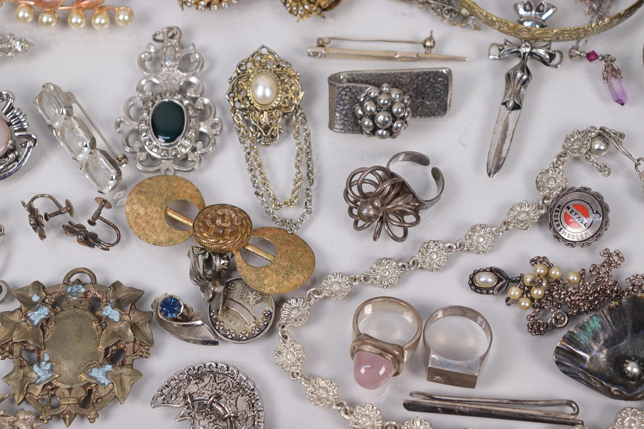 Various jewelry, necklaces, bracelets, earrings, borsches etc., silver are present.