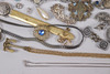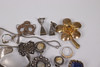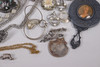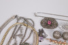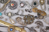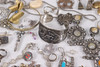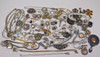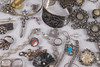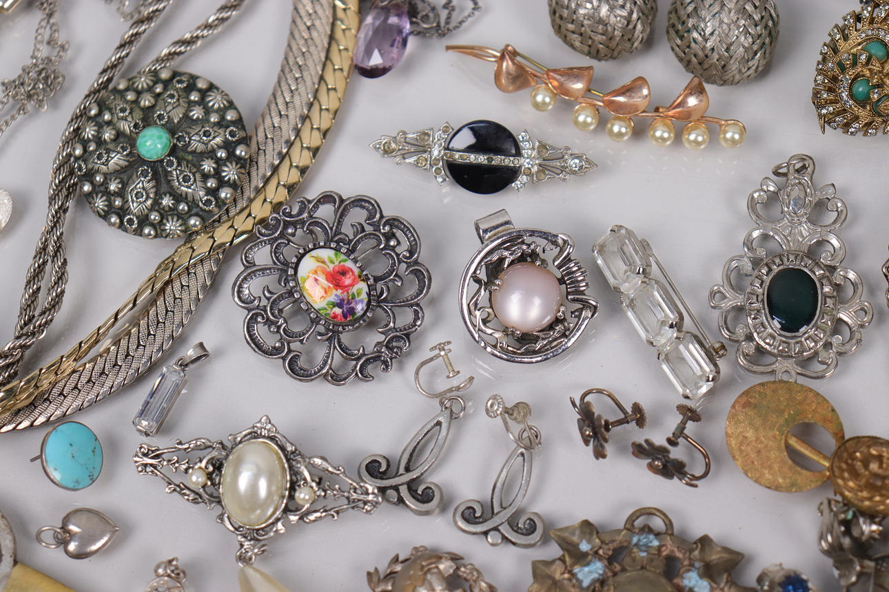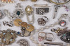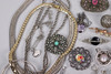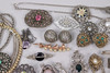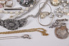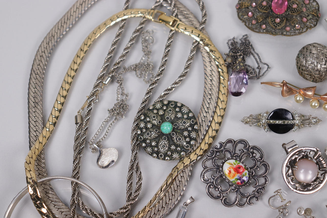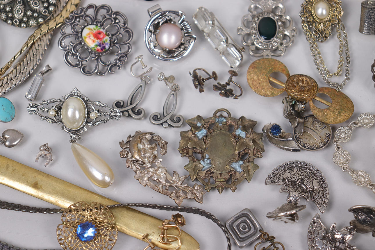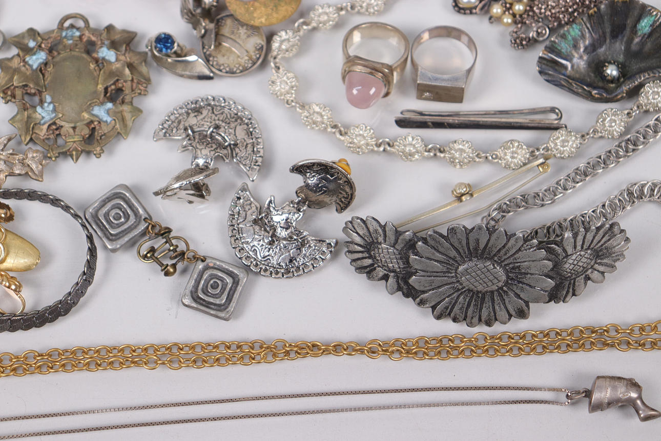Various jewelry, necklaces, bracelets, earrings, borsches etc., silver are present.