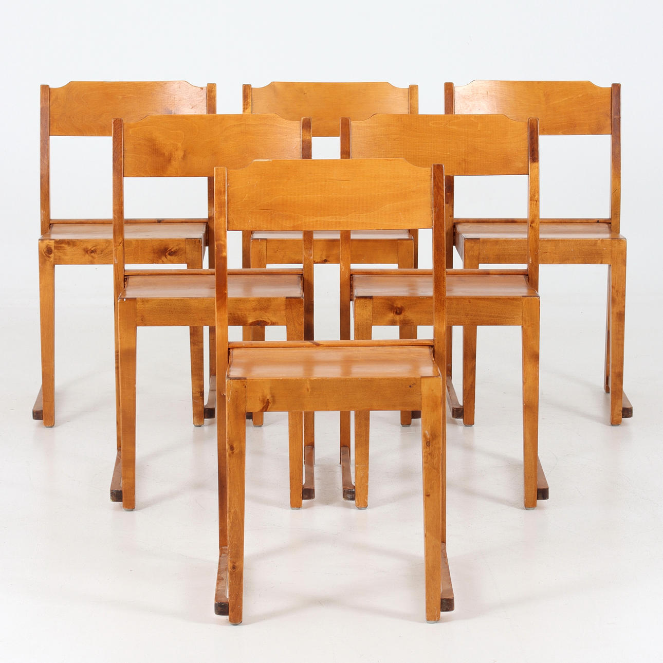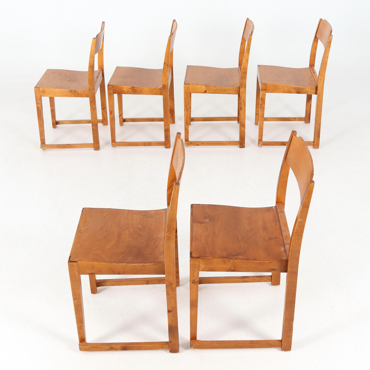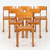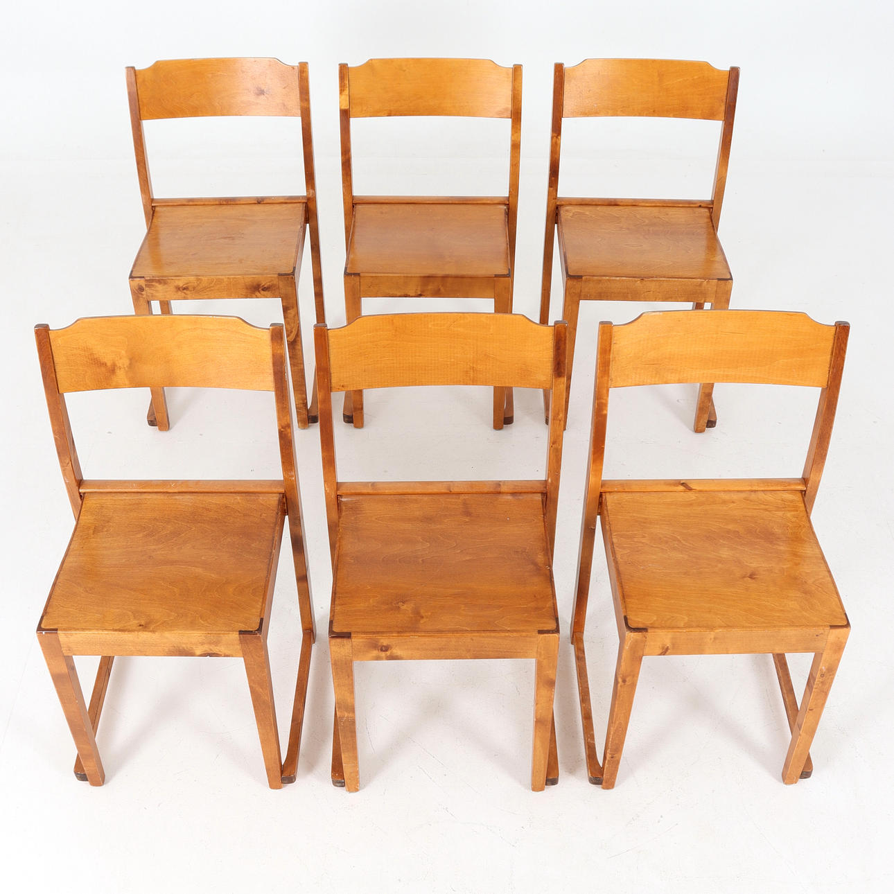 Chairs. Stained birch. Stackable in classic orchestra model. 20th century.