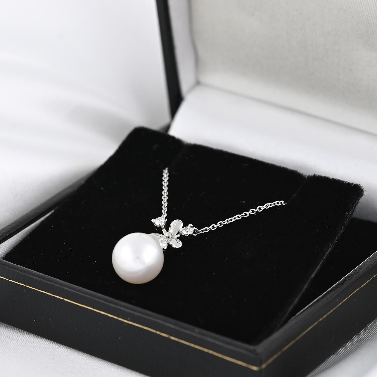 A white gold necklace with integral pendant set with pearl and diamonds, with gifting box