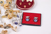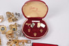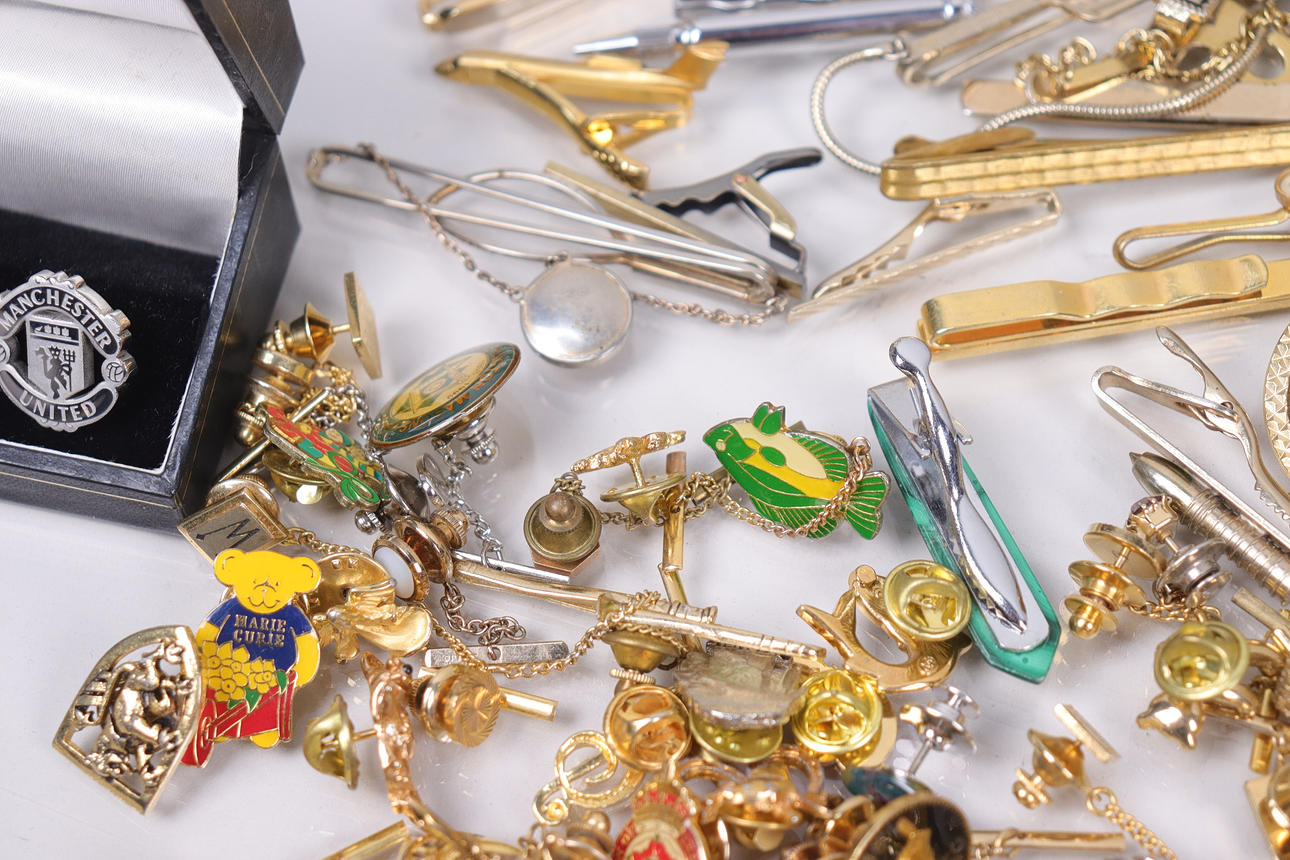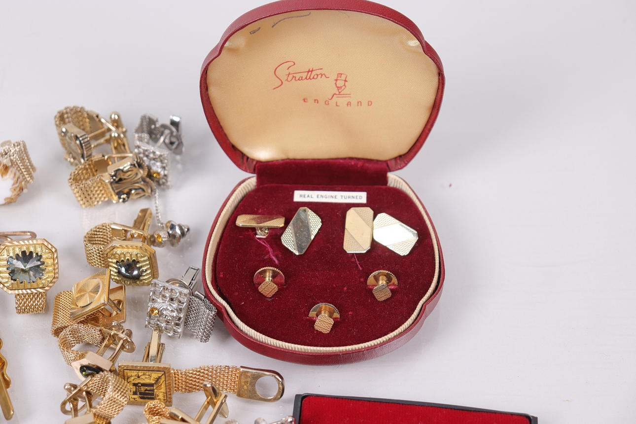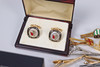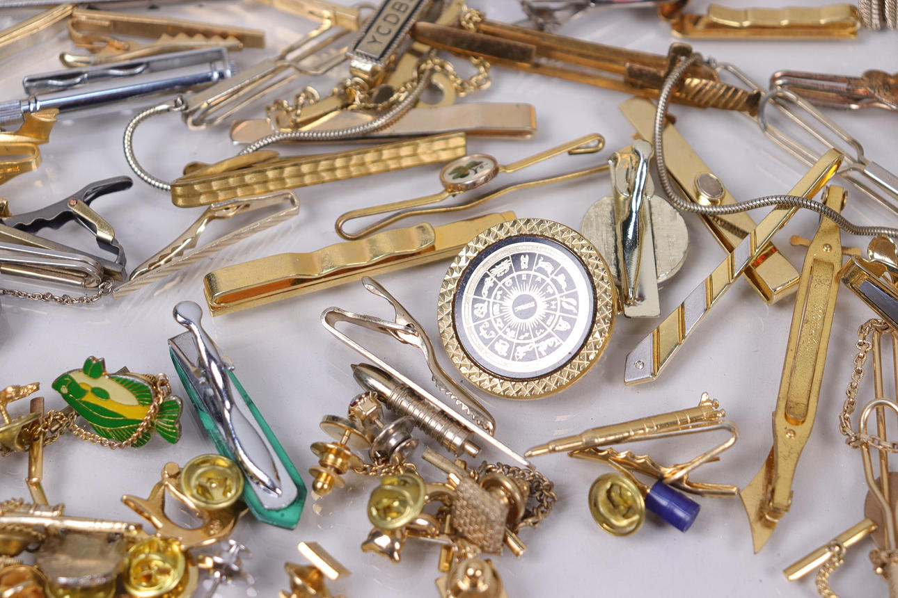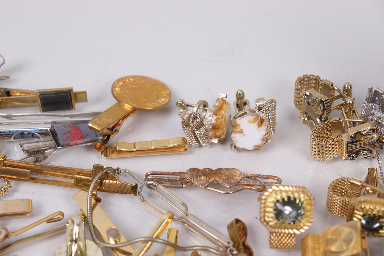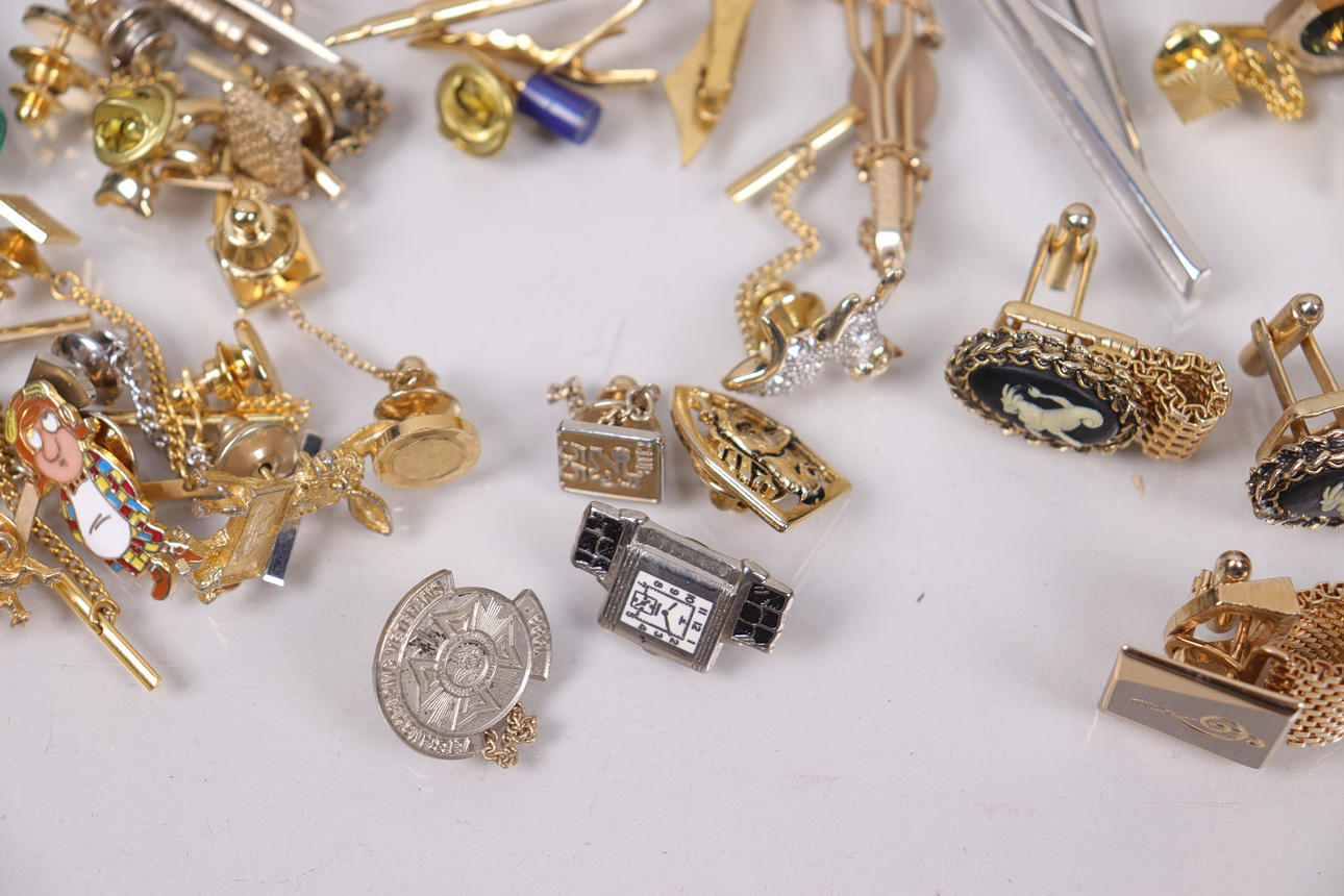 Assorted cufflinks and tie clips.