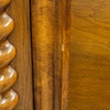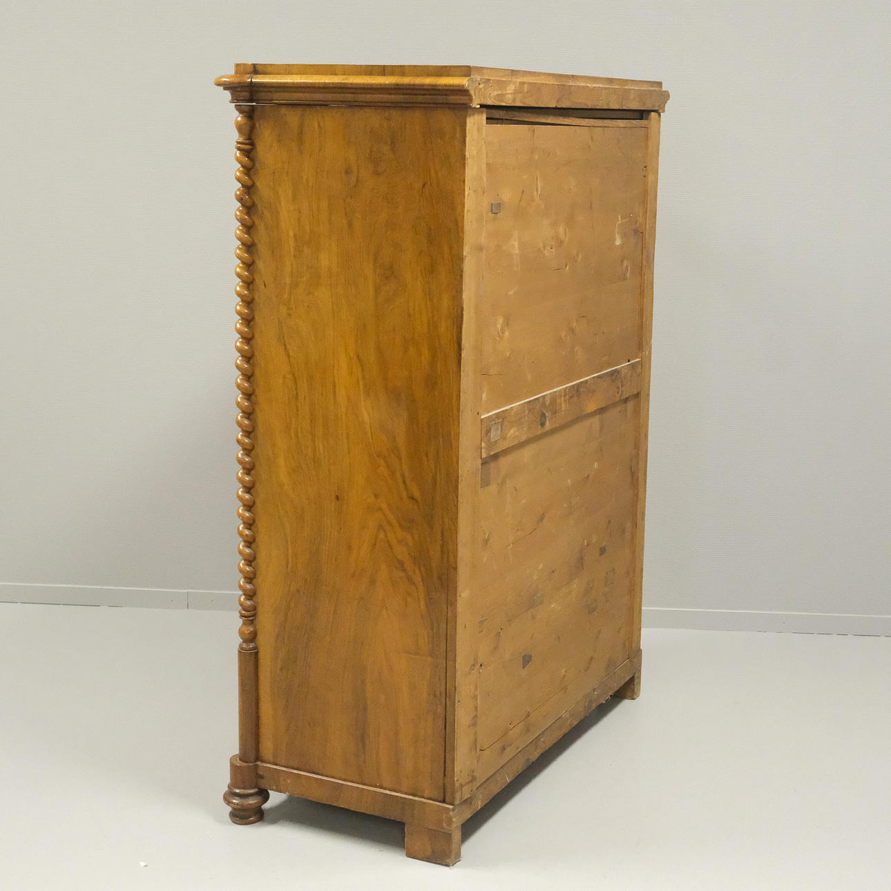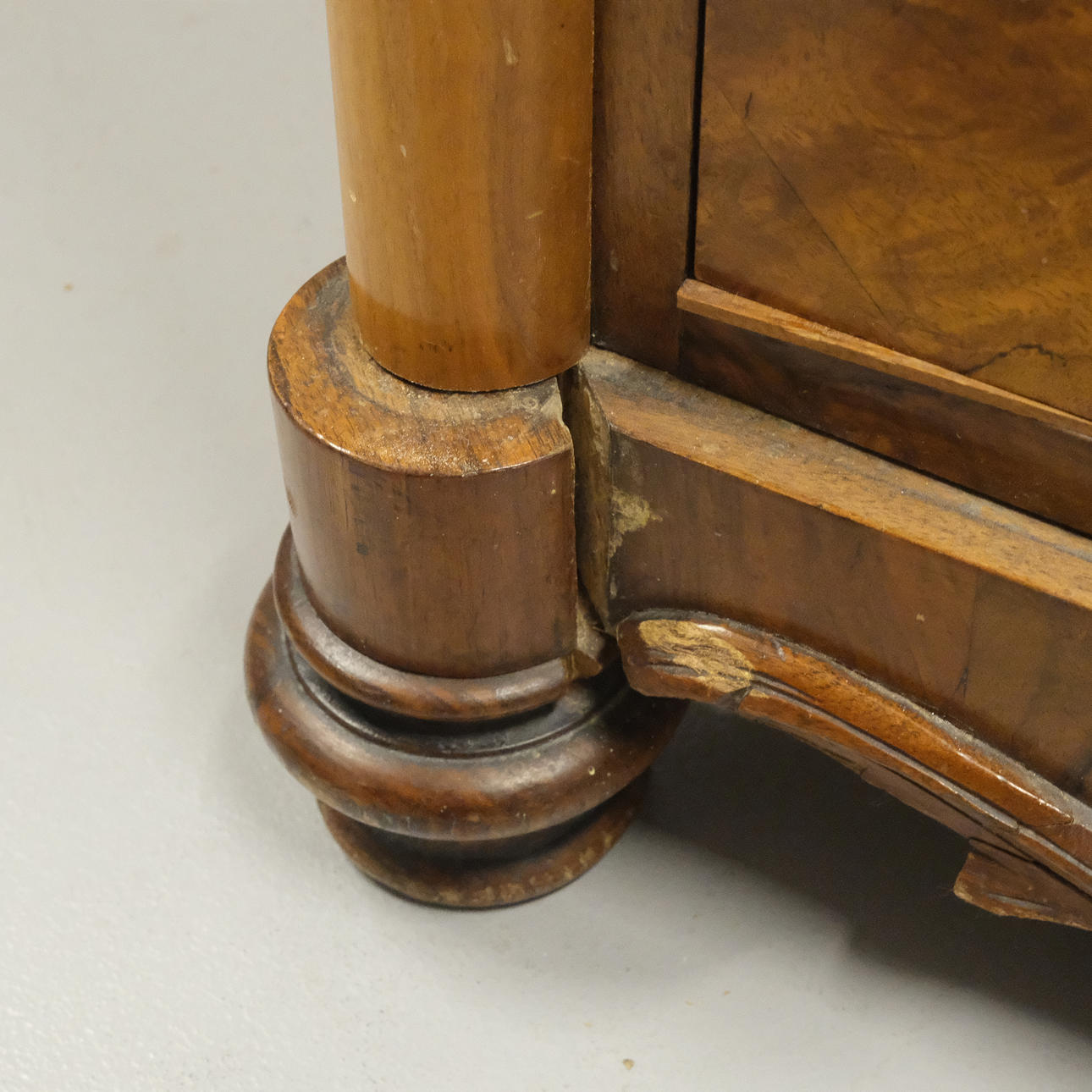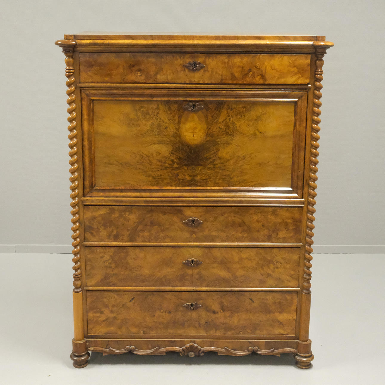 Use- and age-related wear. Scratches, marks. One front leg loose/repaired. Key missing. Door/fall-front locked.